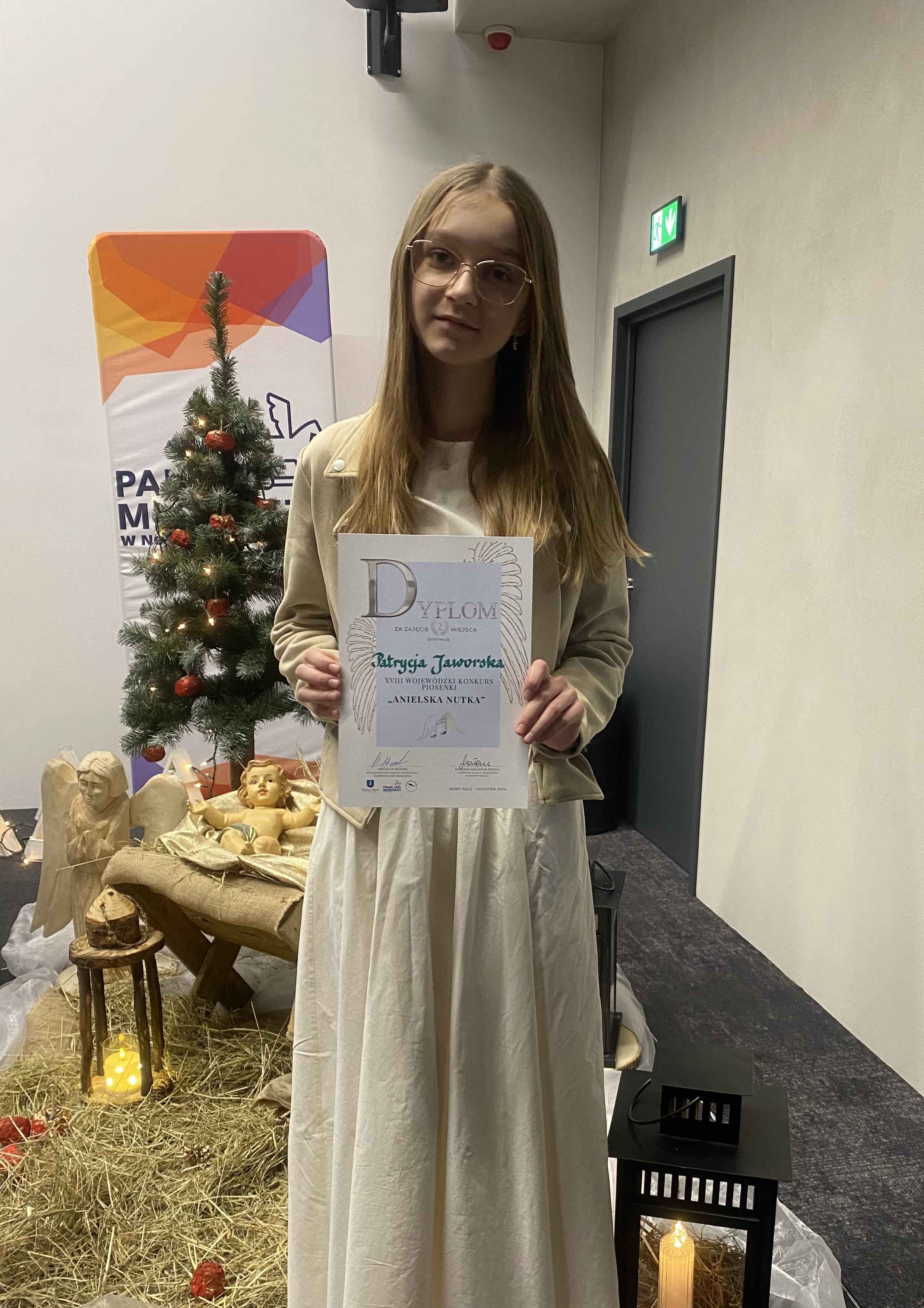 Dnia 10 grudnia Patrycja Jaworska braÅ‚a udziaÅ‚ w XVIII wojewódzkim konkursie piosenki Anielska Nutka, w którym zdobyÅ‚a II miejsce w kategorii wiekowej 12-13 lat. Natomiast 13 grudnia Patrycja braÅ‚a udziaÅ‚ w IV MiÄ™dzyszkolnym Konkursie KolÄ™d i PastoraÅ‚ek „Gore Gwiazda Jezusowi” organizowanym przez NiepublicznÄ… Szkołę PodstawowÄ… SpecjalnÄ… „Zielony ZakÄ…tek” w Limanowej gdzie zdobyÅ‚a NagrodÄ™ Jury za wykonanie kolÄ™dy „NarodziÅ‚eÅ› siÄ™ - Cicha Noc”. Gratulujemy!
