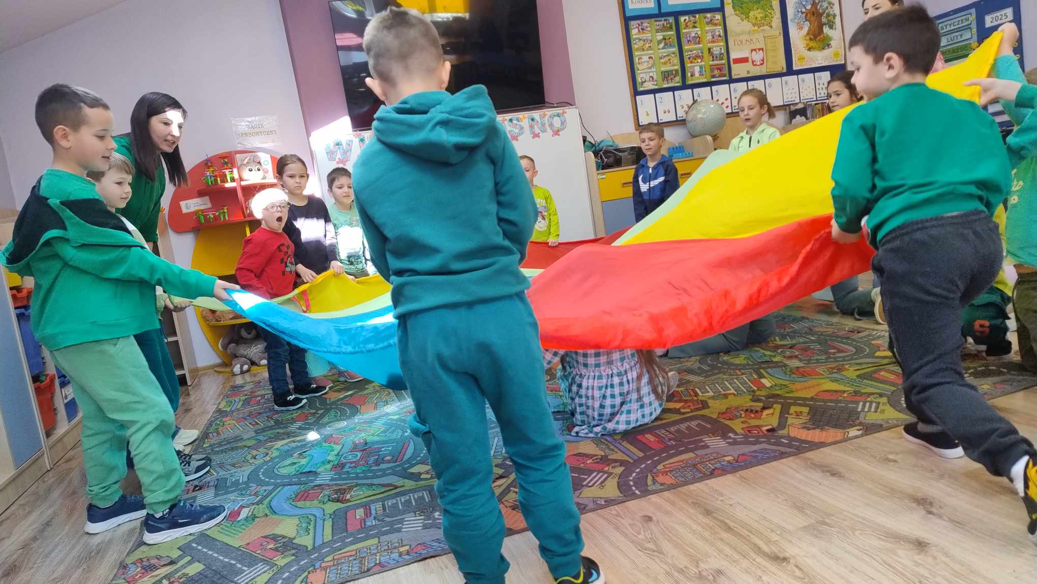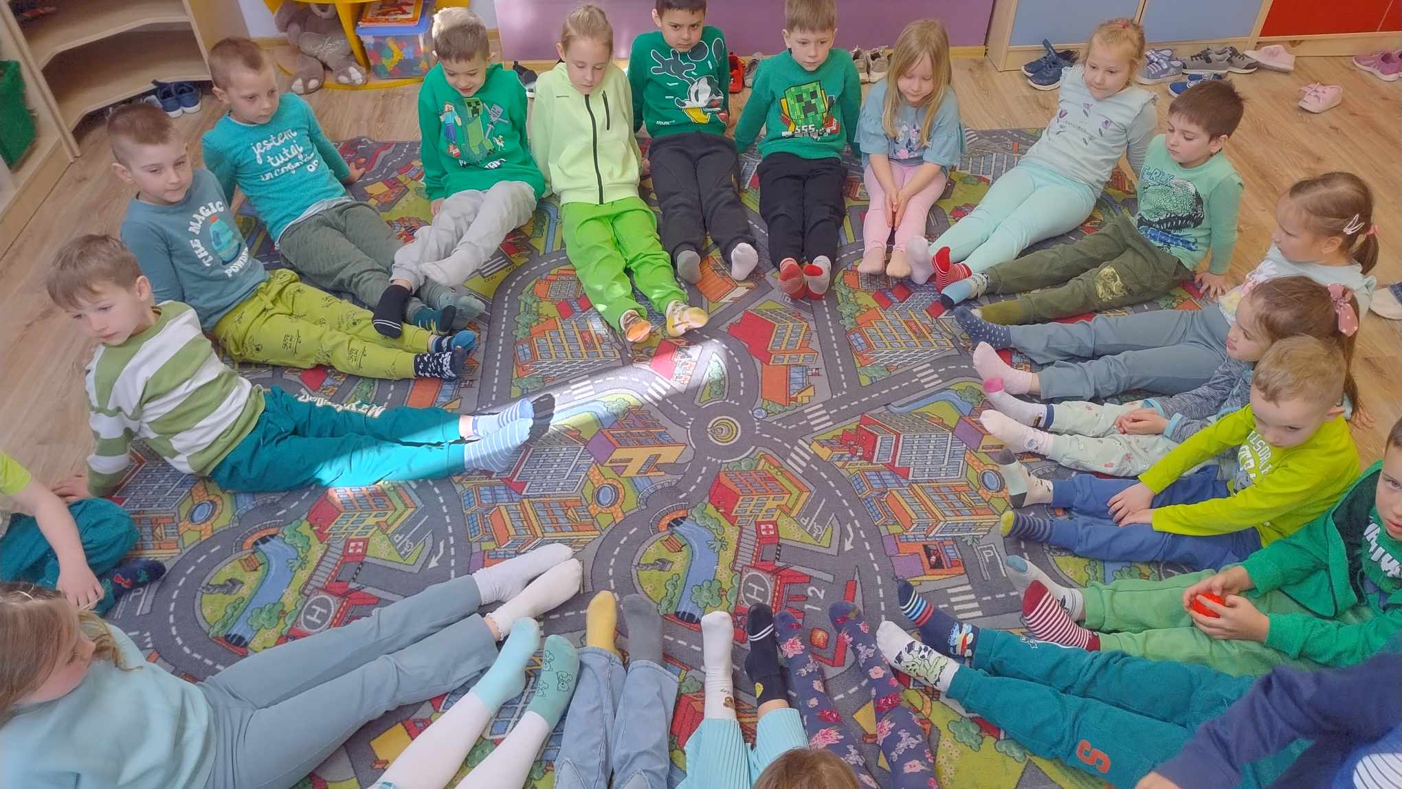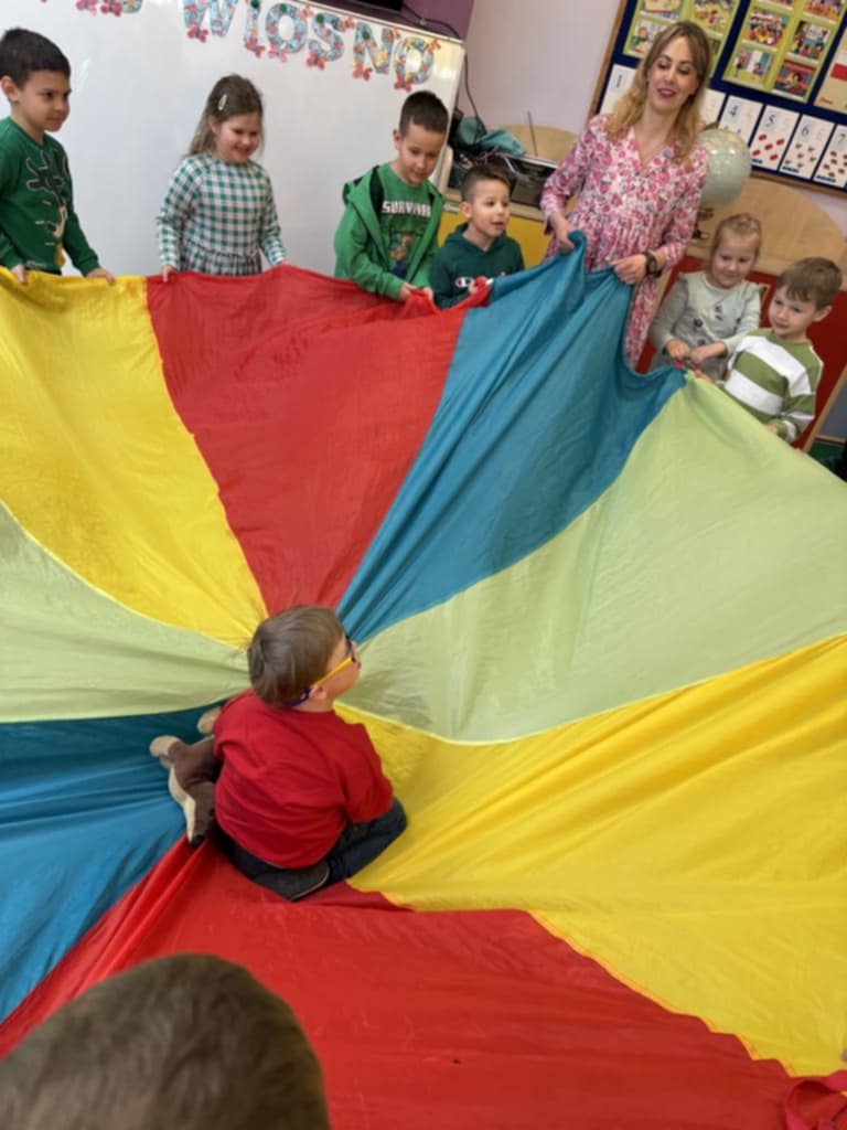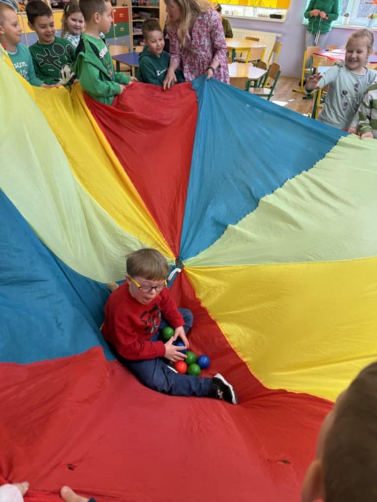 21 marca w naszej szkole byÅ‚ obchodzony Åšwiatowy DzieÅ„ Osób z ZespoÅ‚em Downa. ZaprosiliÅ›my z tej okazji do zabawy w przedszkolu Frania Dziedzica. WniósÅ‚ on do grupy wiele radoÅ›ci. Wspólnie ze starszakami przywitaliÅ›my Franka i jego mamÄ™ piosenkÄ… ,,Witaj Franiu jak siÄ™ masz". NastÄ™pnie odbyÅ‚a siÄ™ zabawa z chustÄ… Klanzy. Później dzieci pokazaÅ‚y kolorowe skarpety, nauczycielki wytÅ‚umaczyÅ‚y dlaczego w tym dniu jest ważne, by zaÅ‚ożyć skarpety w różnych kolorach. Franiu sprawdziÅ‚ każdemu skarpety. Potem dzieci wzięły udziaÅ‚ w Å›cieżce sensorycznej, która skÅ‚adaÅ‚a siÄ™ z różnych elementów: ziemi, kukurydzy, mchu, liÅ›ci, gałązek, wody. Ostatnim elementem tego dnia, byÅ‚o wykonanie pracy plastycznej- kolorowej skarpety z różnych faktur (Å›cinek z materiaÅ‚u). Po udanej zabawie wszyscy udali siÄ™ na obiad, a Franek miaÅ‚ jeszcze okazjÄ™ zwiedzić naszÄ… szkołę. Dzieci ze Å›wietlicy przygotowaÅ‚y dla niego gniotka sensorycznego, z którego bardzo siÄ™ ucieszyÅ‚. Mamy nadziejÄ™, że Franek bÄ™dzie dobrze wspominaÅ‚ dzieÅ„ w naszej szkole.