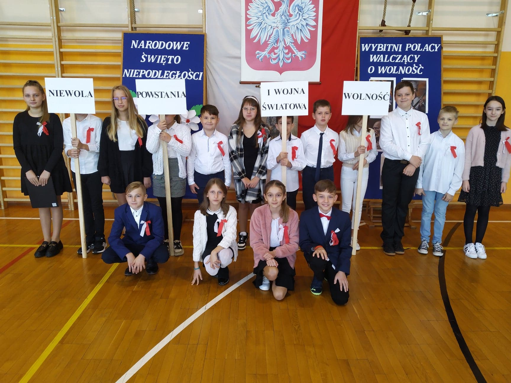 NastÄ™pnie uczniowie klas V i VI zaprezentowali montaż sÅ‚owno – muzyczny, podczas którego krótko przedstawili historiÄ™ Polski - od powstania paÅ„stwa Polskiego, aż po dzieÅ„, w którym to odzyskaliÅ›my niepodlegÅ‚ość.