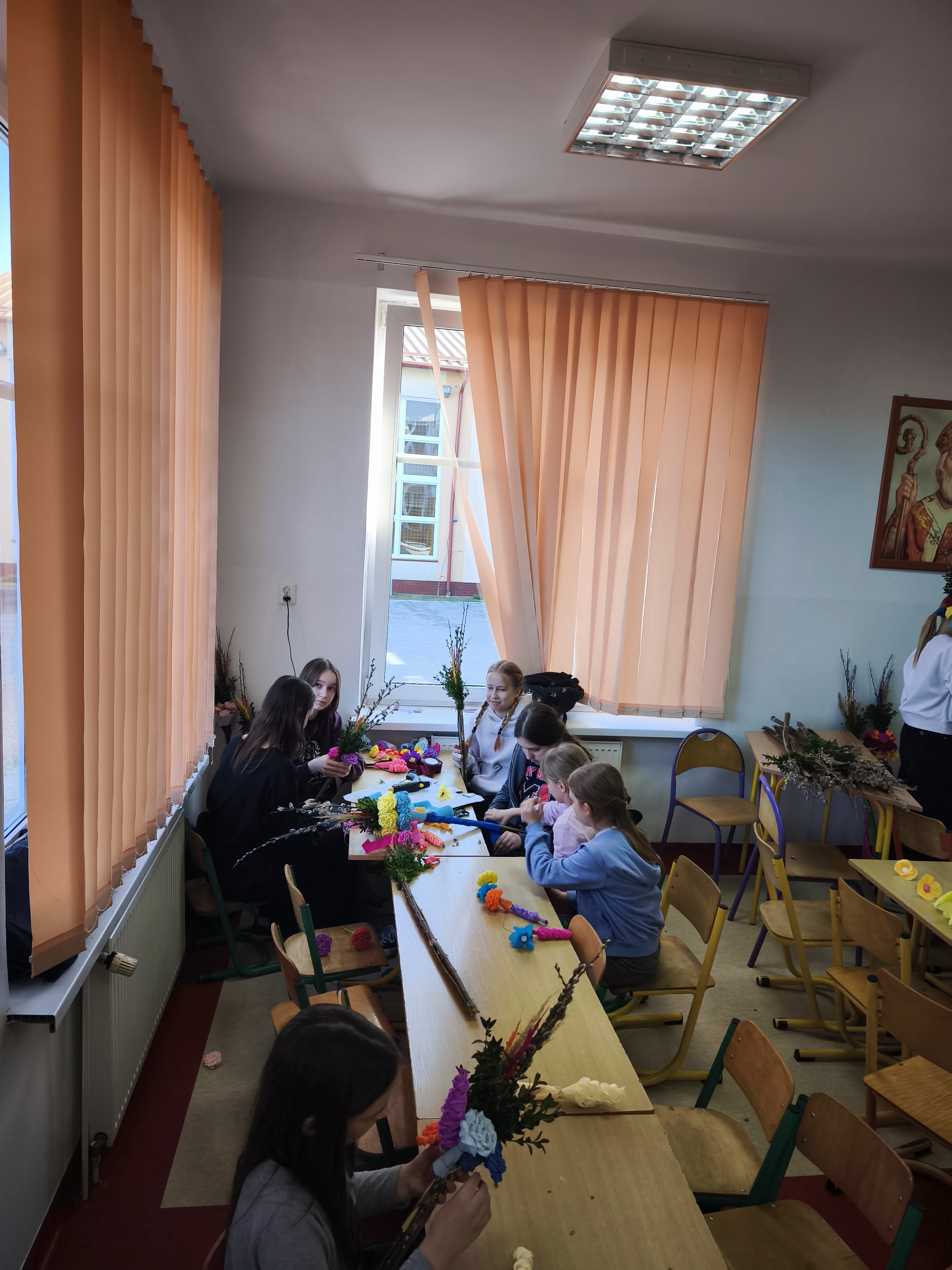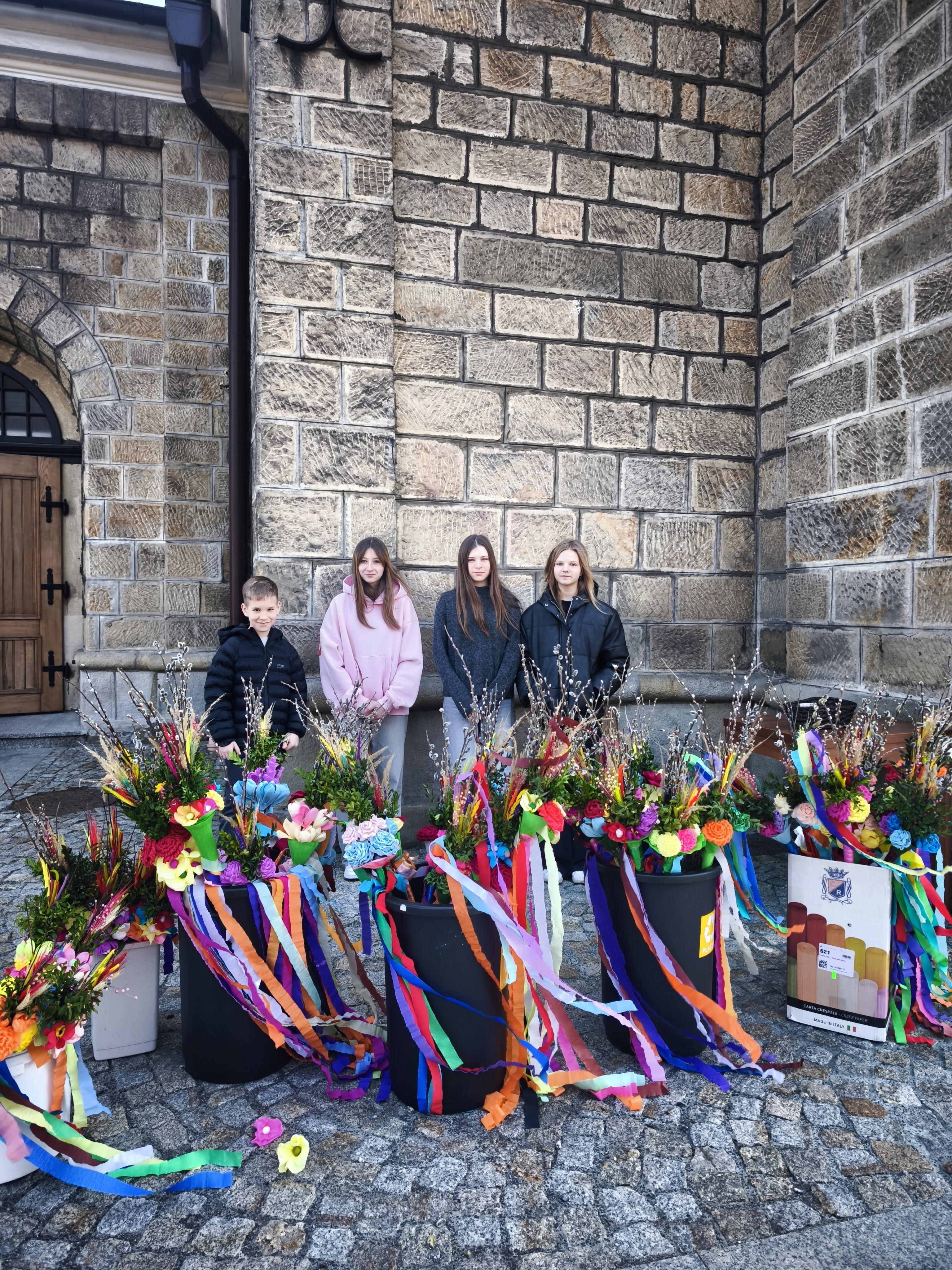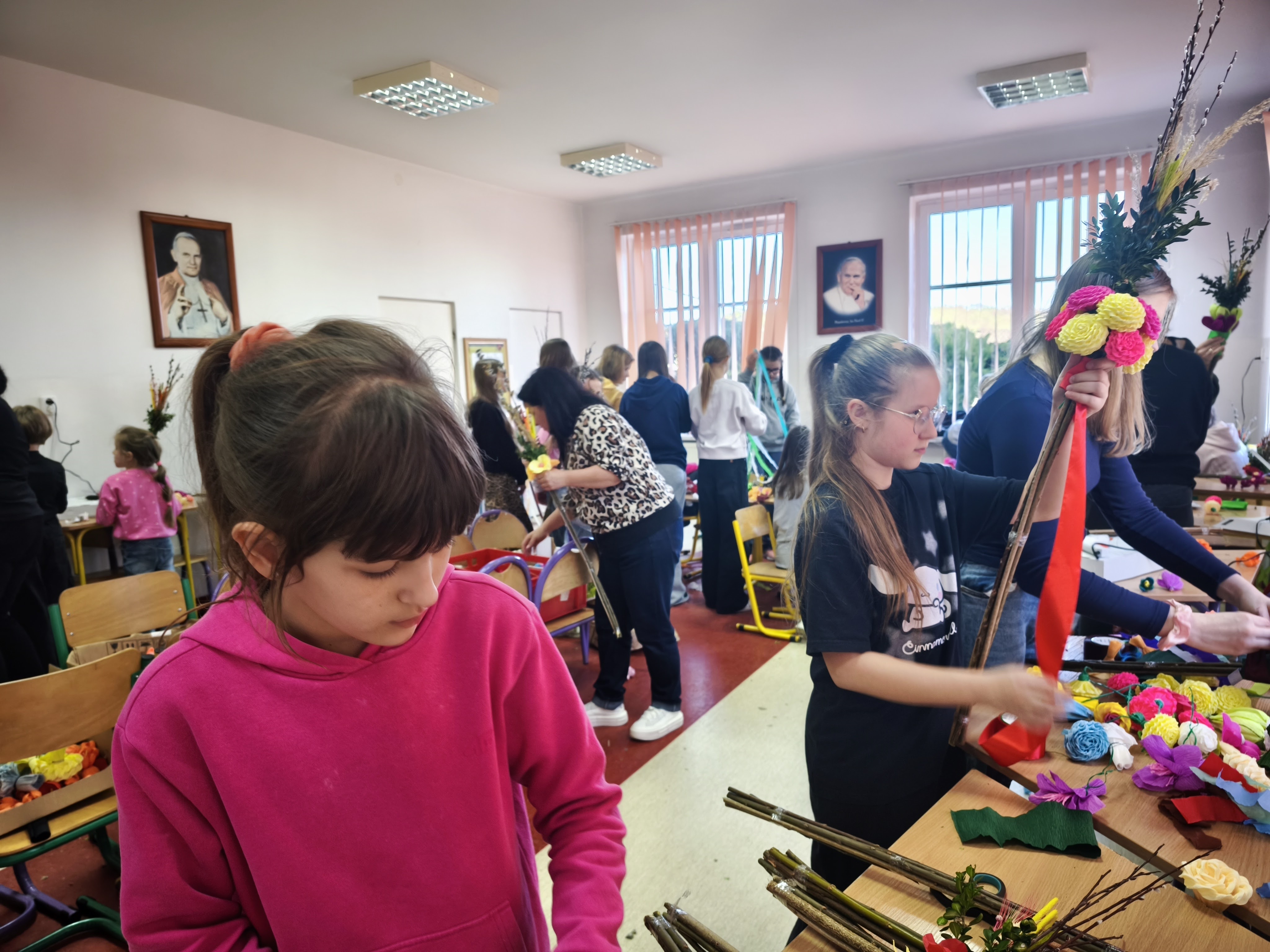 Niedzielny kiermasz był owocem ogromnego zaangażowania i wielotygodniowej pracy. Przez cały okres Wielkiego Postu nasi uczniowie cierpliwie i z wielką precyzją wykonywali dziesiątki kolorowych kwiatów z krepiny, zbierali bazie i trawy.