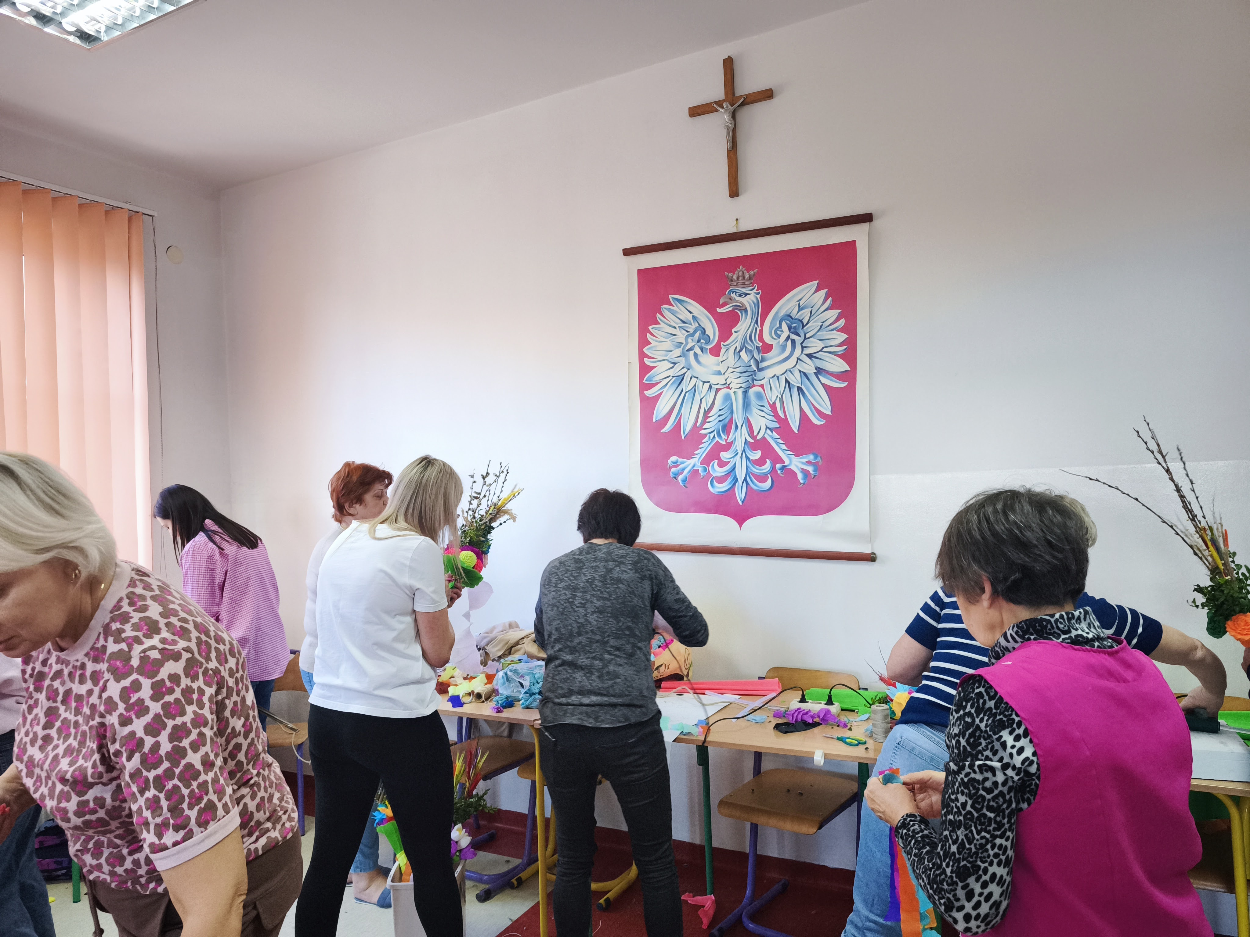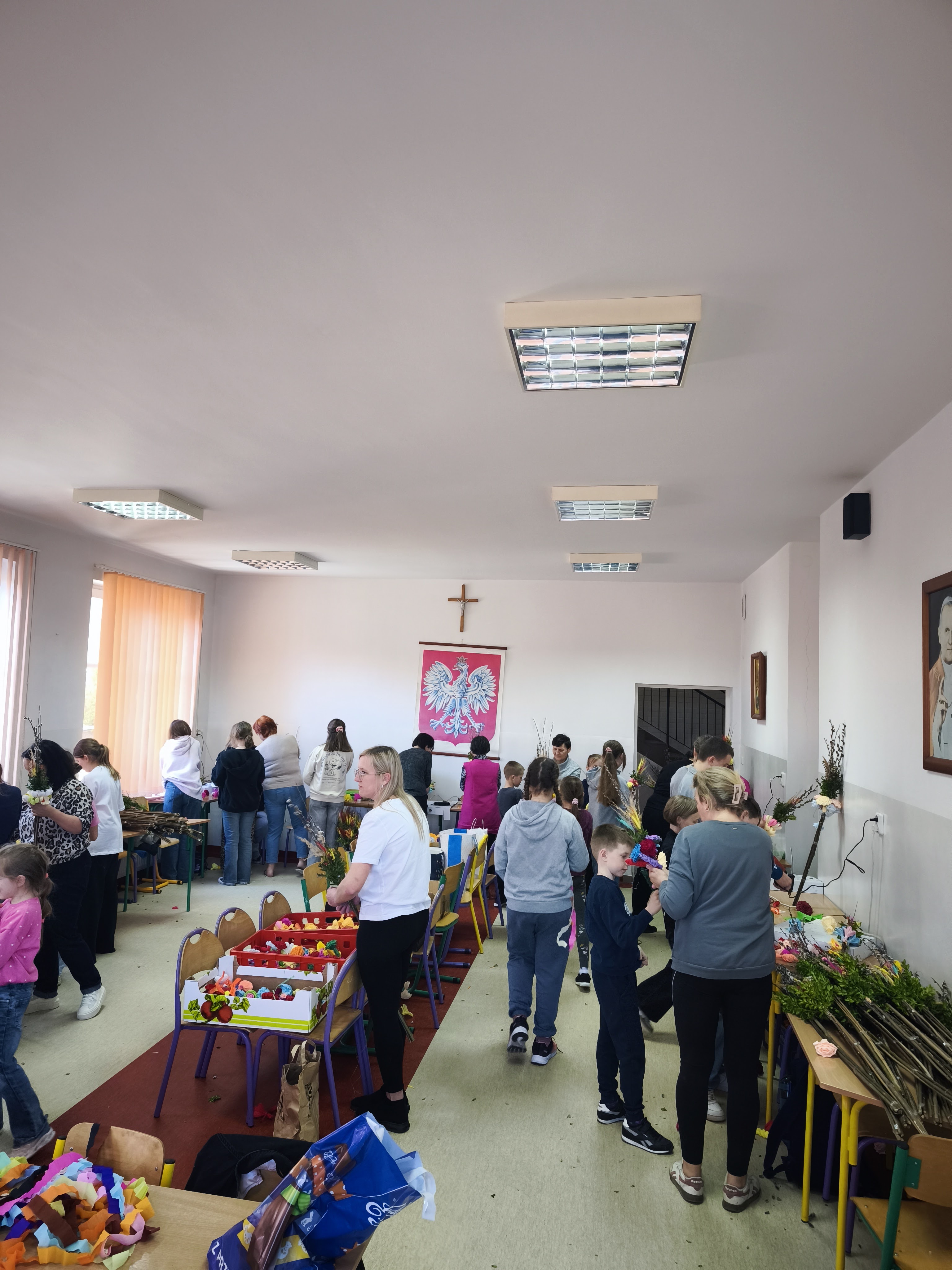 Prawdziwa kulminacja tych działań nastąpiła 18 marca. Tego dnia szkolna jadalnia zamieniła się w tętniącą życiem pracownię rękodzieła. Przy wspólnych stołach zasiedli uczniowie, nauczyciele, pracownicy szkoły oraz rodzice i babcie. Ta niezwykła, międzypokoleniowa integracja przyniosła wspaniałe efekty – wspólnymi siłami udało się stworzyć aż 150 przepięknych, starannie wykonanych palm wielkanocnych! Każda z nich była unikalna, stworzona z dbałością o najmniejszy detal i – co najważniejsze – z dobrą intencją.