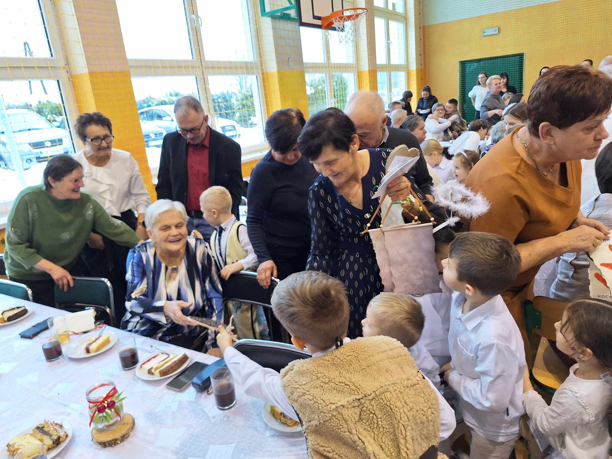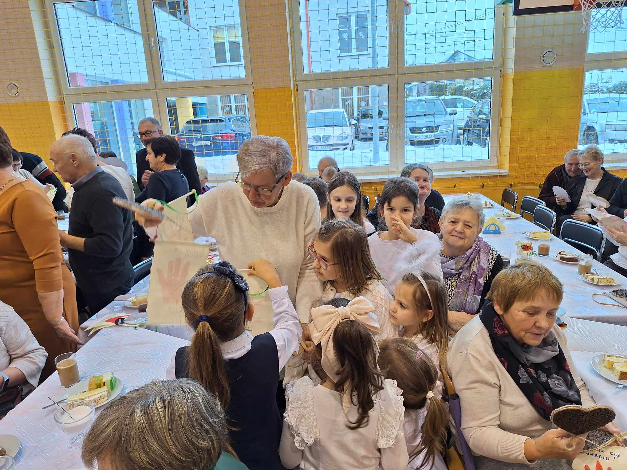Podczas uroczystości wnuki obdarowały swoje babcie i dziadków własnoręcznie wykonanymi upominkami, a cała sala wypełniła się radością i wzruszeniem.