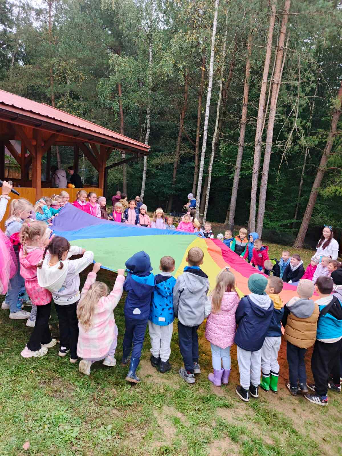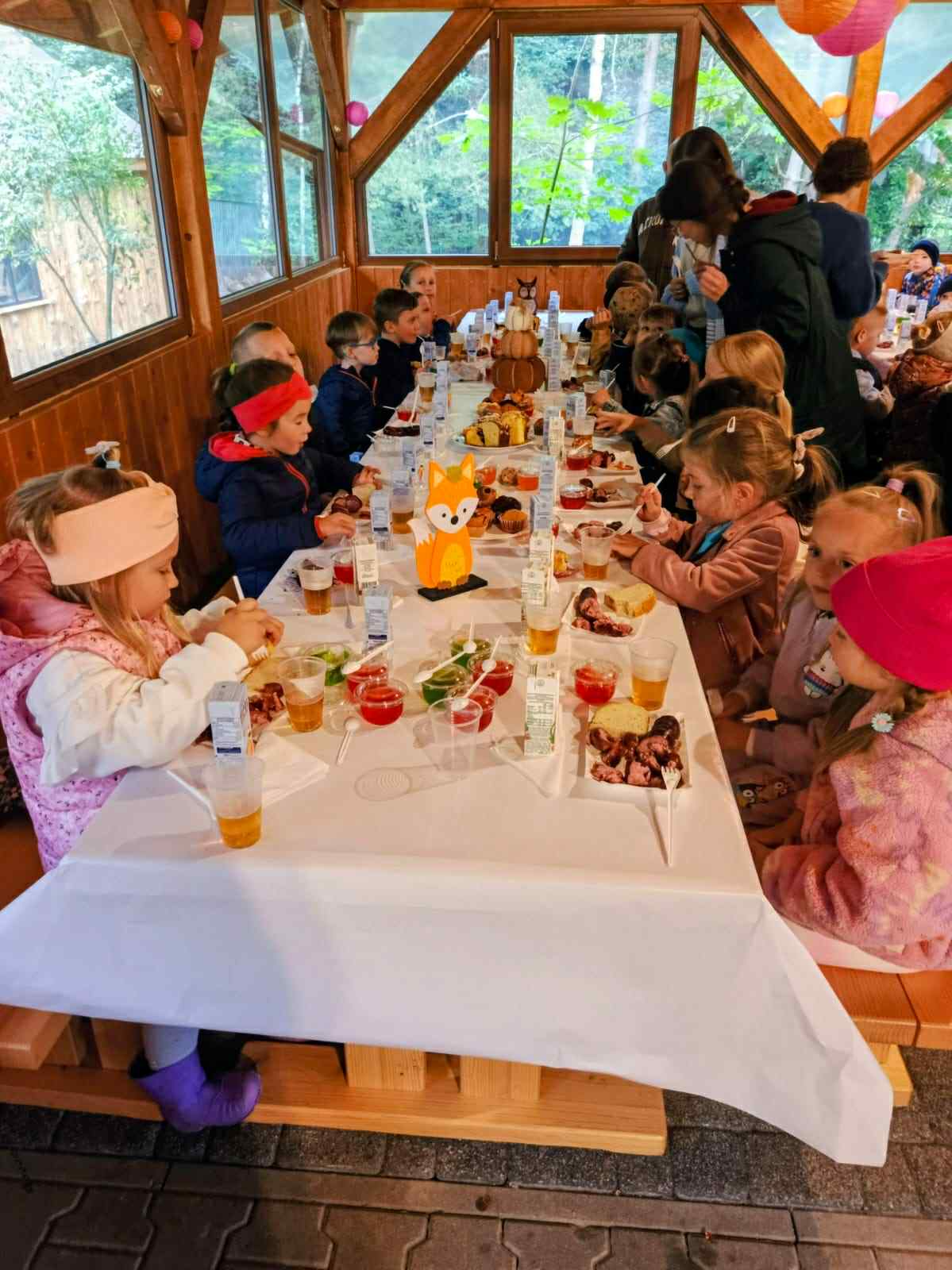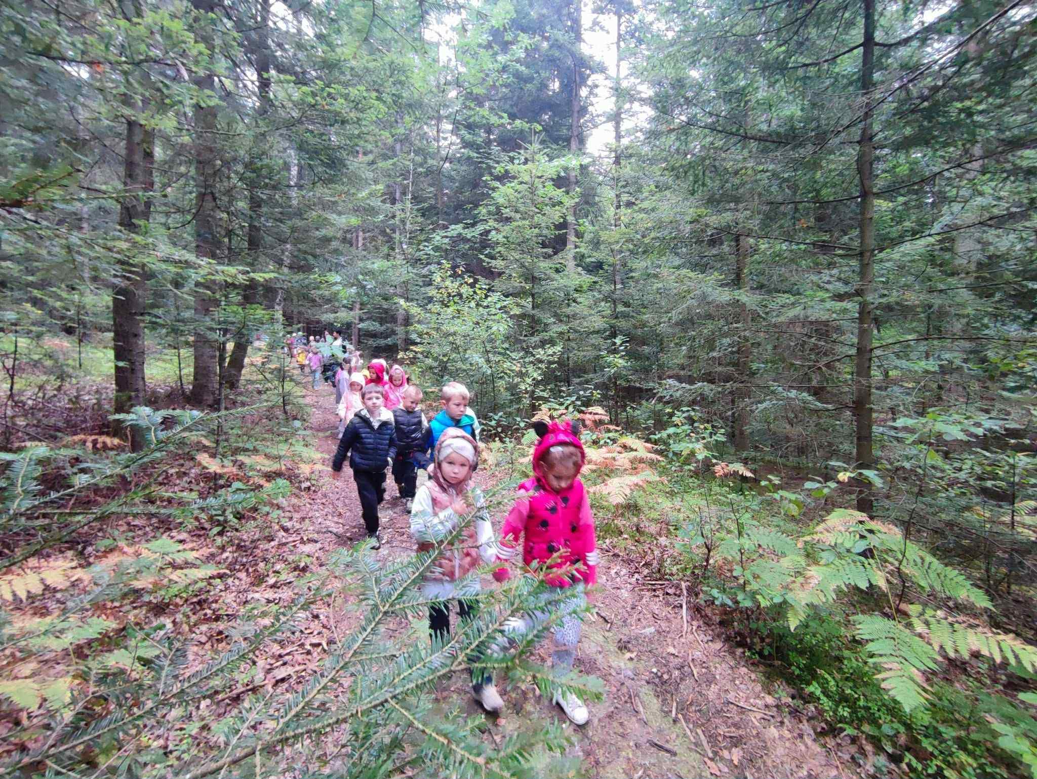 Grupy sześciolatków wraz z opiekunkami zostały najpierw dowiezione autobusem w okolice cmentarza wojennego nr 303 w Rajbrocie. Tam na dzieci czekali leśnicy – Pan Marek Orynczak oraz Pan Tymoteusz Podwyszyński. Po powitaniu wszyscy udali się na pobliski cmentarz, na którym pochowano żołnierzy I wojny światowej. Dzieci złożyły wiązankę oraz znicze pod pomnikiem, a później zwiedziły cmentarz. Następnie dzieci udały się pieszo w kierunku Domku Myśliwskiego w Łąkcie Górnej. Po drodze przewodnicy zdradzili dzieciom wiele leśnych tajemnic. Przedszkolaki podziwiały jesienne barwy lasu, obserwowały różne gatunki drzew i grzybów. Było to wspaniałe przeżycie dla nich. Po przybyciu na miejsce Pani Dyrektor Joanna Dunikowska powitała dzieci, opiekunów oraz gości wręczając pamiątkowe upominki. Dzieci powitał, również Wójt - Wojciech Wrona oraz Prezes Koła Łowieckiego „Ryś” w Żegocinie – Adam Durbas. Następnie Pani Dyrektor zaprosiła wszystkich na poczęstunek przygotowany przez rodziców. Po nabraniu sił przedszkolaki świetnie się bawiły w obecności Pań animatorek. Na koniec dzieci miały okazję uczestniczyć w warsztatach przeprowadzonych przez Panią Barbarę Halek, Przewodniczącą Komisji Promocji Łowiectwa PZŁ KO Kraków – na temat zwierząt leśnych. Po zakończonym pikniku poszczególne grupy, pełne wrażeń z powrotem wsiadały do autobusu i odjeżdżały do swoich przedszkoli.