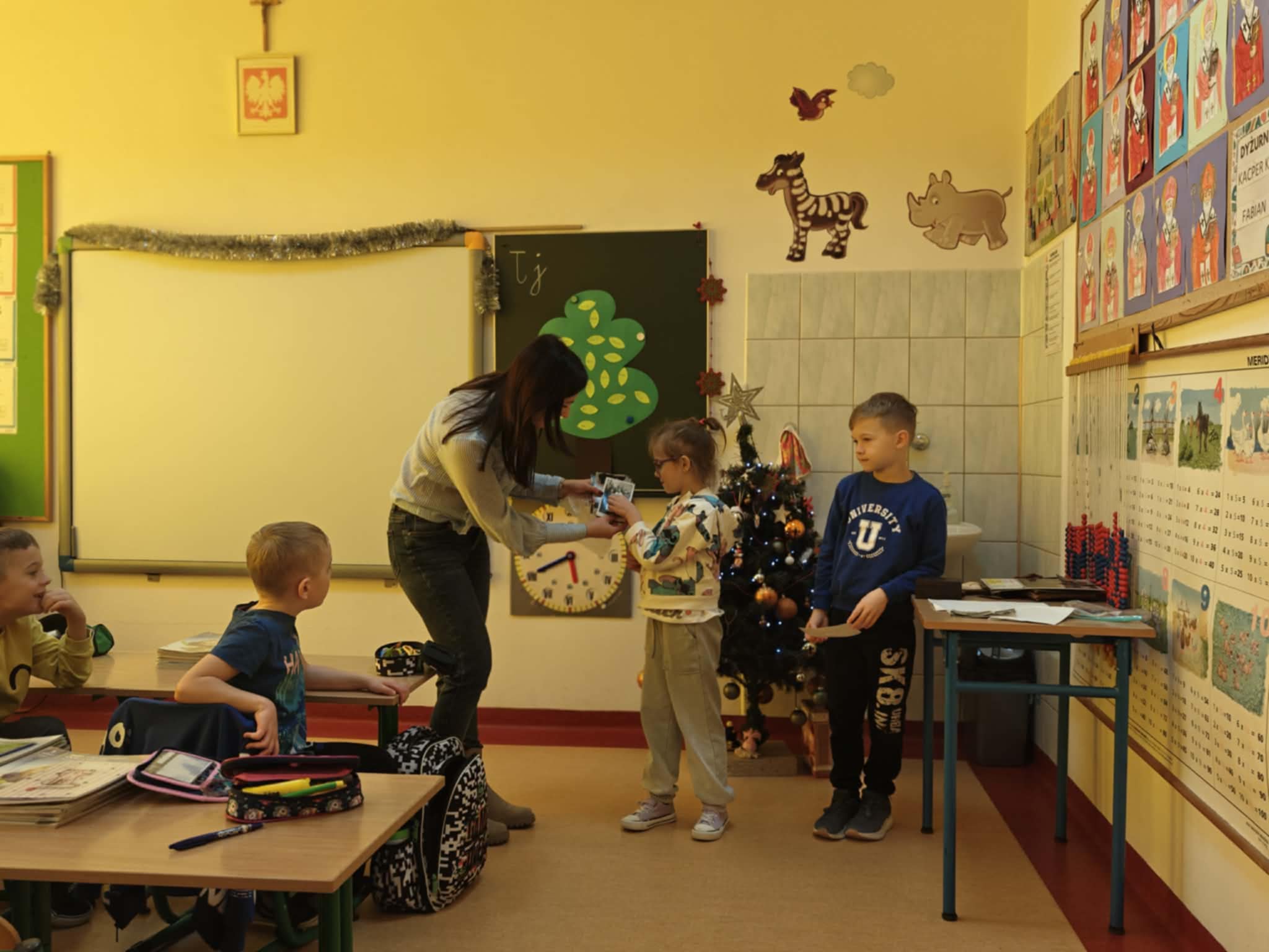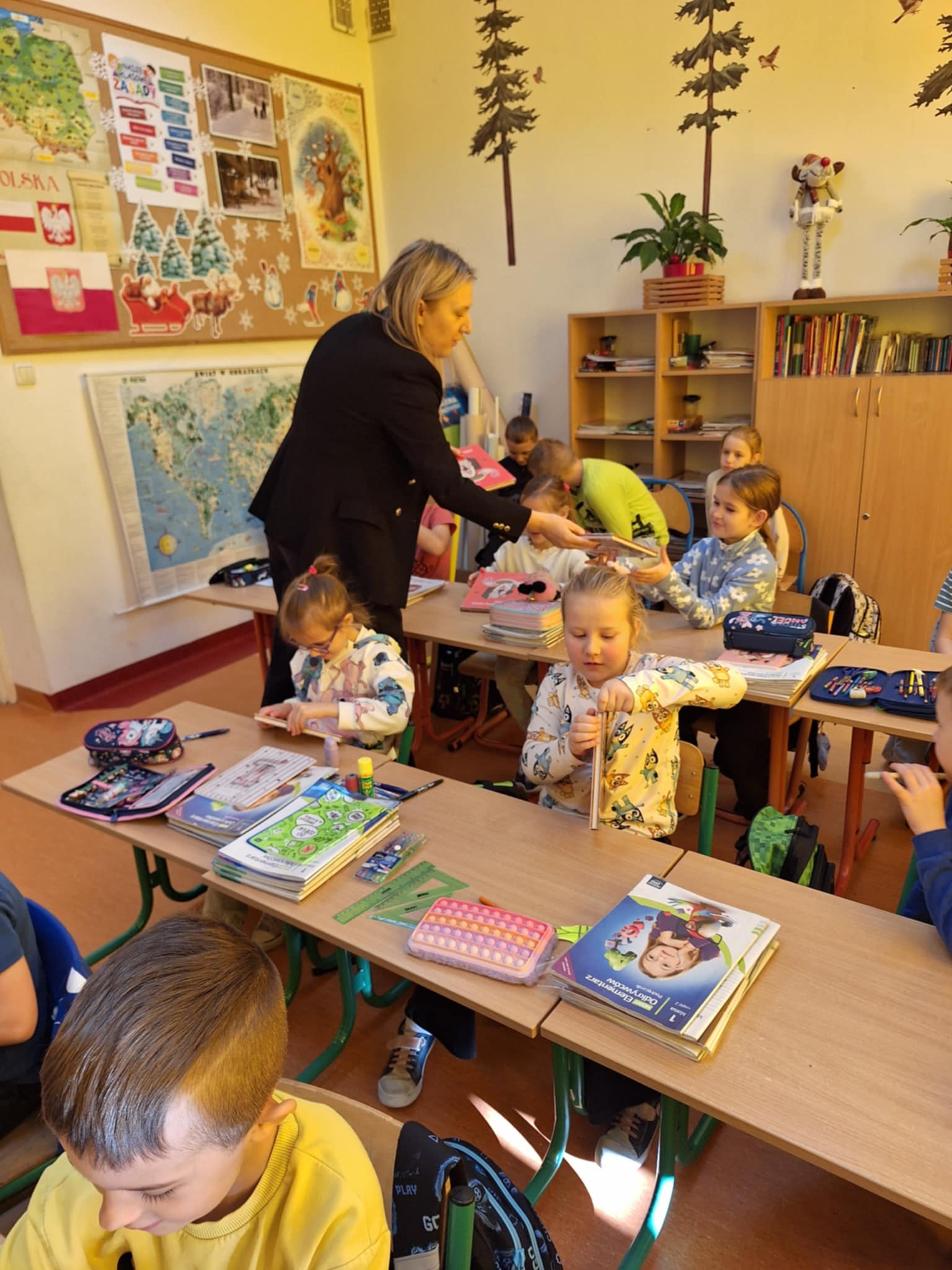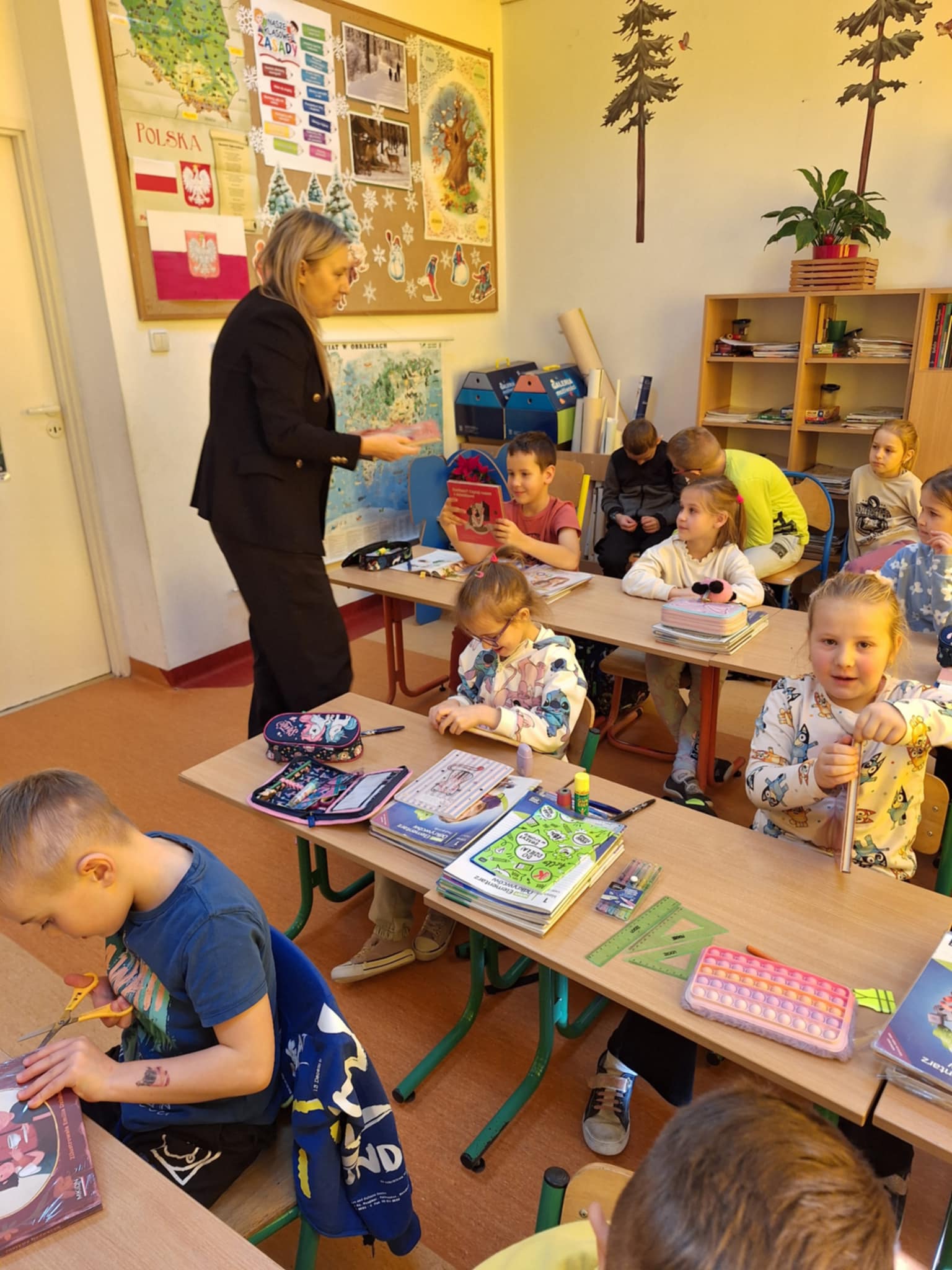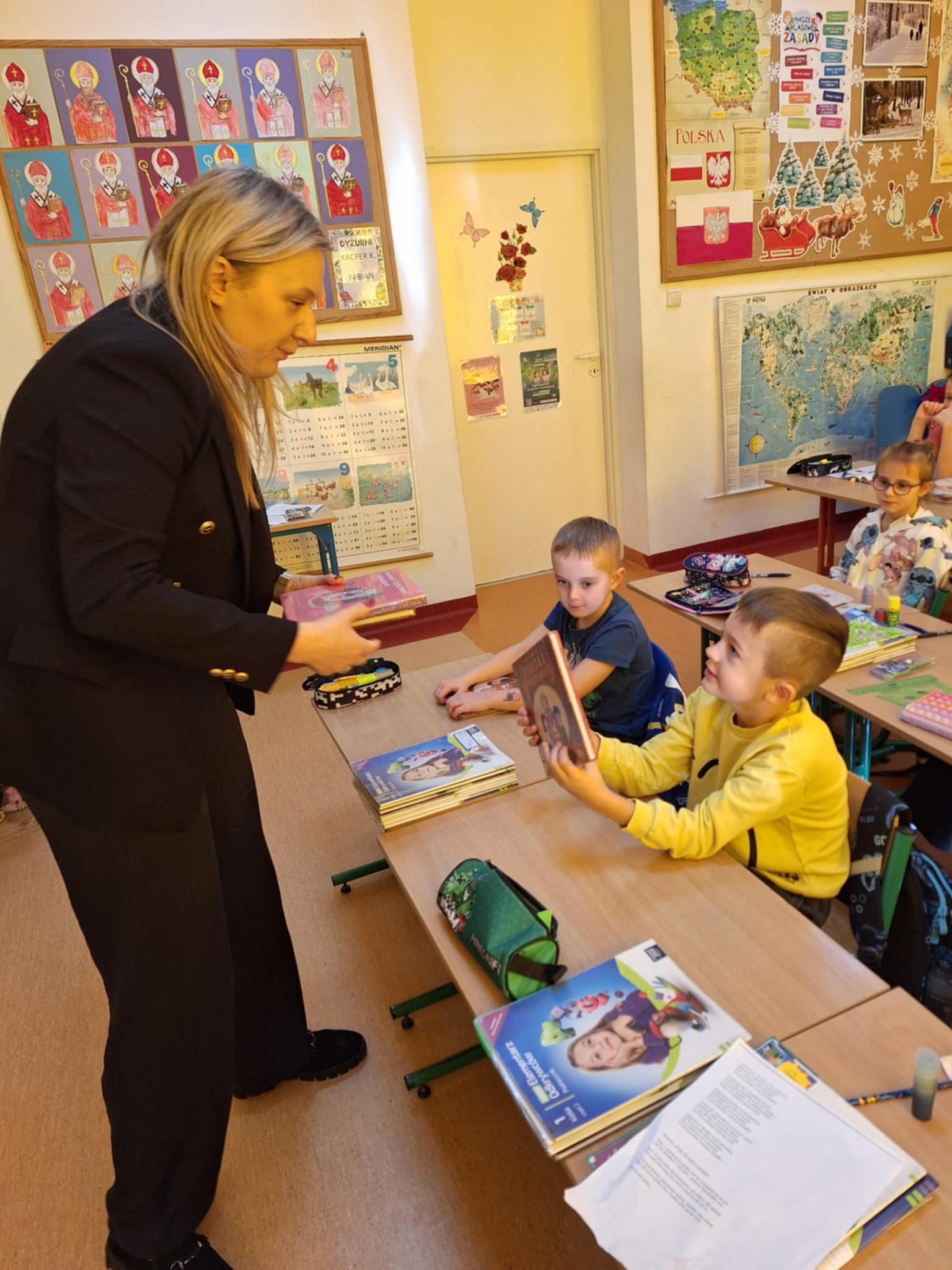 Podczas przeprowadzanych zajęć Pani Dyrektor osobiście przekazała uczniom klasy I darmowe książki, podkreślając znaczenie czytania w codziennym życiu oraz zachęcając uczniów do sięgania po literaturę już od najmłodszych lat. Otrzymane publikacje stały się inspiracją do rozmów o czytelnictwie, a także do zajęć dotyczących drzewa genealogicznego i wartości rodzinnych.