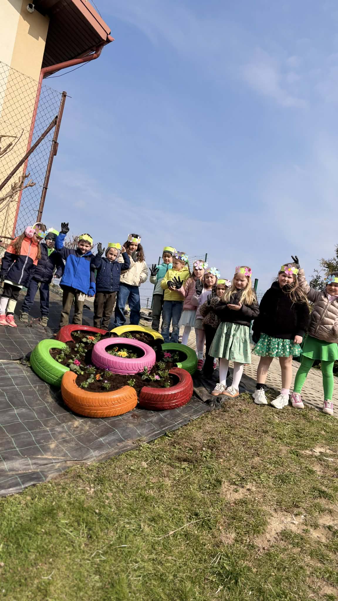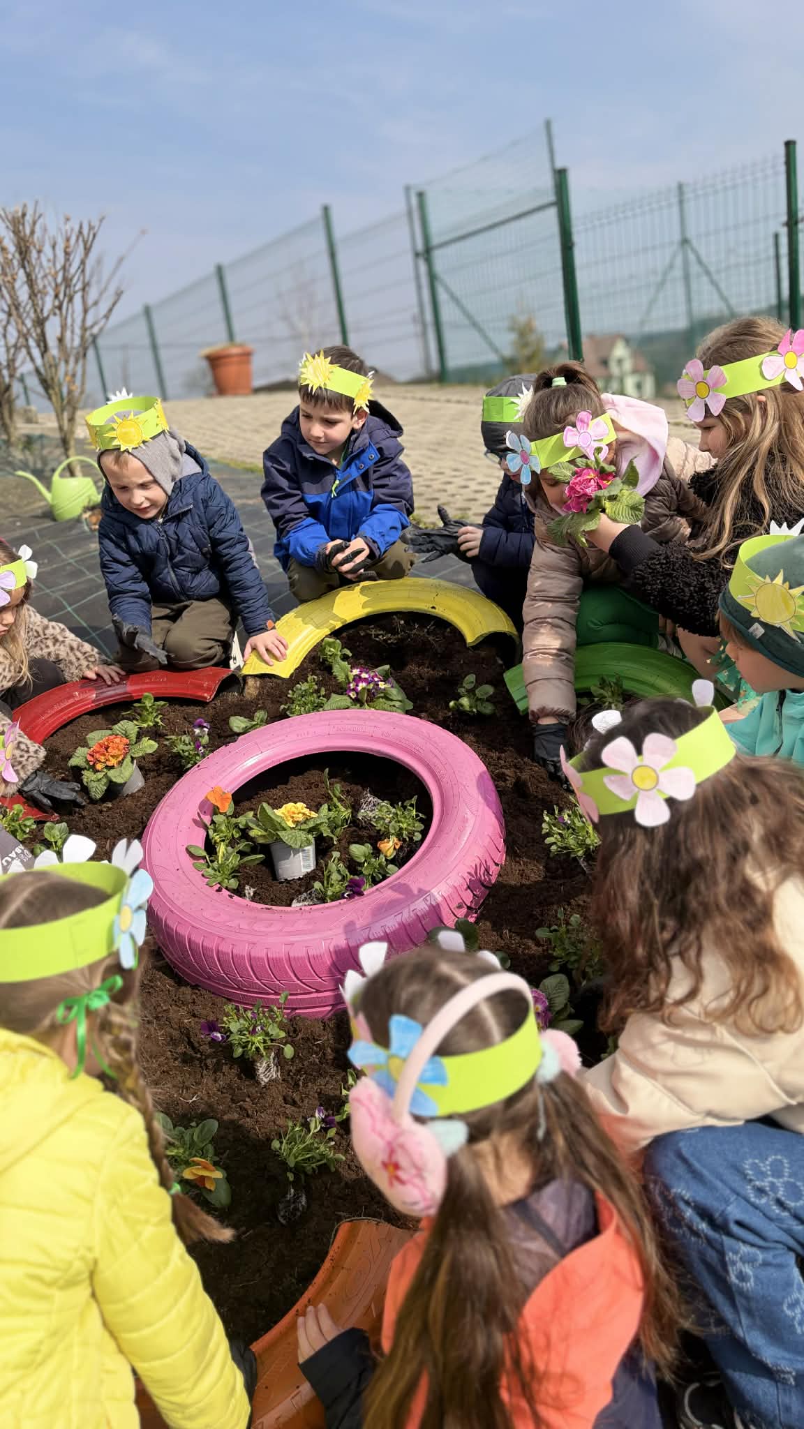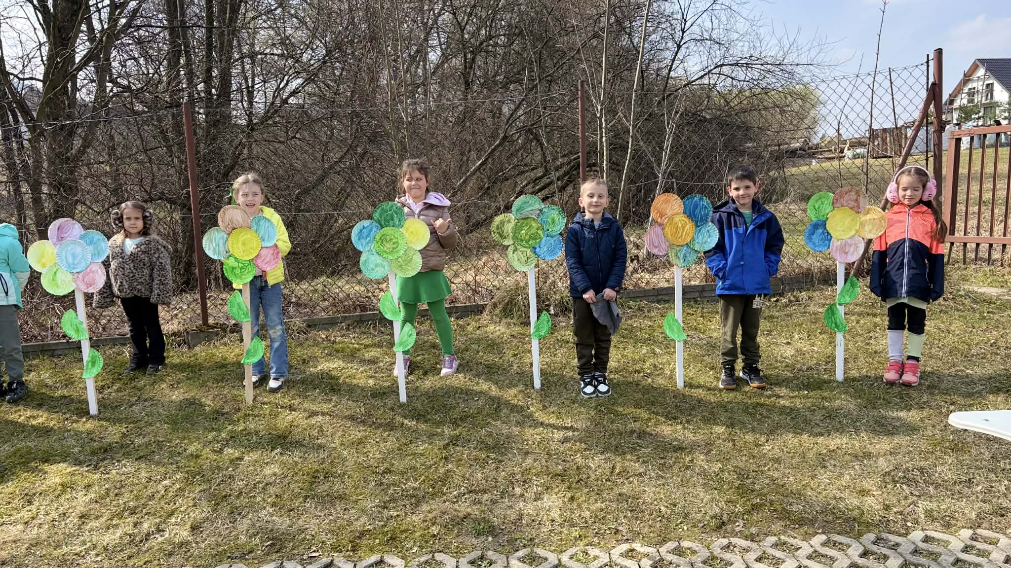 Po zajęciach w salach przenieśliśmy się na świeże powietrze, gdzie czekały kolejne atrakcje. Dzieci sadziły kwiatki w kolorowych oponach, tworząc pierwsze wiosenne dekoracje, a także ozdabiały papierowe kwiaty umieszczone na patykach.