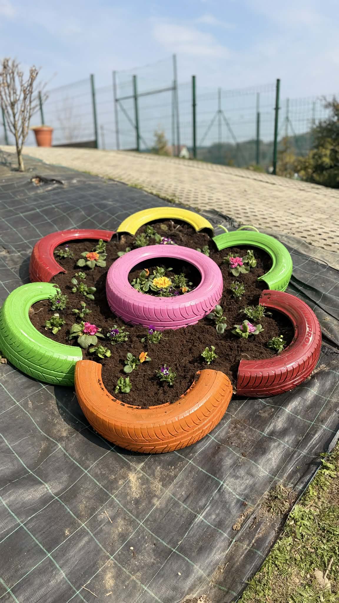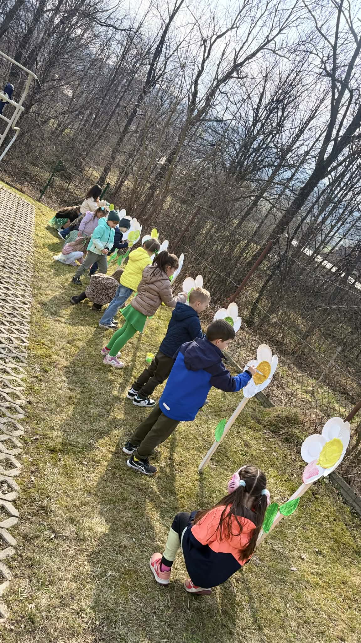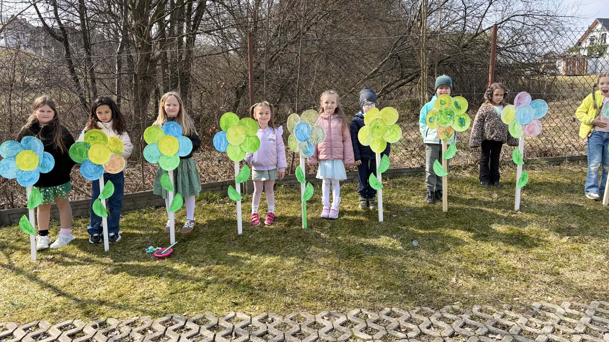 Po zajęciach w salach przenieśliśmy się na świeże powietrze, gdzie czekały kolejne atrakcje. Dzieci sadziły kwiatki w kolorowych oponach, tworząc pierwsze wiosenne dekoracje, a także ozdabiały papierowe kwiaty umieszczone na patykach.