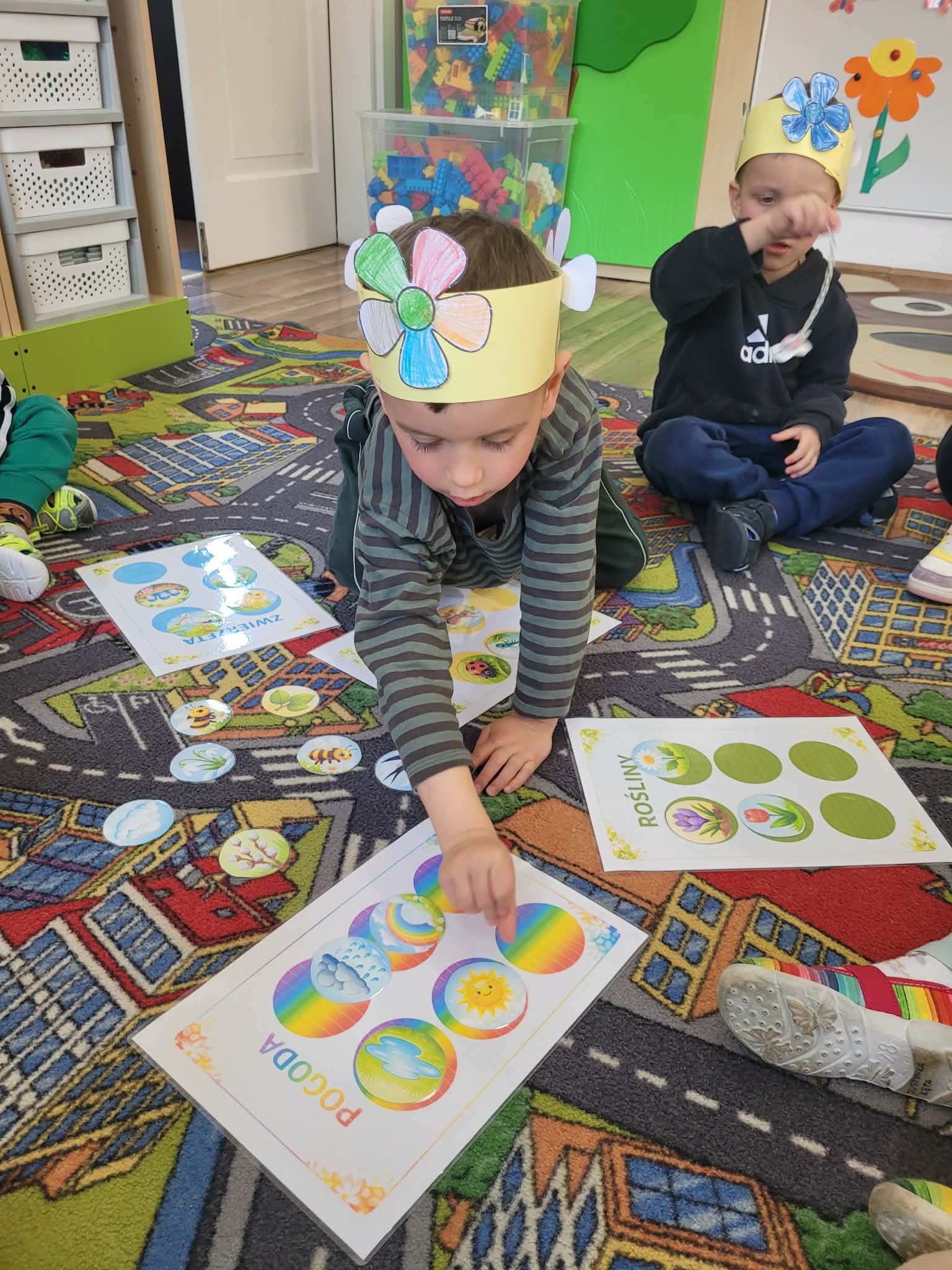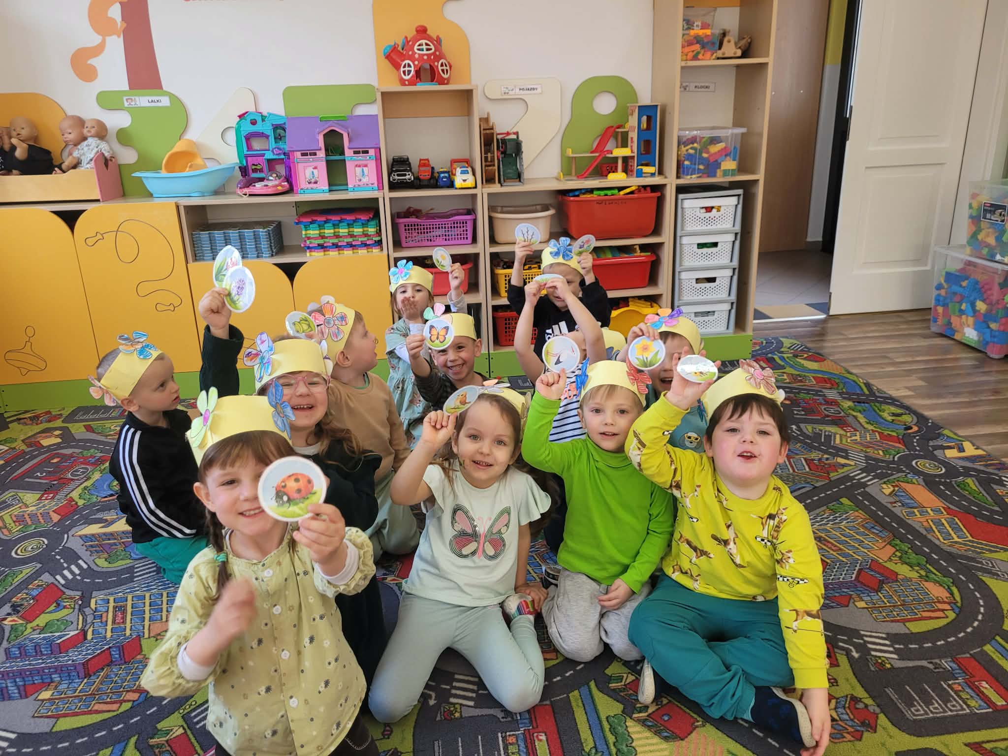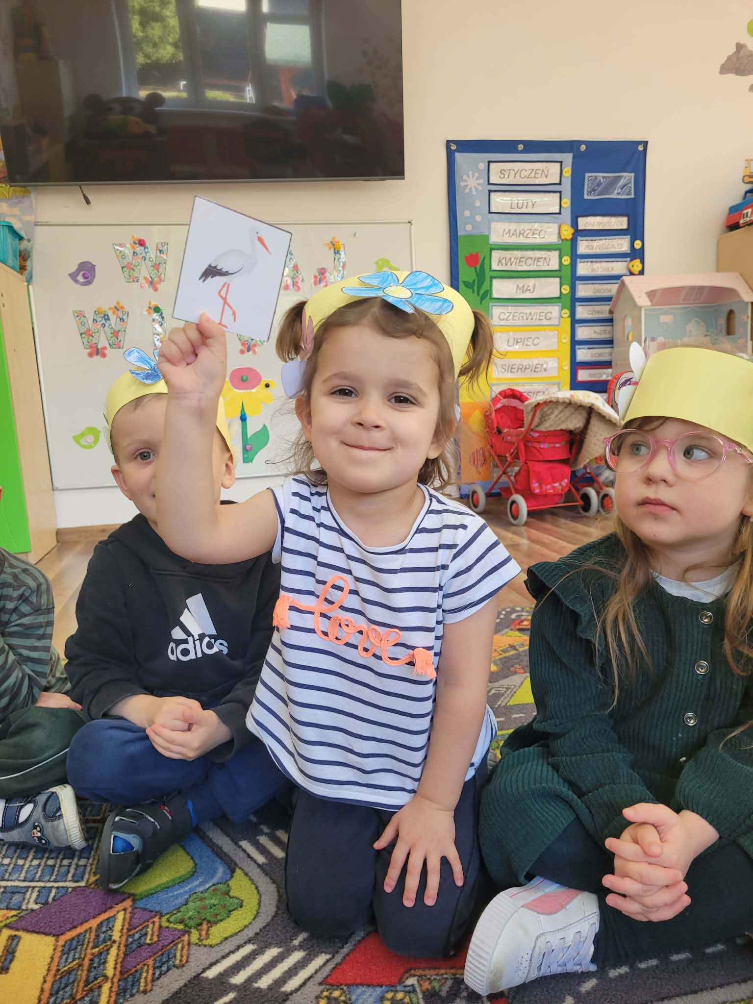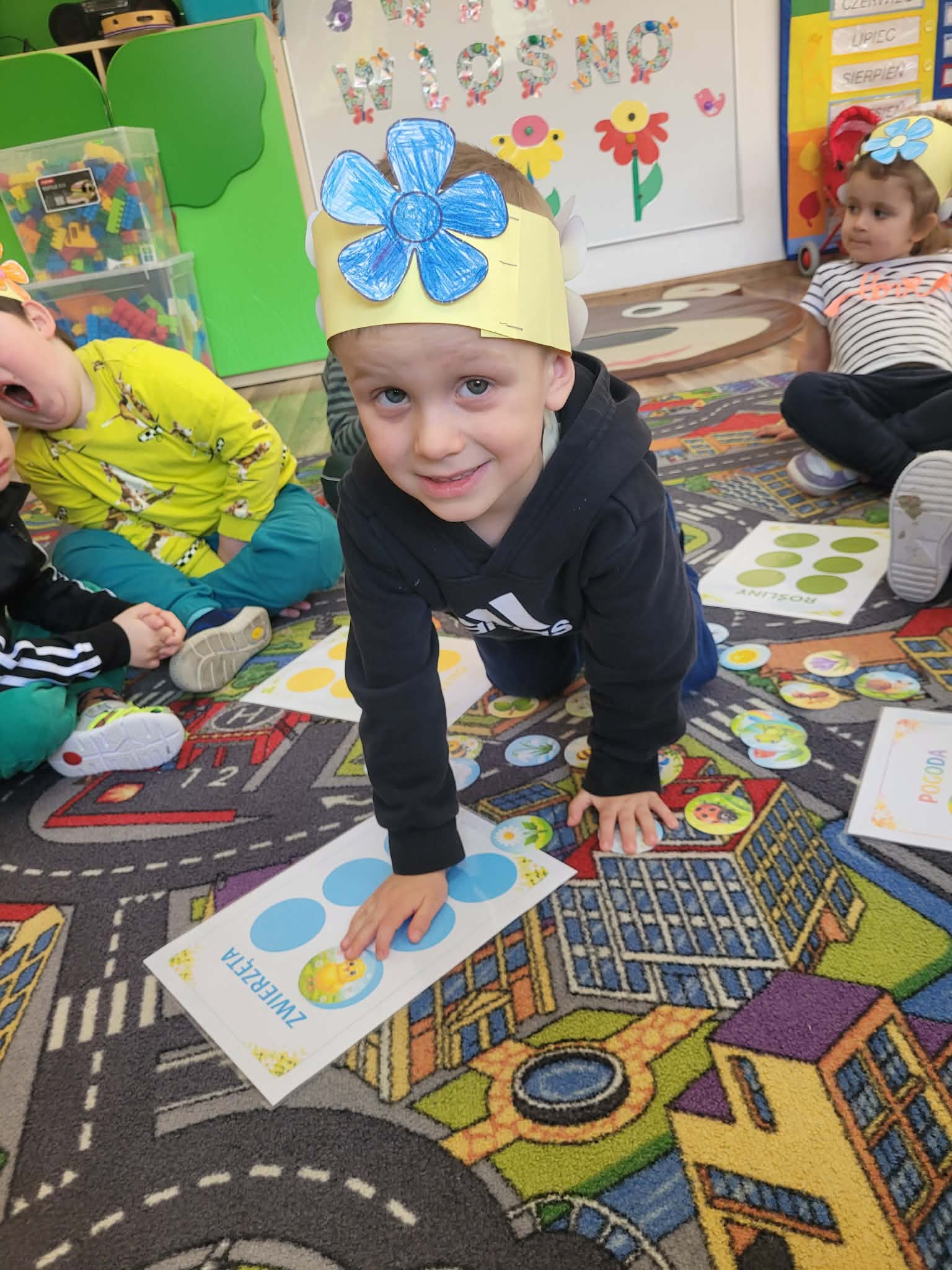 Dzień rozpoczął się od rozmów o oznakach wiosny. Dzieci rozpoznawały pierwsze kwiaty, słuchały śpiewu ptaków, rozwiązywały zagadki oraz opowiadały o zmianach zachodzących w przyrodzie. Następnie przystąpiły do działań plastycznych – kolorowały skarpetki według własnych pomysłów oraz wykonywały prace przedstawiające Panią Wiosnę. Powstały również barwne opaski, które dopełniły wiosenny wygląd przedszkolaków.