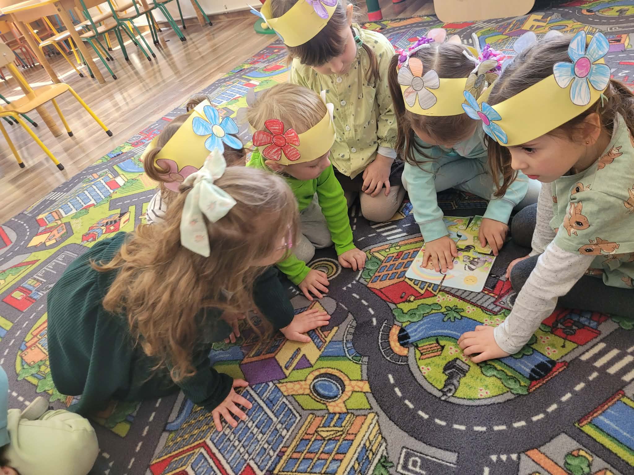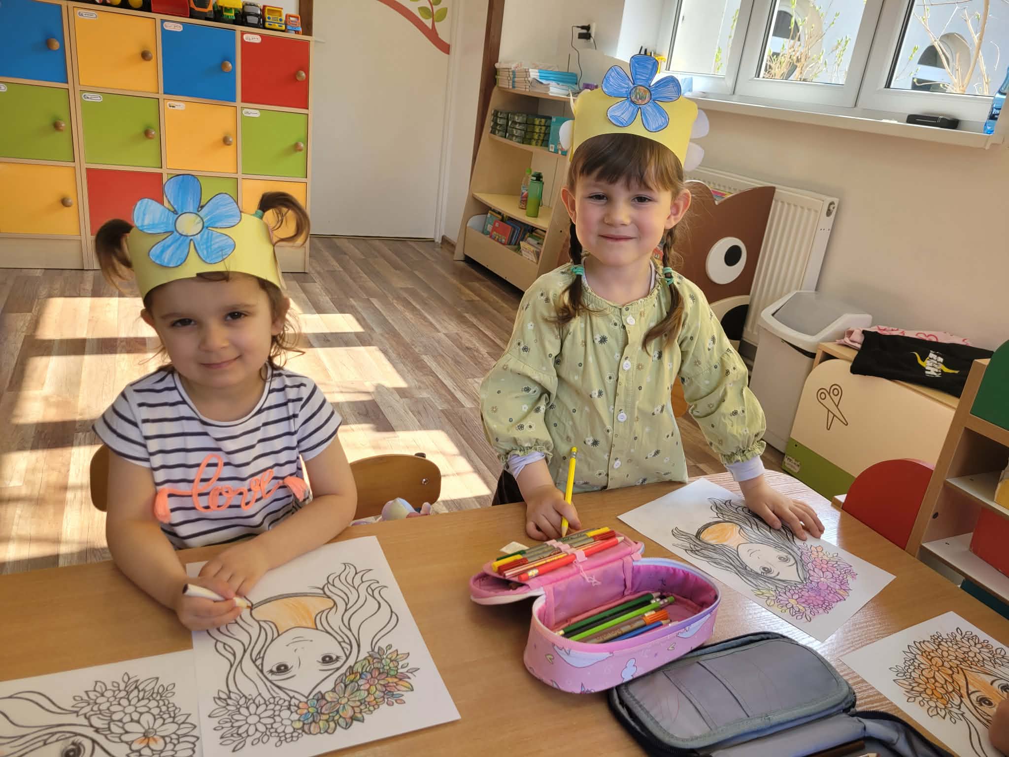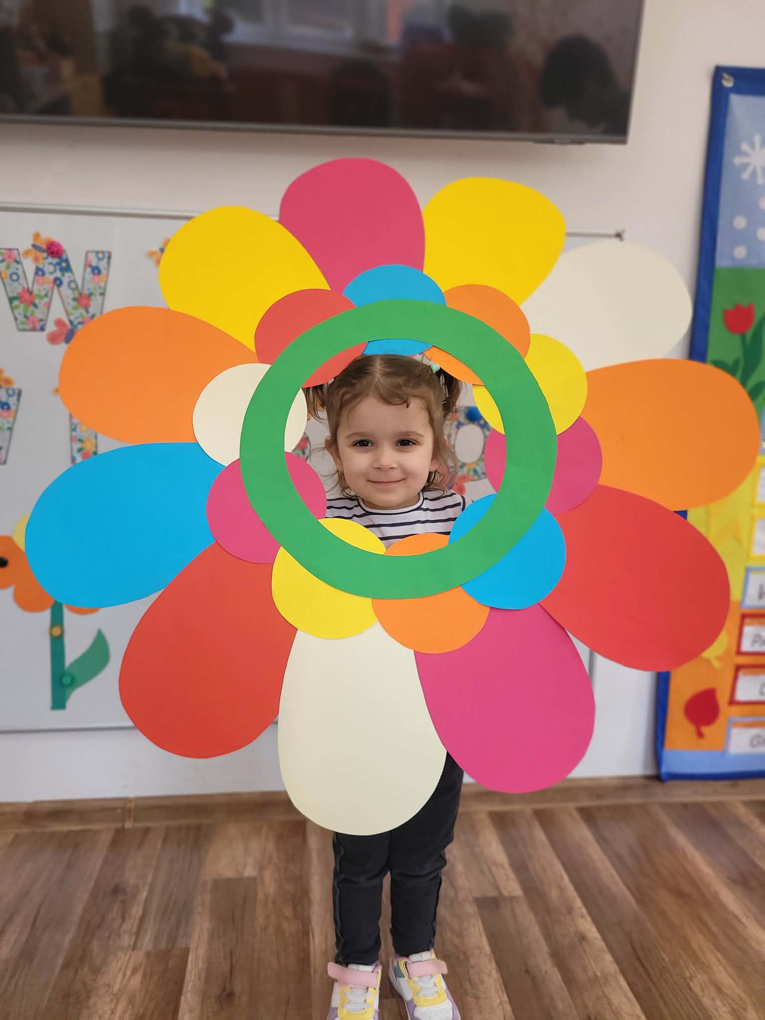 Dzień rozpoczął się od rozmów o oznakach wiosny. Dzieci rozpoznawały pierwsze kwiaty, słuchały śpiewu ptaków, rozwiązywały zagadki oraz opowiadały o zmianach zachodzących w przyrodzie. Następnie przystąpiły do działań plastycznych – kolorowały skarpetki według własnych pomysłów oraz wykonywały prace przedstawiające Panią Wiosnę. Powstały również barwne opaski, które dopełniły wiosenny wygląd przedszkolaków.
