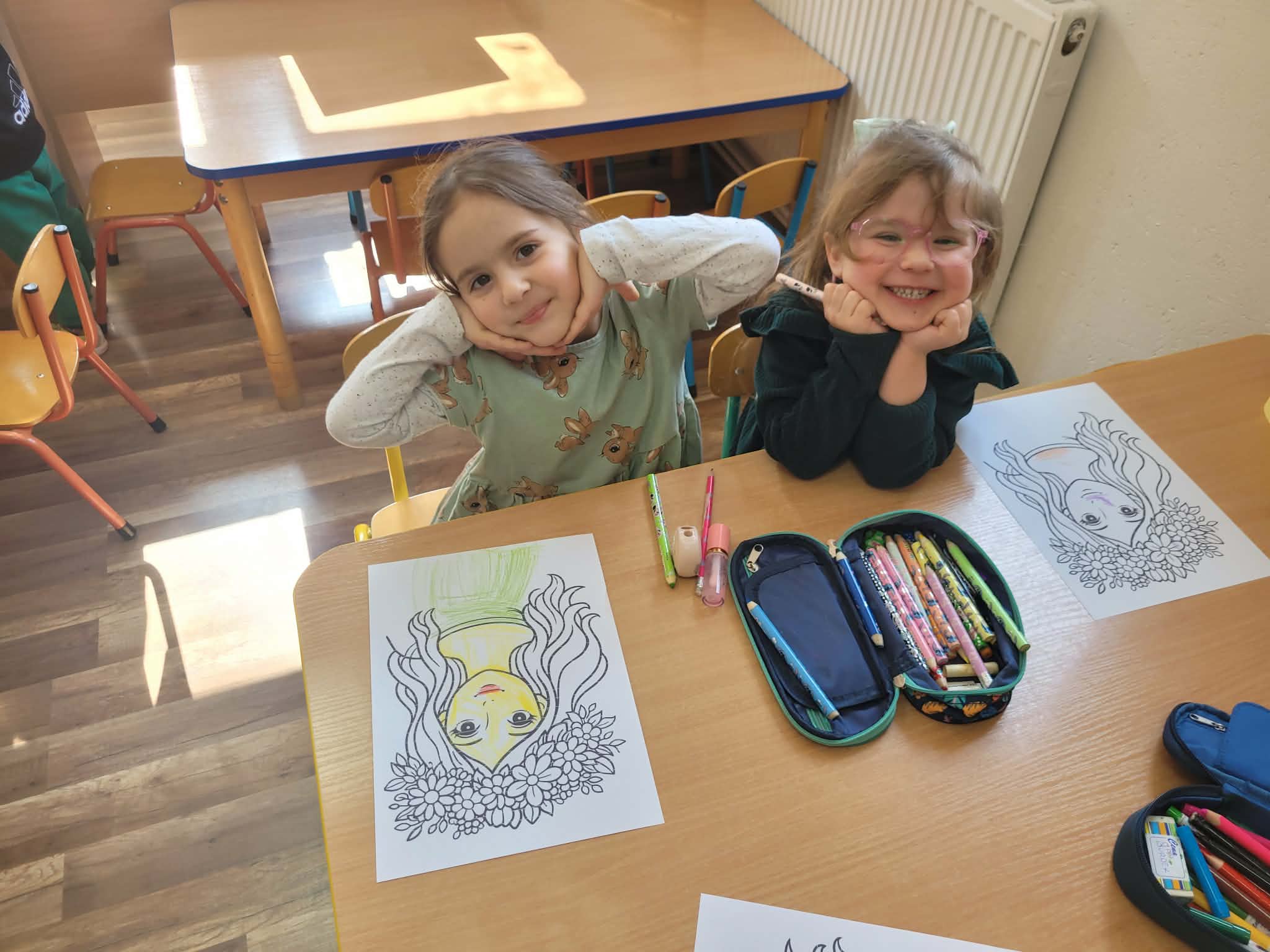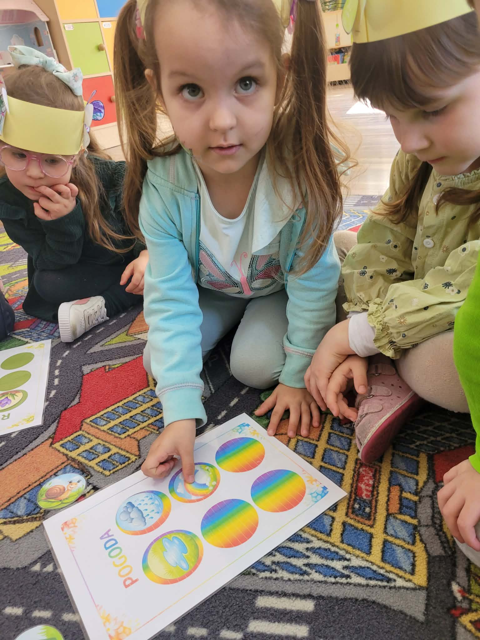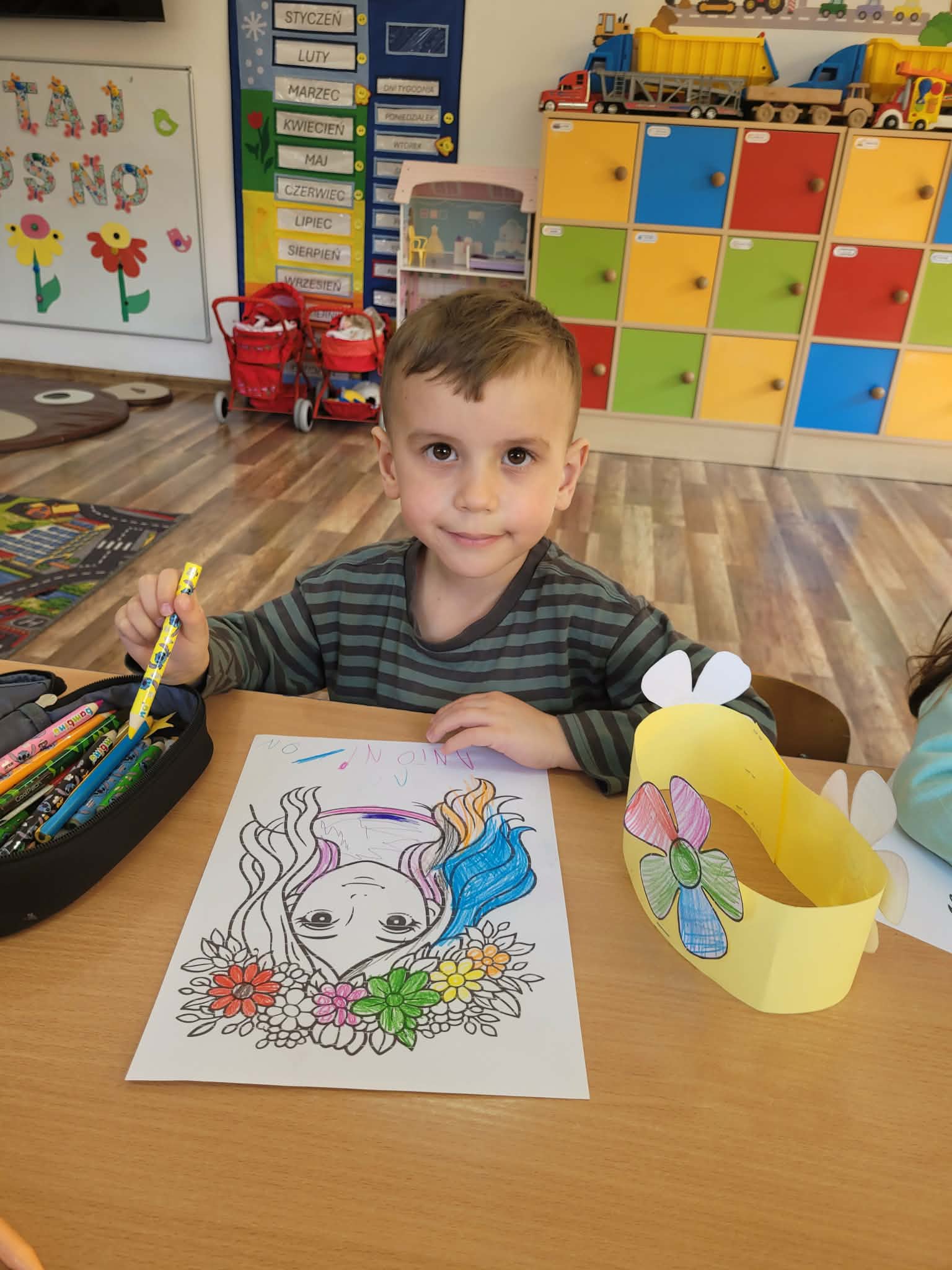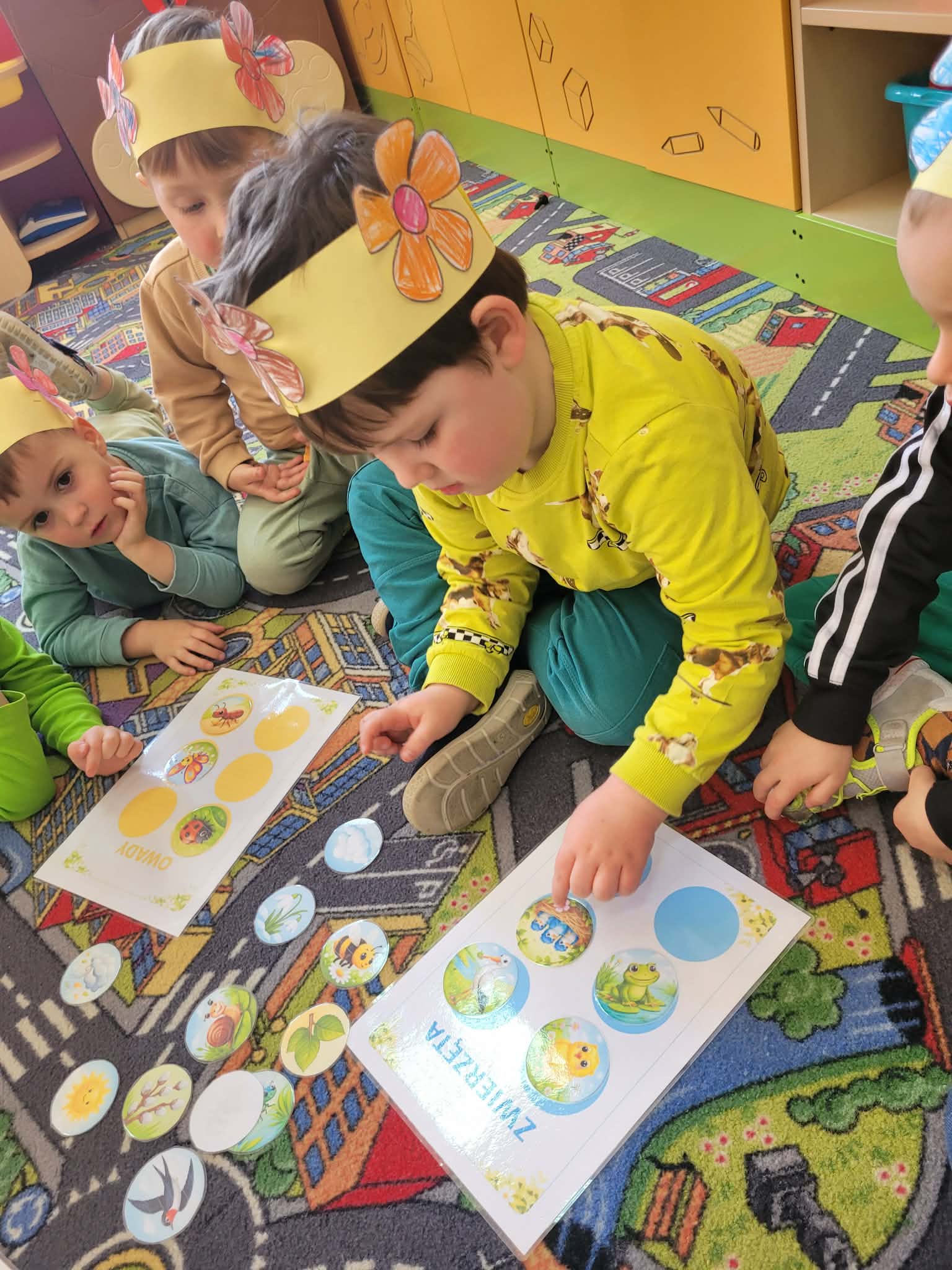 Dzień rozpoczął się od rozmów o oznakach wiosny. Dzieci rozpoznawały pierwsze kwiaty, słuchały śpiewu ptaków, rozwiązywały zagadki oraz opowiadały o zmianach zachodzących w przyrodzie. Następnie przystąpiły do działań plastycznych – kolorowały skarpetki według własnych pomysłów oraz wykonywały prace przedstawiające Panią Wiosnę. Powstały również barwne opaski, które dopełniły wiosenny wygląd przedszkolaków.