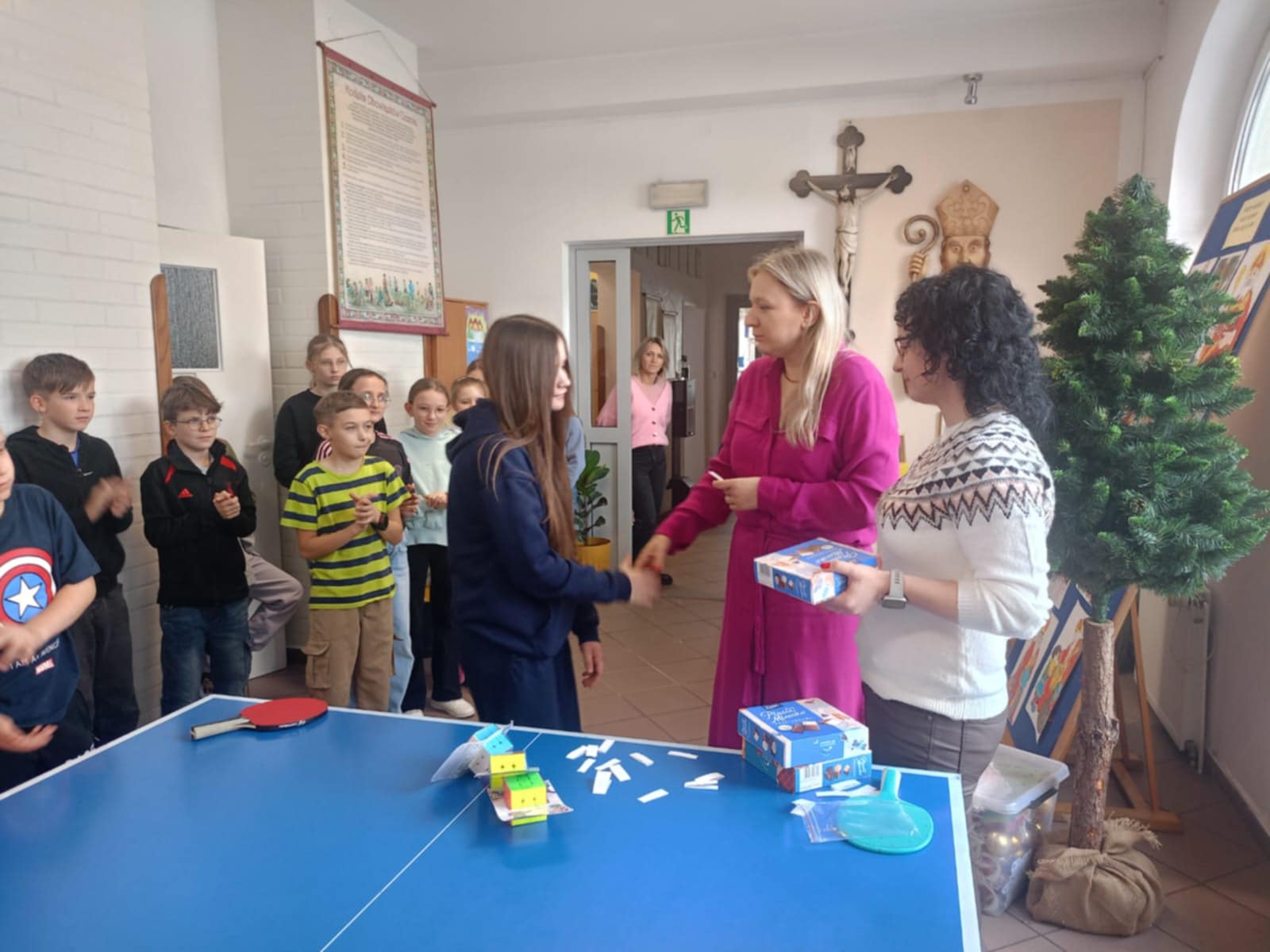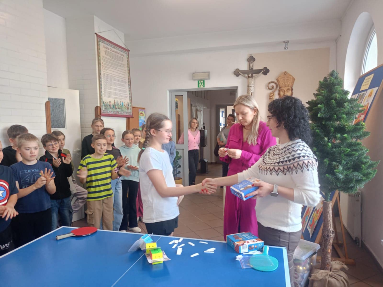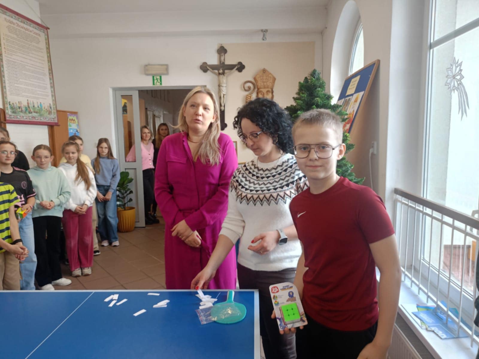 W listopadzie w naszej szkole obchodziliśmy Światowy Dzień Tabliczki Mnożenia. W tym dniu w klasach rozwiązywaliśmy specjalnie przygotowane zadania, które prócz umiejętności tabliczki mnożenia kształtowały także kompetencje matematyczne. W budynku szkoły, w ogólnodostępnej przestrzeni rozwieszono 50 działań z tabliczki mnożenia. Element rywalizacji sprawił, że Uczniowie z niezwykłym poświęceniem rozwiązywali zadania, a wśród tych, którzy wszystkie zadania rozwiązali poprawnie rozlosowano słodkie upominki i kostki Rubika.