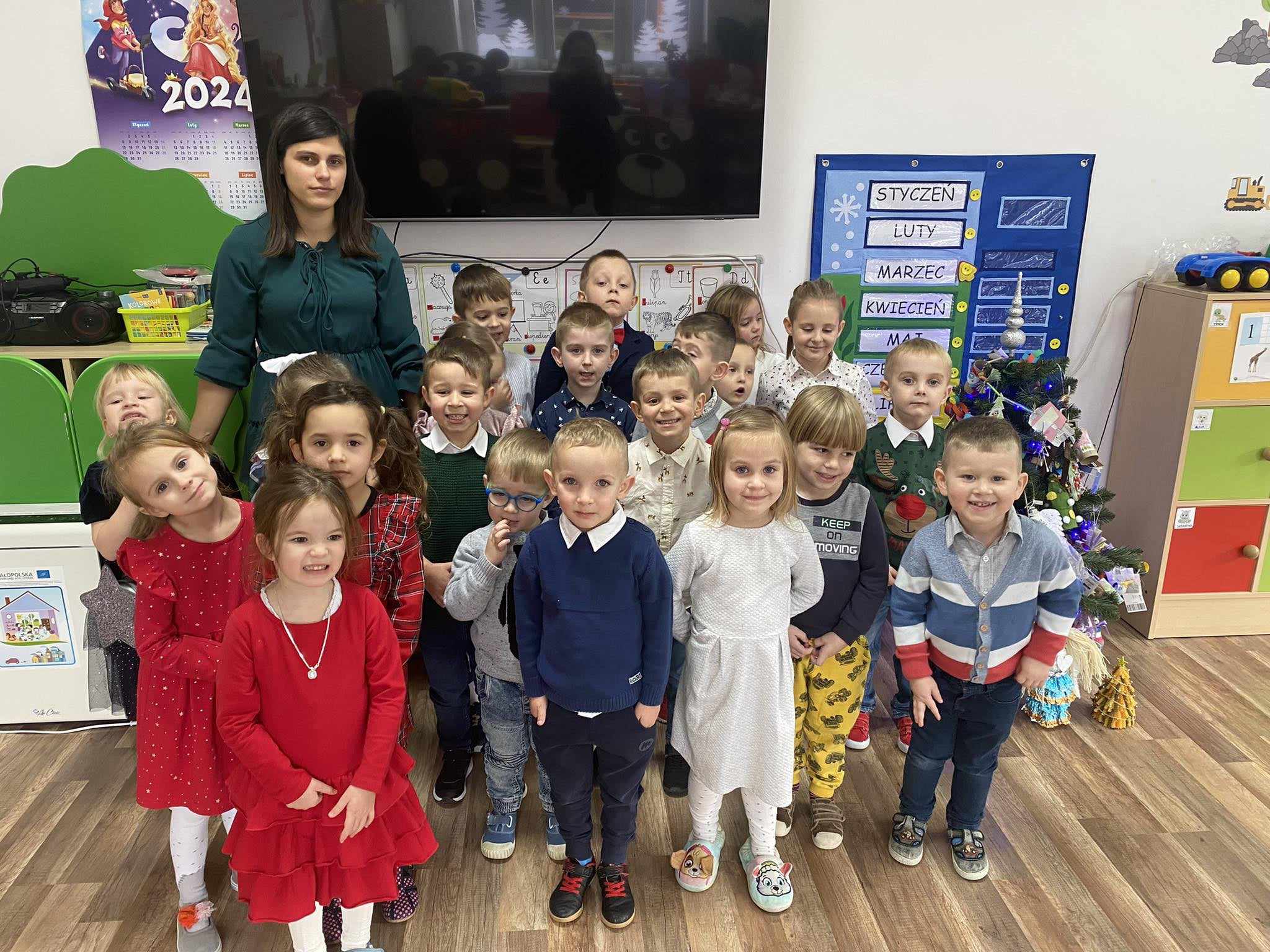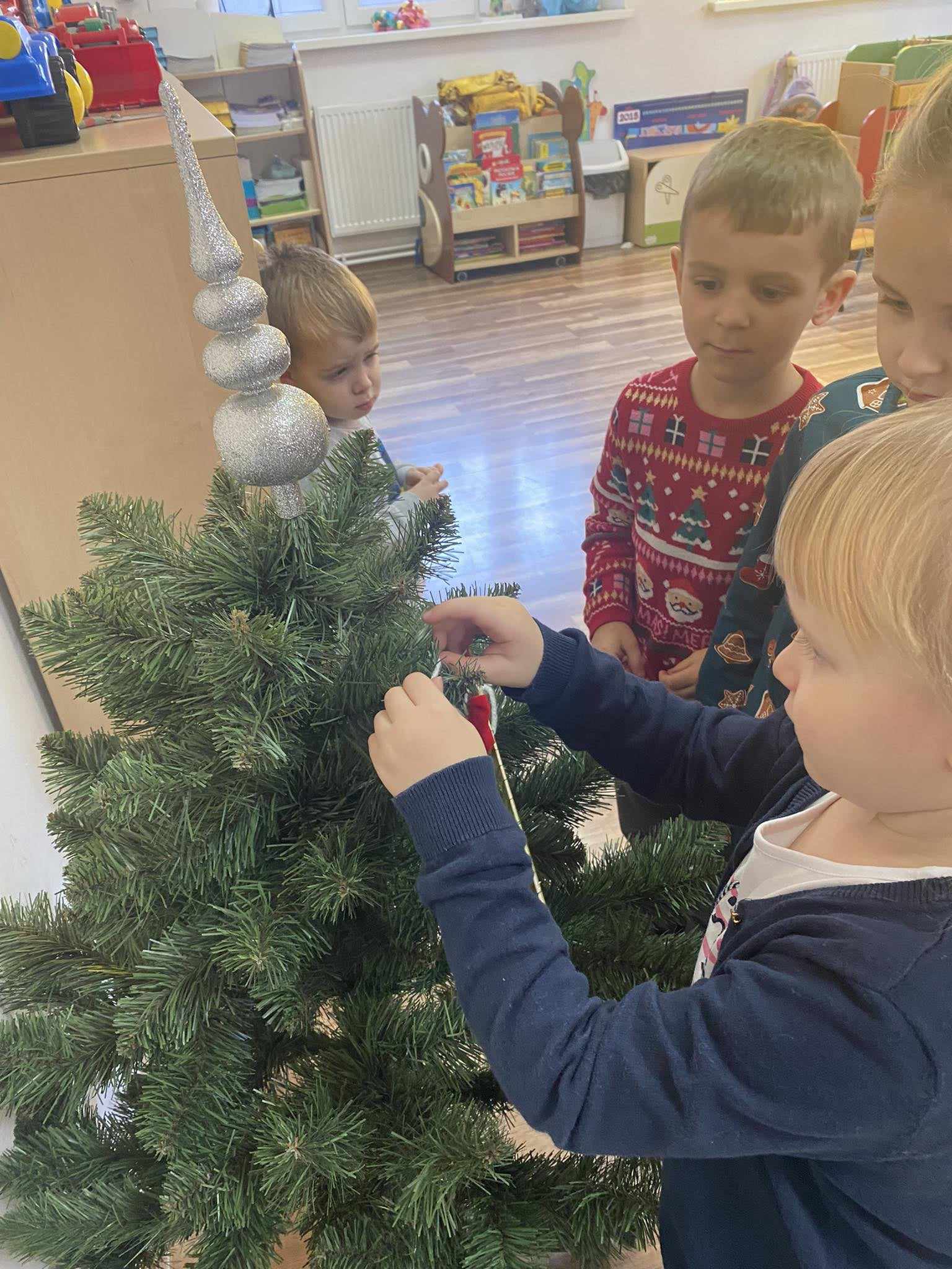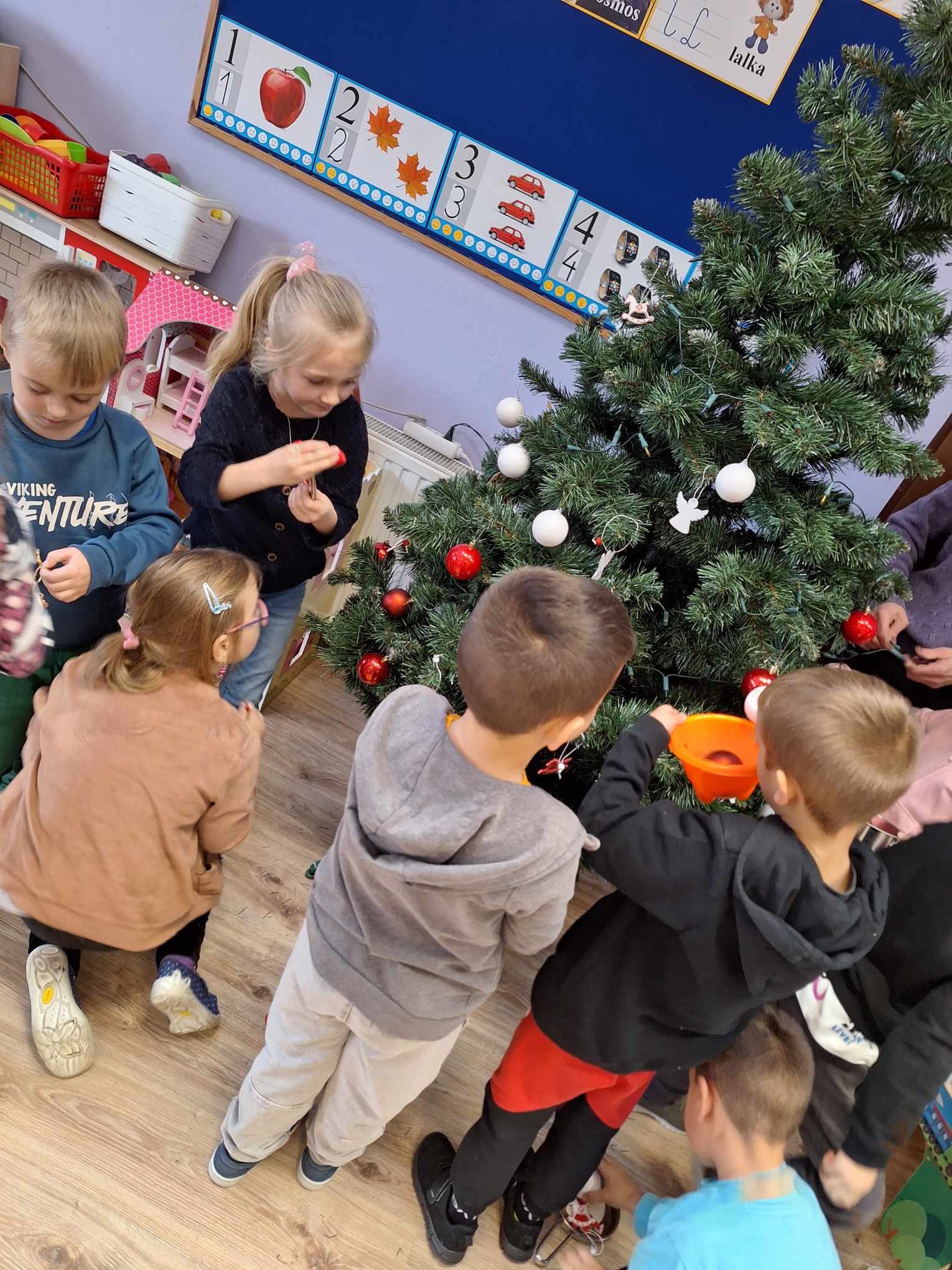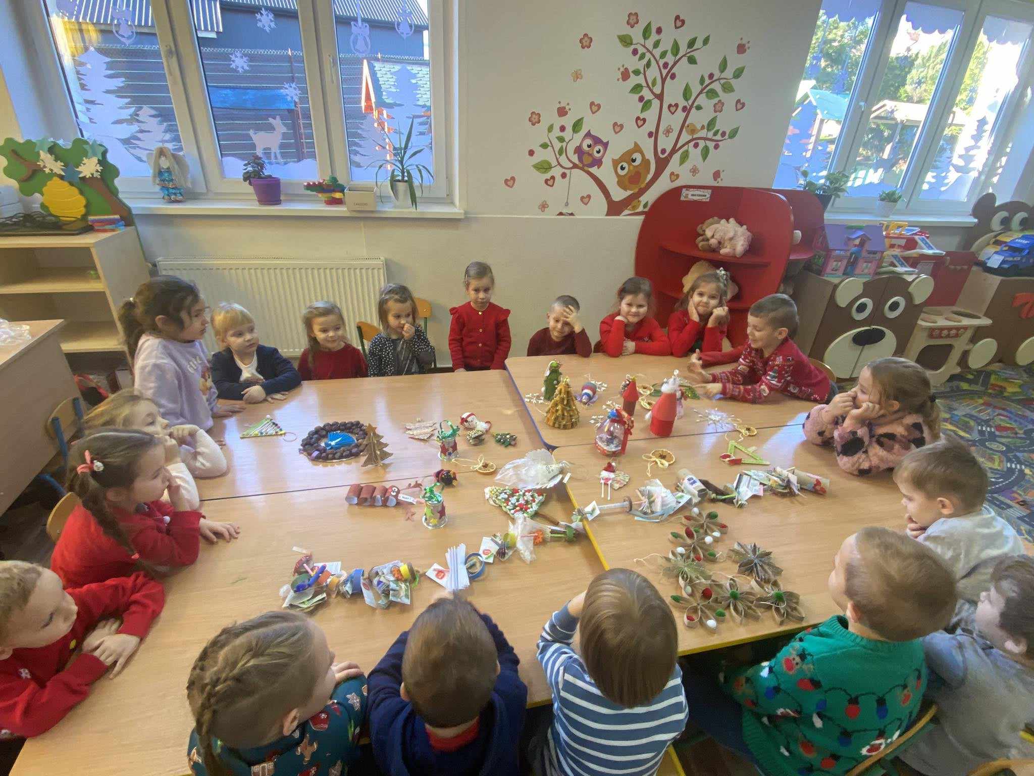 Poprzez realizacjÄ™ tematyki kompleksowej zwiÄ…zanej ze ÅšwiÄ™tami Bożego Narodzenia dzieci pogłębiajÄ… swojÄ… wiedzÄ™ na temat obyczajów i tradycji bożonarodzeniowych. GÅ‚ównym motywem zajęć jest mikoÅ‚aj, choinka, prezenty. Wymienione symbole zbliżajÄ…cych siÄ™ Å›wiÄ…t to także przewodnie motywy prac plastycznych naszych przedszkolaków. Ponadto dzieci z zapaÅ‚em i dużym zaangażowaniem wykonaÅ‚y różne ozdoby, piekÅ‚y i dekorowaÅ‚y pierniczki, chÄ™tnie Å›piewaÅ‚y kolÄ™dy, pastoraÅ‚ki oraz piosenki o tematyce zimowo-Å›wiÄ…tecznej. DziÄ™ki wspólnemu zaangażowaniu nauczycieli oraz rodziców grupy przedszkolne przygotowaÅ‚y kiermasz ozdób Å›wiÄ…tecznych. W najmÅ‚odszej grupie zorganizowano konkurs pt." Recyklingowe ozdoby choinkowe". Dzieci z pomocÄ… rodziców wykonaÅ‚y przepiÄ™kne ozdoby , które zawisÅ‚y na choince w sali maluchów.