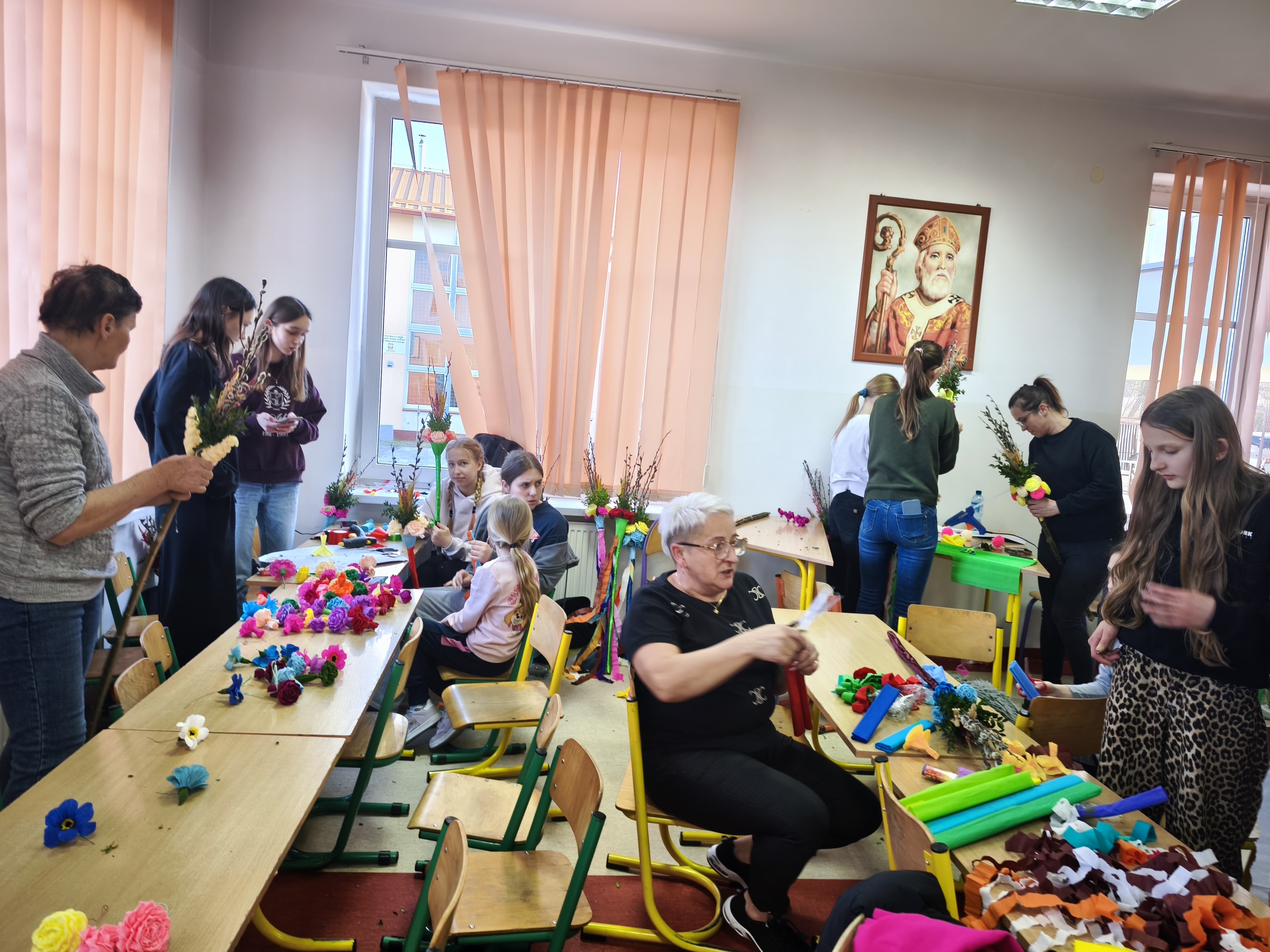 Niedzielny kiermasz był owocem ogromnego zaangażowania i wielotygodniowej pracy. Przez cały okres Wielkiego Postu nasi uczniowie cierpliwie i z wielką precyzją wykonywali dziesiątki kolorowych kwiatów z krepiny, zbierali bazie i trawy.