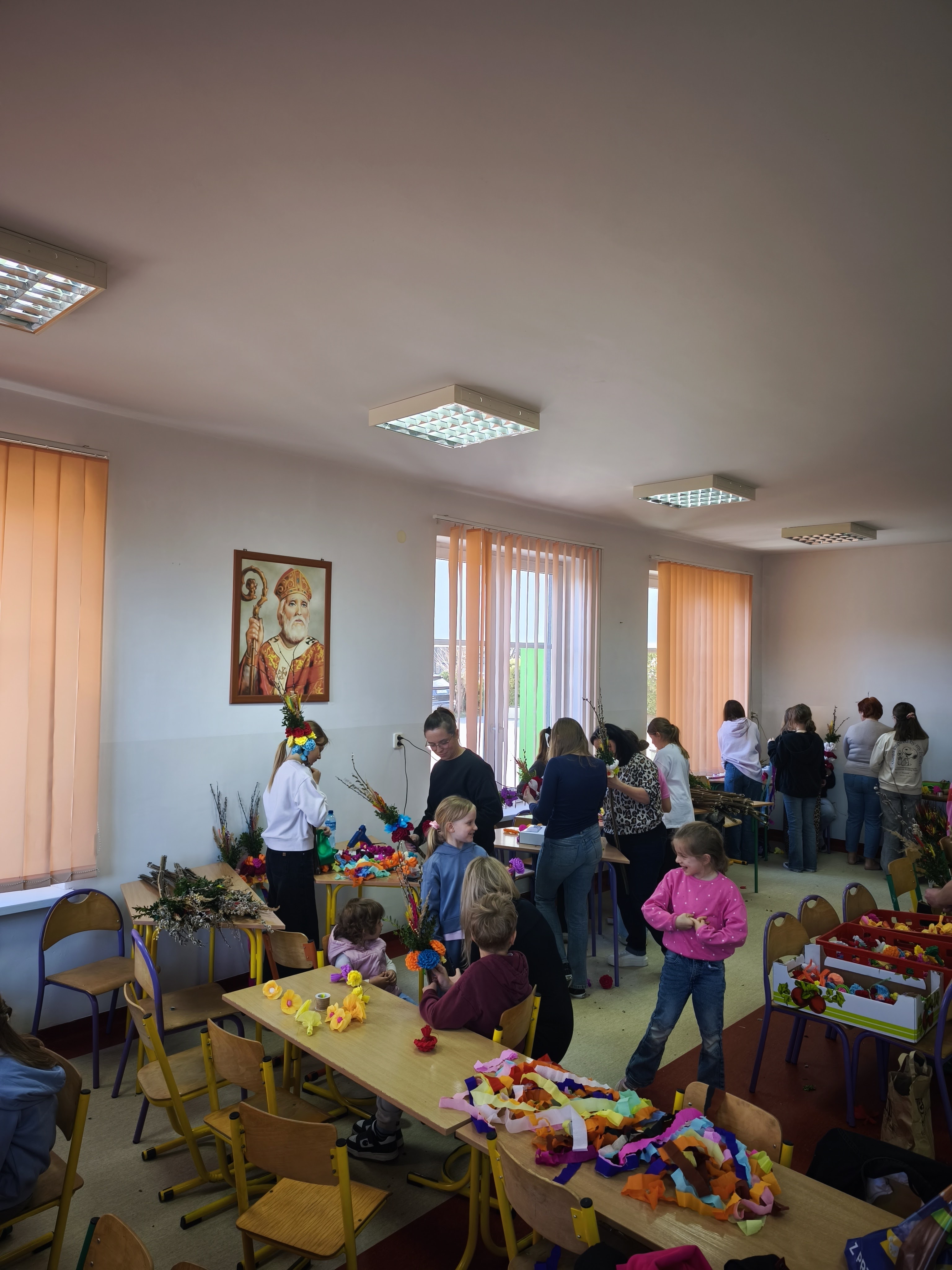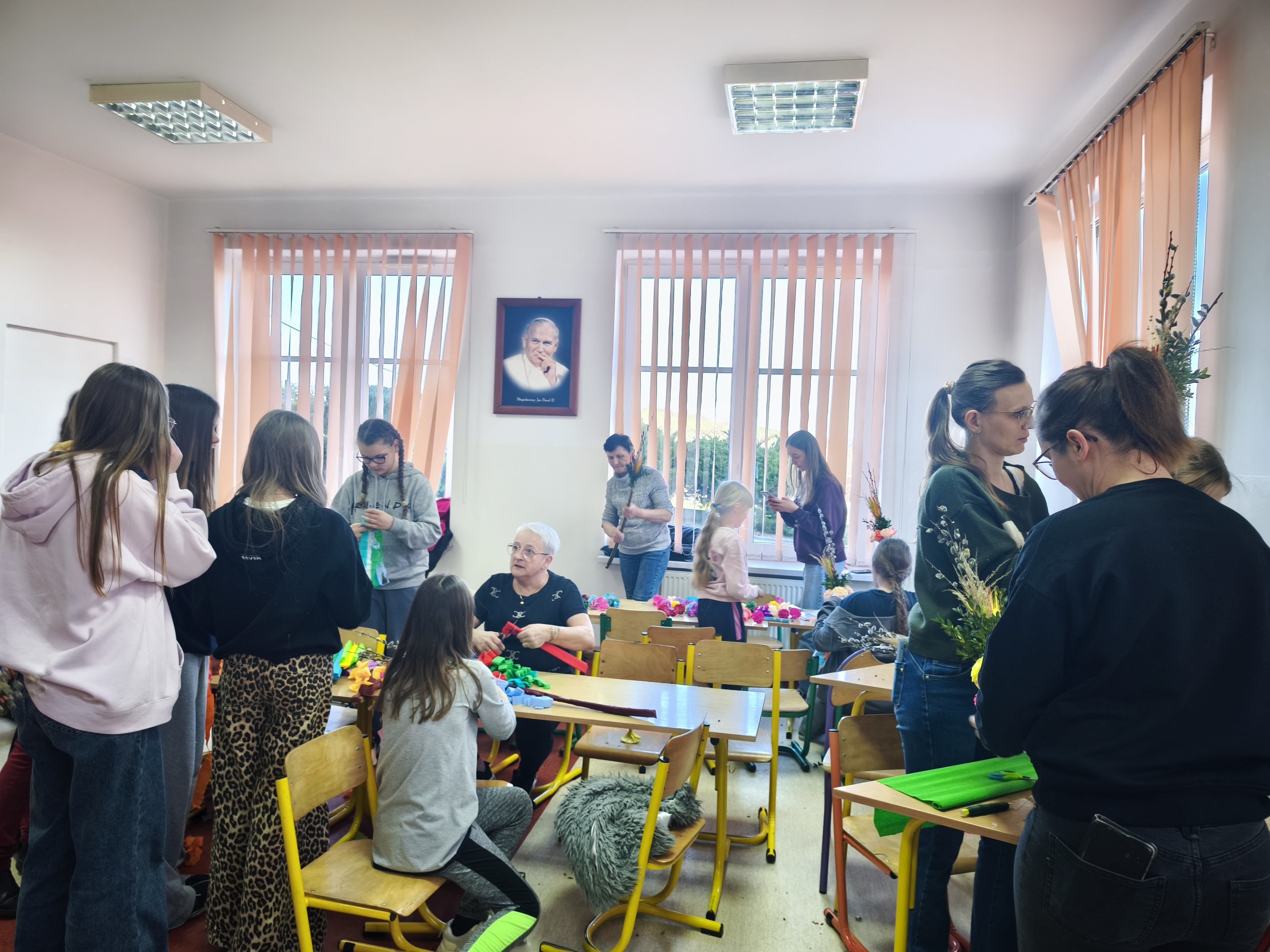 Prawdziwa kulminacja tych działań nastąpiła 18 marca. Tego dnia szkolna jadalnia zamieniła się w tętniącą życiem pracownię rękodzieła. Przy wspólnych stołach zasiedli uczniowie, nauczyciele, pracownicy szkoły oraz rodzice i babcie. Ta niezwykła, międzypokoleniowa integracja przyniosła wspaniałe efekty – wspólnymi siłami udało się stworzyć aż 150 przepięknych, starannie wykonanych palm wielkanocnych! Każda z nich była unikalna, stworzona z dbałością o najmniejszy detal i – co najważniejsze – z dobrą intencją.