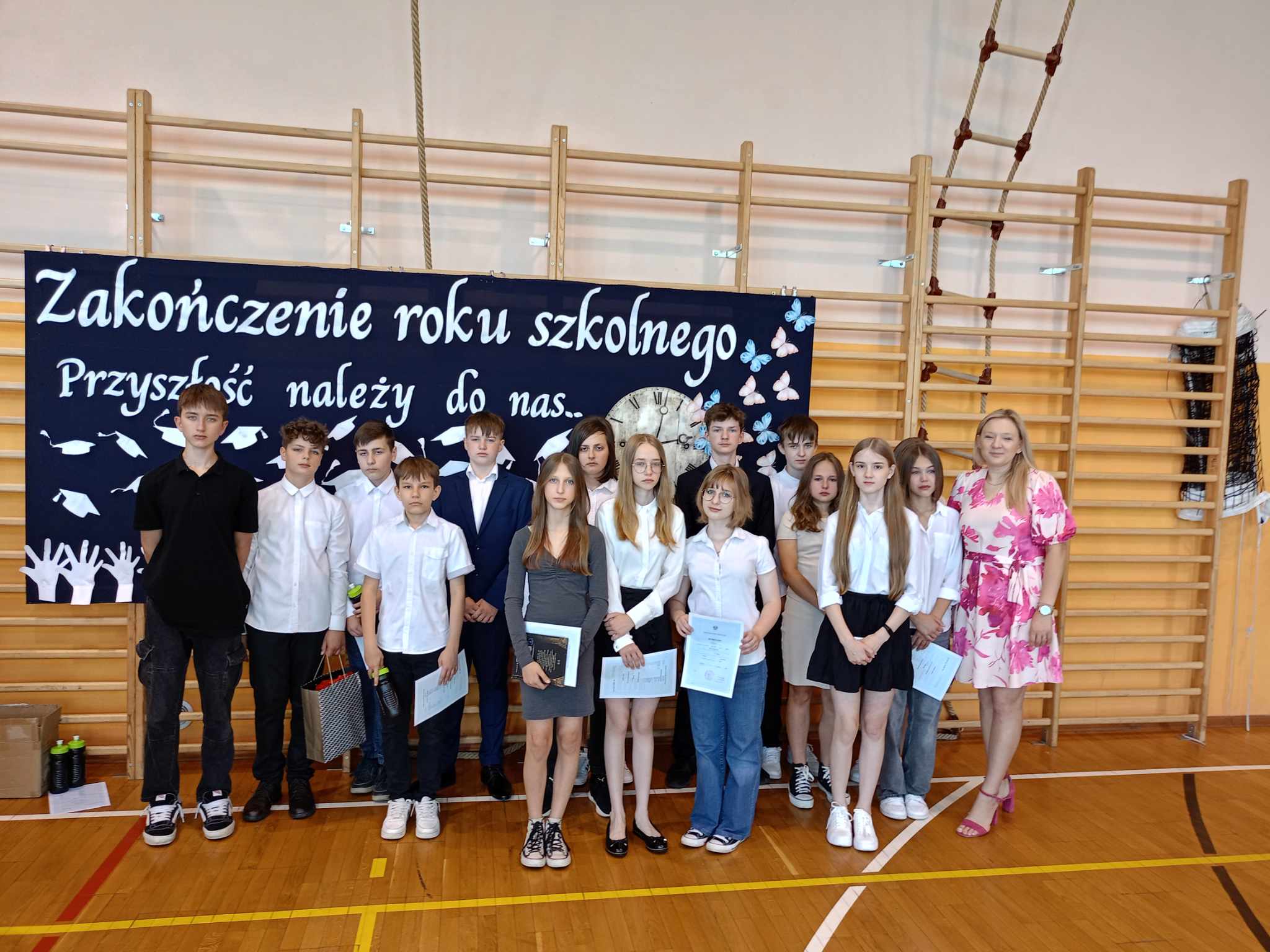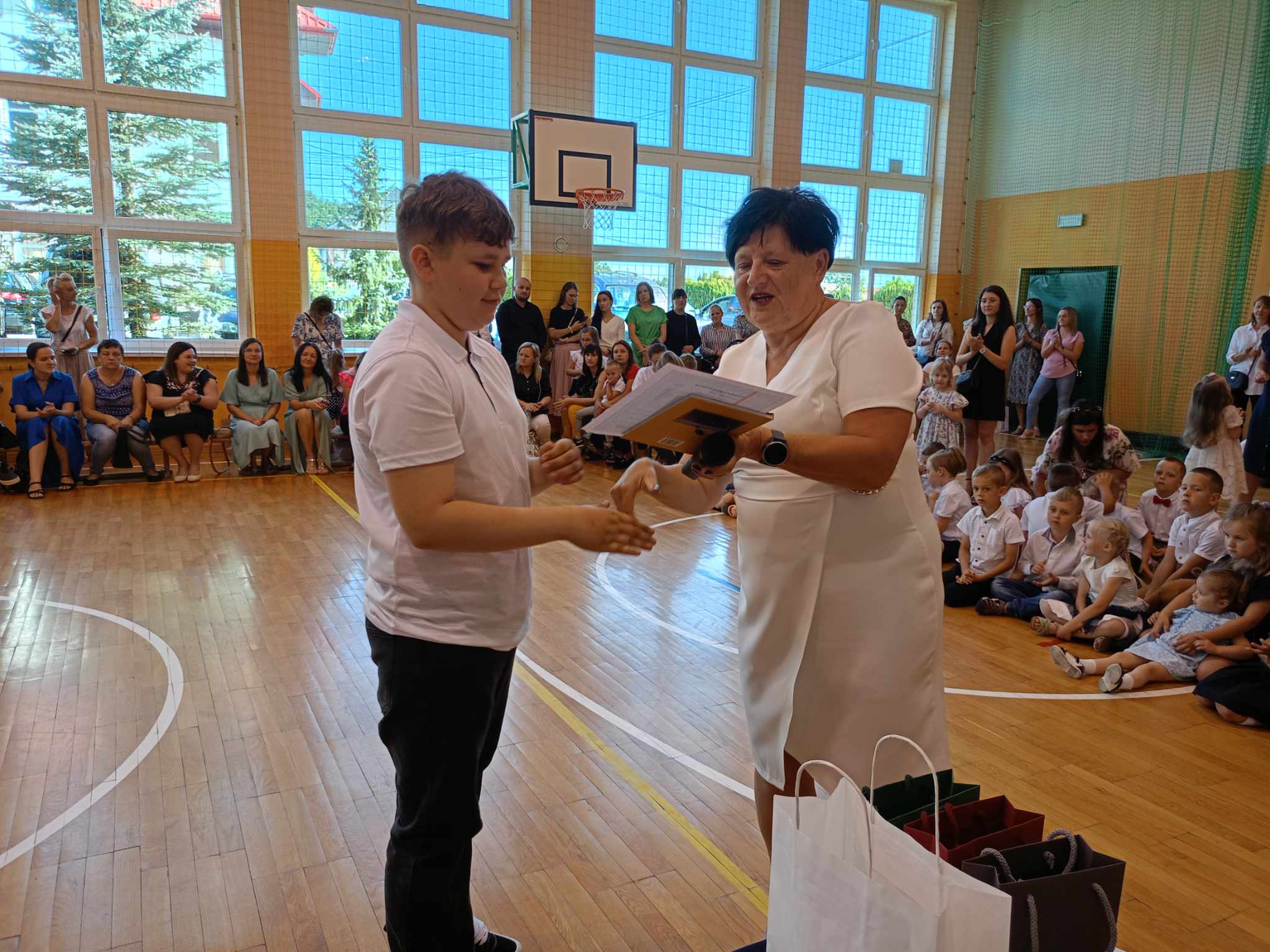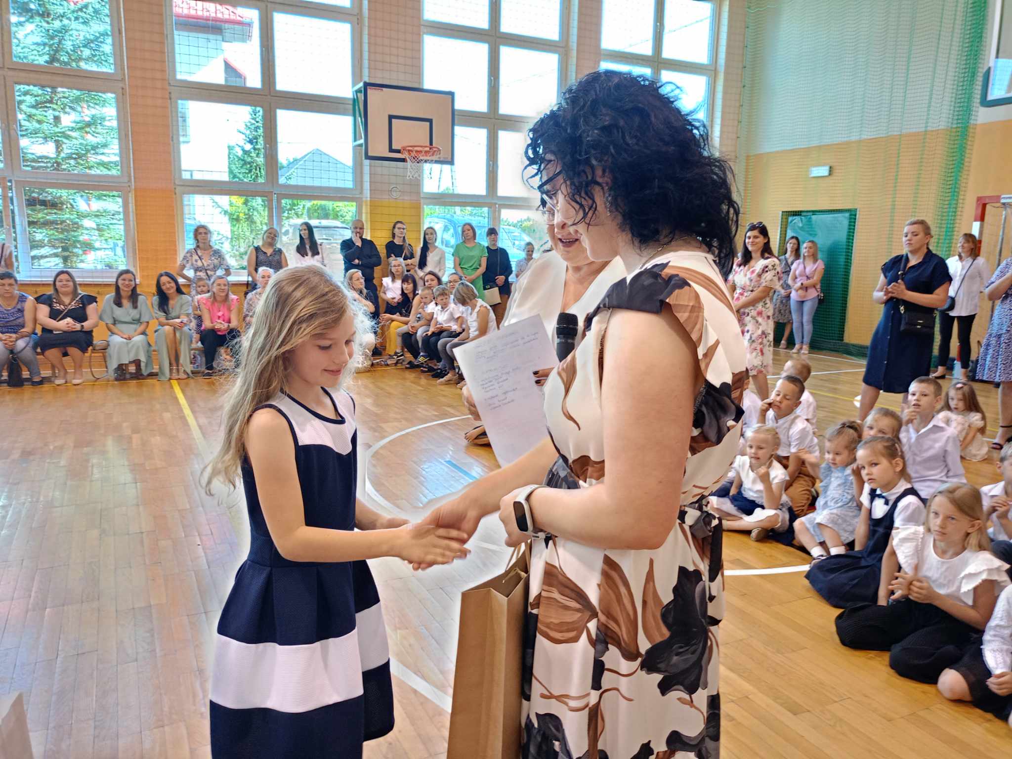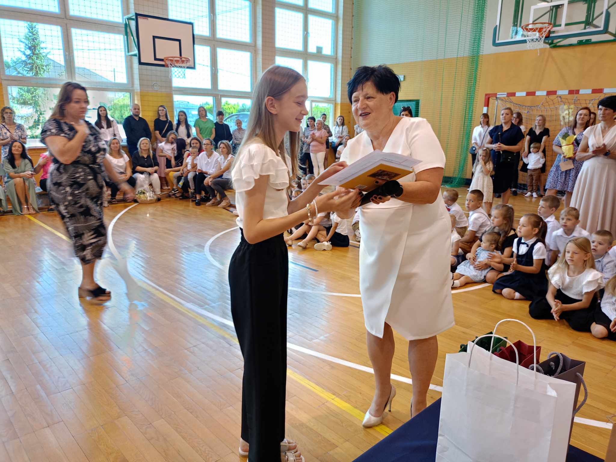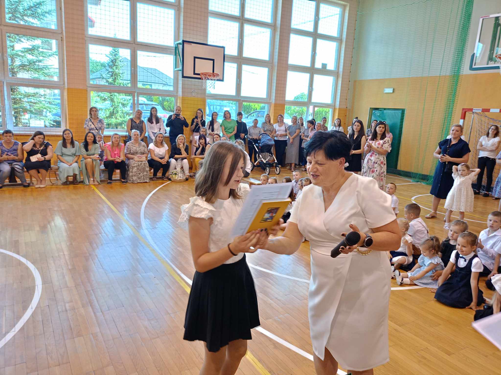 21 czerwca 2024 roku odbyło się uroczyste zakończenie roku szkolnego 2023/2024 i pożegnanie 17 absolwentów klasy ósmej. Pani Dyrektor podziękowała wszystkim za ciężką pracę i pogratulowała osiągniętych wyników. Z jej rąk świadectwa i nagrody książkowe otrzymali uczniowie mający bardzo wysokie wyniki w nauce, a ich rodzicom wręczyła listy gratulacyjne. W części artystycznej klasa ósma pożegnała się z nauczycielami, koleżankami, kolegami. Były kwiaty oraz słowa „dziękuję” i „przepraszam”. Wszystko to sprawiało, że niejedna osoba, ta żegnająca i ta żegnana, uroniła łezkę żalu. W imieniu społeczności szkolnej swoich starszych kolegów pożegnali uczniowie klasy VII, obdarowując ich drobnymi prezentami i życzeniami powodzenia na nowym etapie życia.