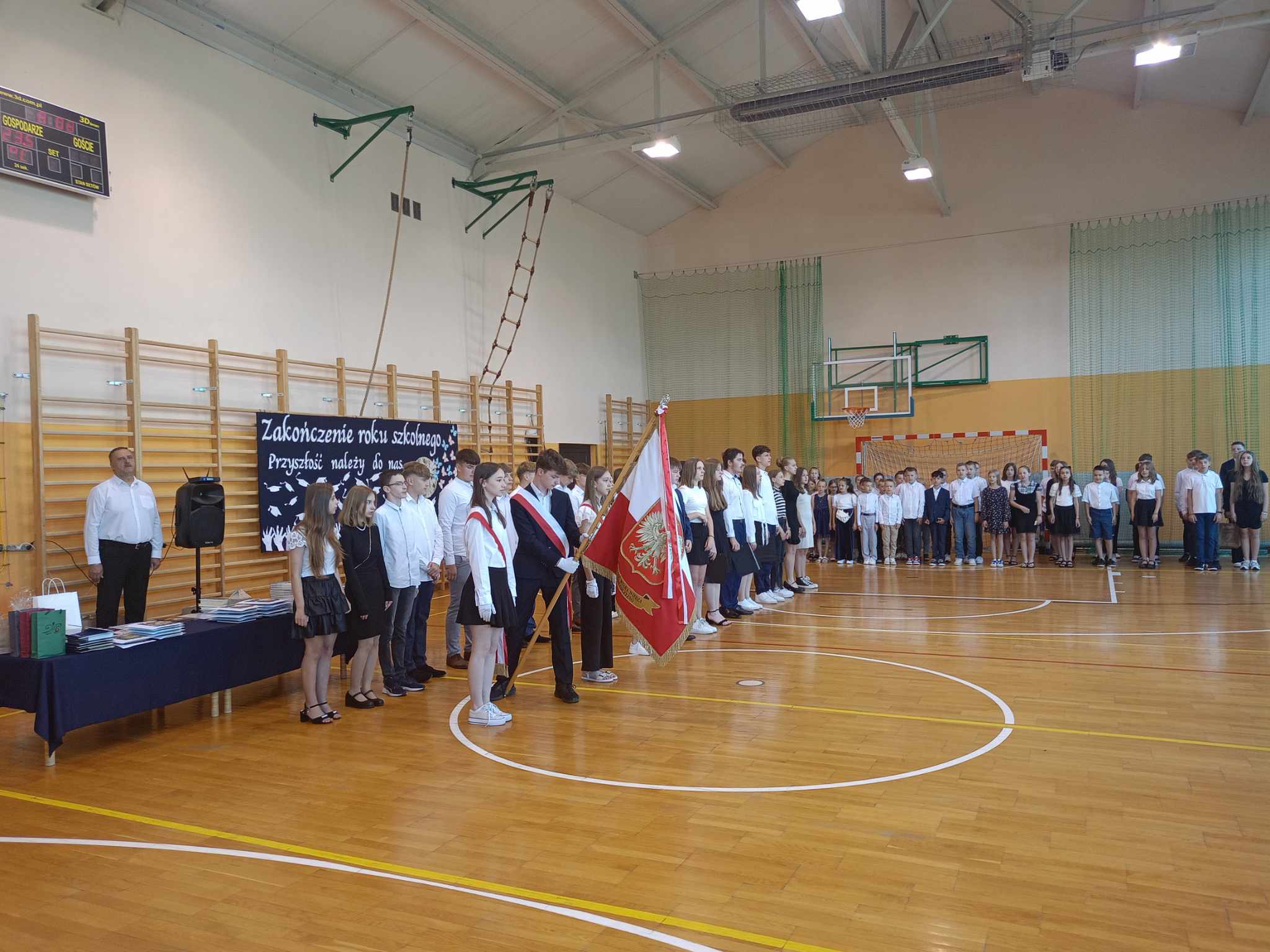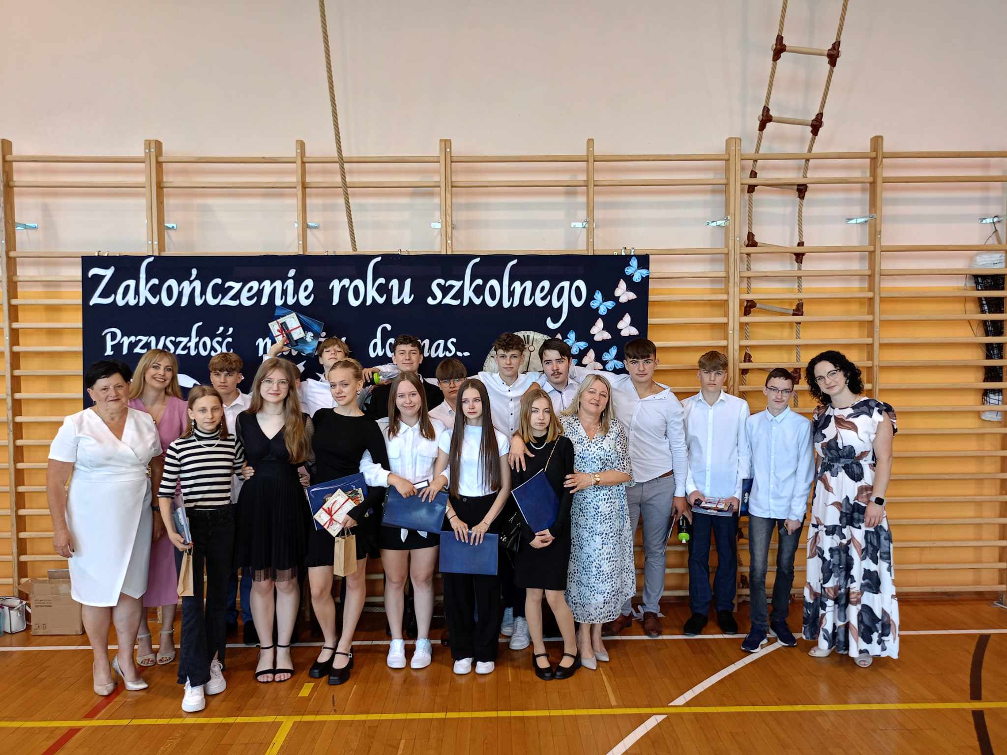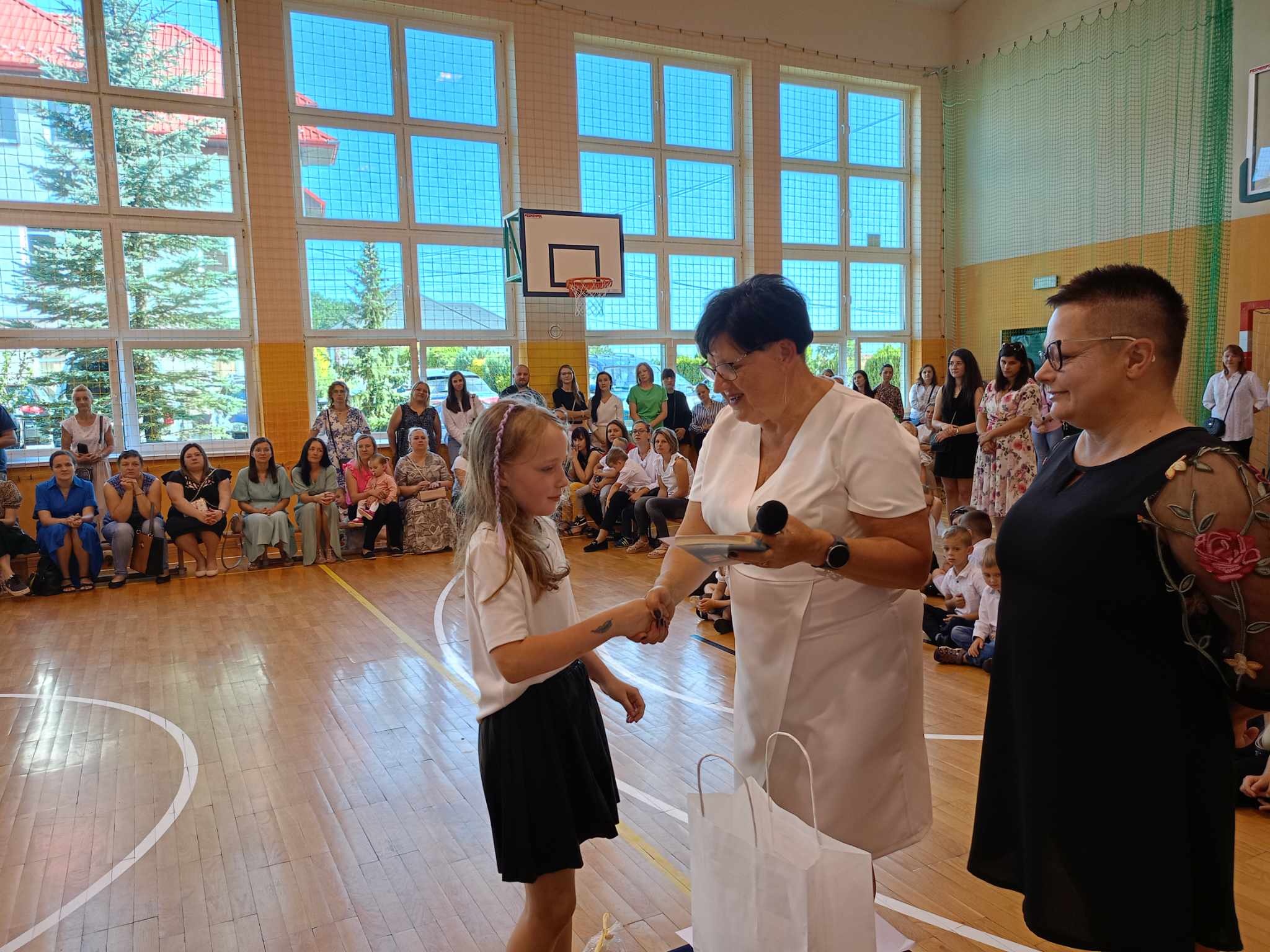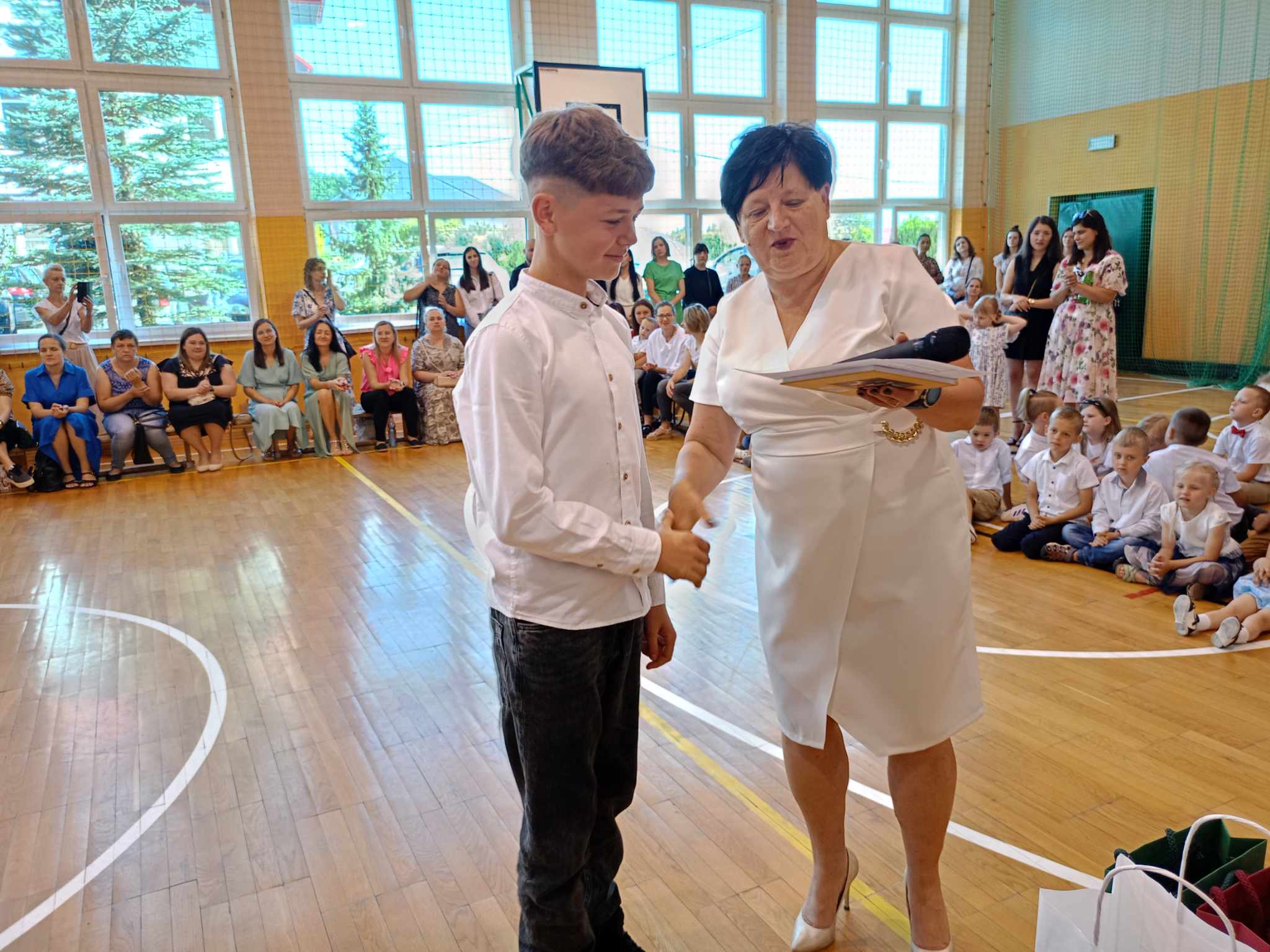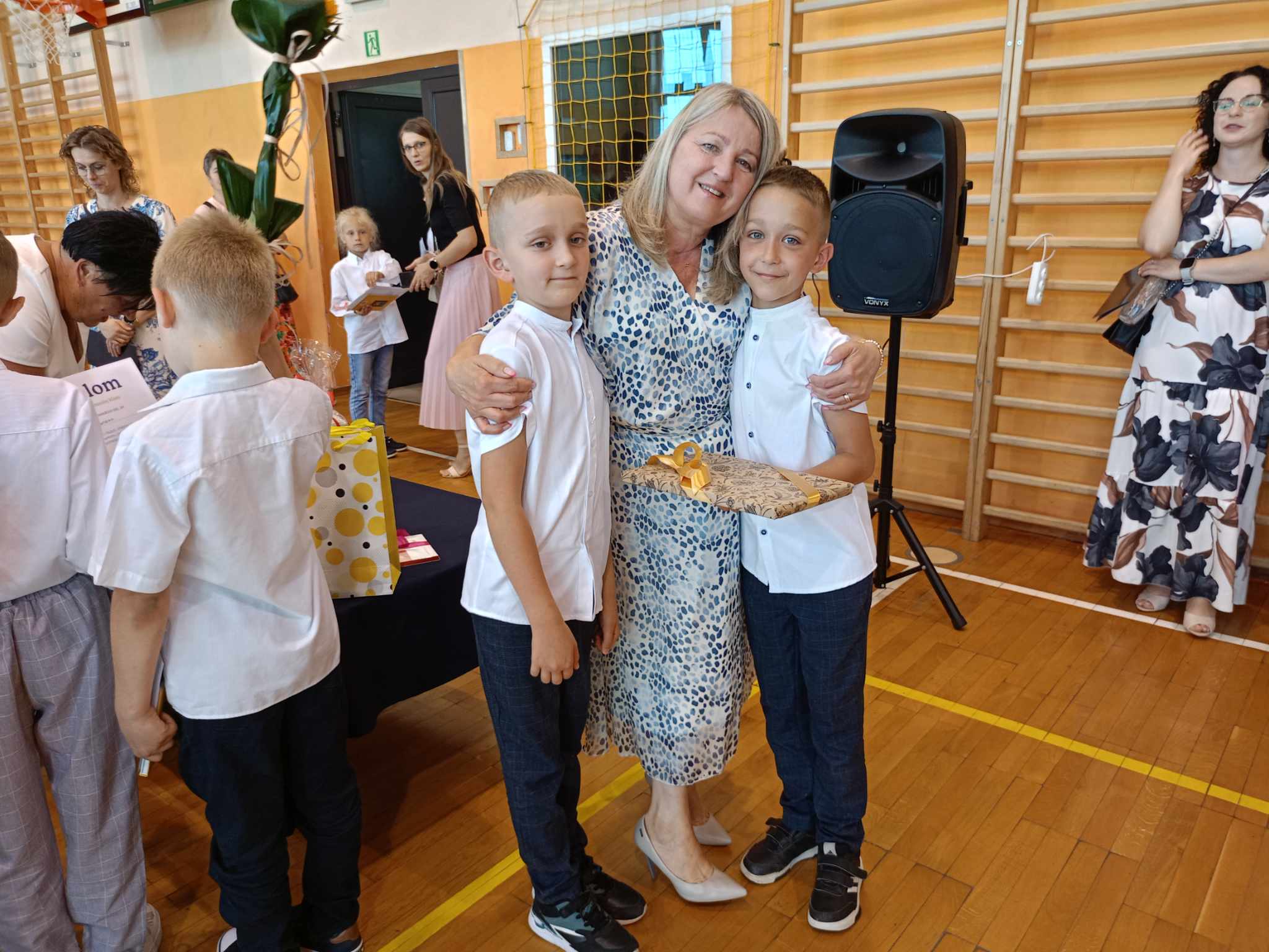 21 czerwca 2024 roku odbyło się uroczyste zakończenie roku szkolnego 2023/2024 i pożegnanie 17 absolwentów klasy ósmej. Pani Dyrektor podziękowała wszystkim za ciężką pracę i pogratulowała osiągniętych wyników. Z jej rąk świadectwa i nagrody książkowe otrzymali uczniowie mający bardzo wysokie wyniki w nauce, a ich rodzicom wręczyła listy gratulacyjne. W części artystycznej klasa ósma pożegnała się z nauczycielami, koleżankami, kolegami. Były kwiaty oraz słowa „dziękuję” i „przepraszam”. Wszystko to sprawiało, że niejedna osoba, ta żegnająca i ta żegnana, uroniła łezkę żalu. W imieniu społeczności szkolnej swoich starszych kolegów pożegnali uczniowie klasy VII, obdarowując ich drobnymi prezentami i życzeniami powodzenia na nowym etapie życia.