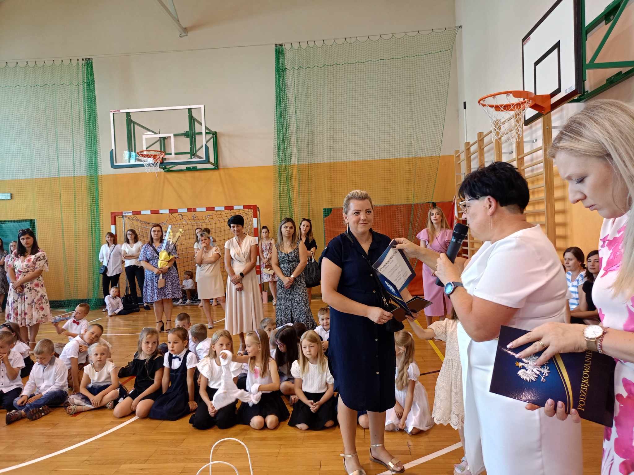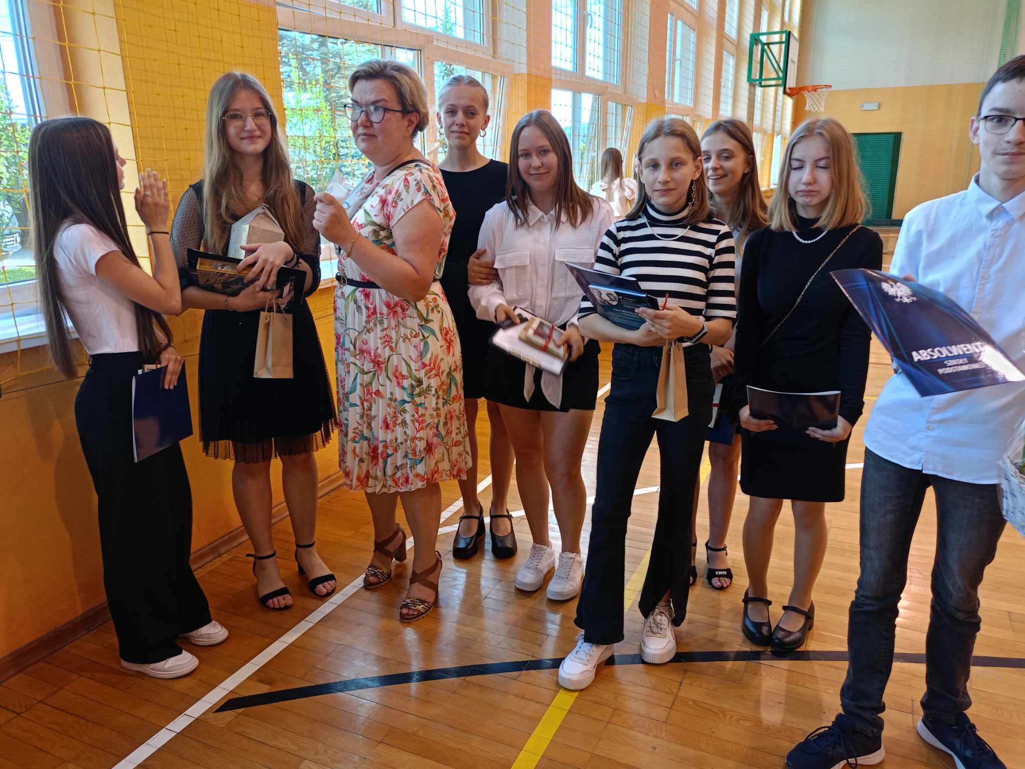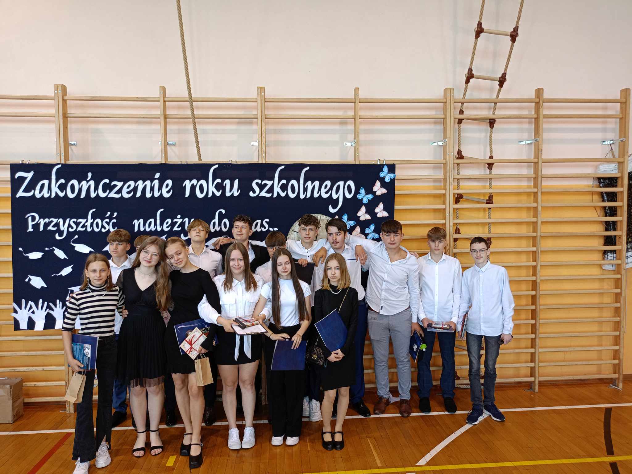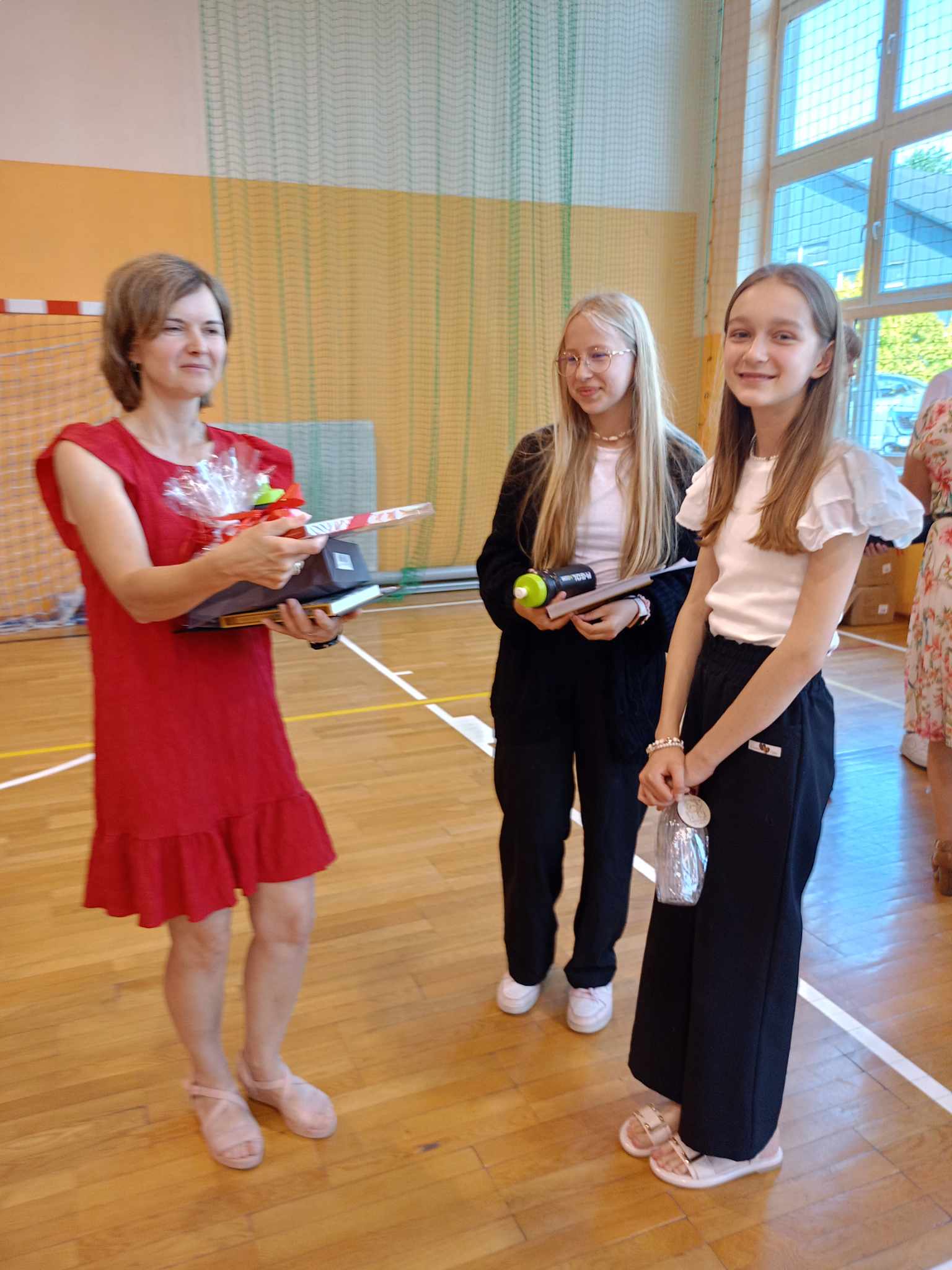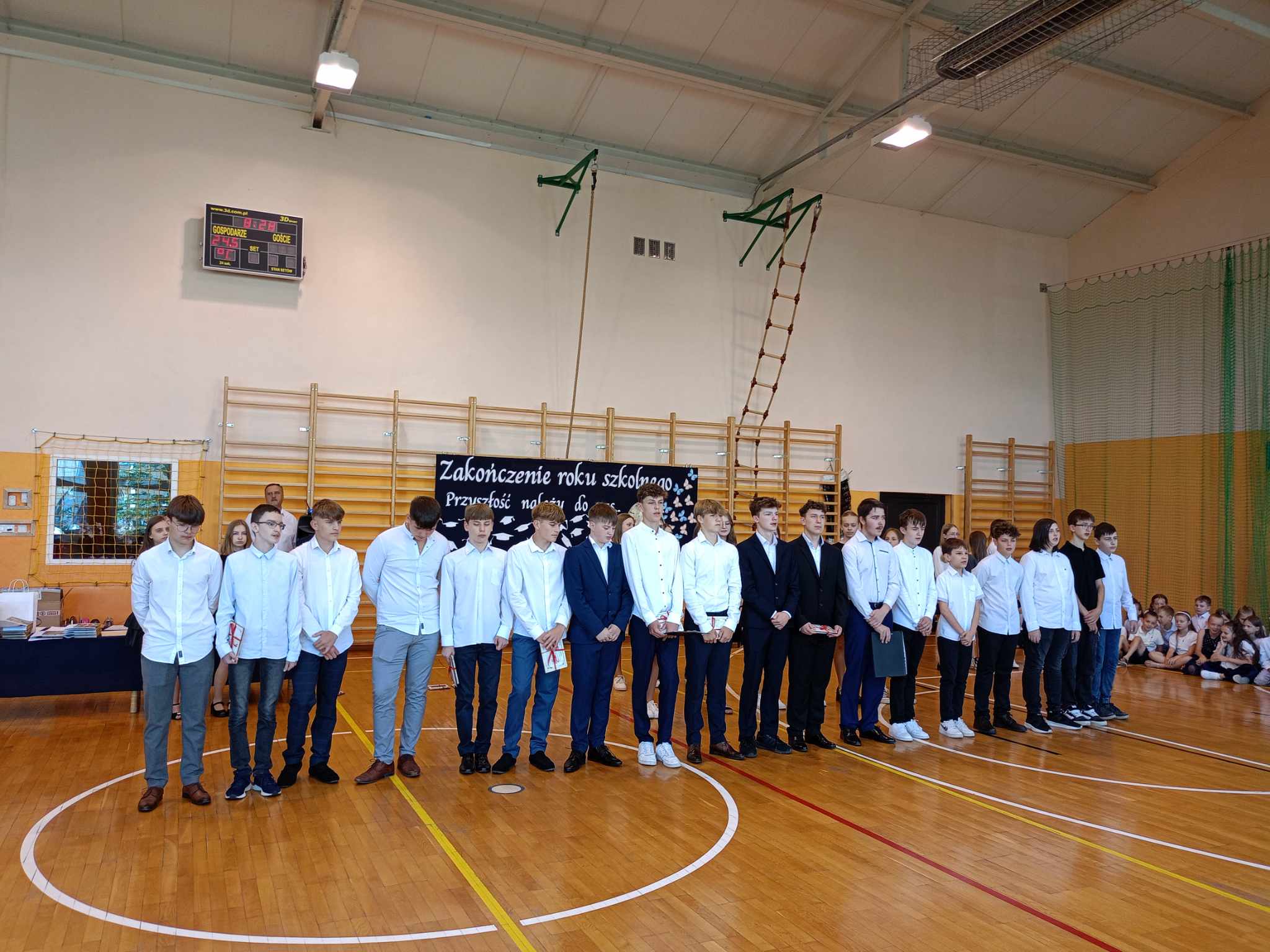 21 czerwca 2024 roku odbyło się uroczyste zakończenie roku szkolnego 2023/2024 i pożegnanie 17 absolwentów klasy ósmej. Pani Dyrektor podziękowała wszystkim za ciężką pracę i pogratulowała osiągniętych wyników. Z jej rąk świadectwa i nagrody książkowe otrzymali uczniowie mający bardzo wysokie wyniki w nauce, a ich rodzicom wręczyła listy gratulacyjne. W części artystycznej klasa ósma pożegnała się z nauczycielami, koleżankami, kolegami. Były kwiaty oraz słowa „dziękuję” i „przepraszam”. Wszystko to sprawiało, że niejedna osoba, ta żegnająca i ta żegnana, uroniła łezkę żalu. W imieniu społeczności szkolnej swoich starszych kolegów pożegnali uczniowie klasy VII, obdarowując ich drobnymi prezentami i życzeniami powodzenia na nowym etapie życia.