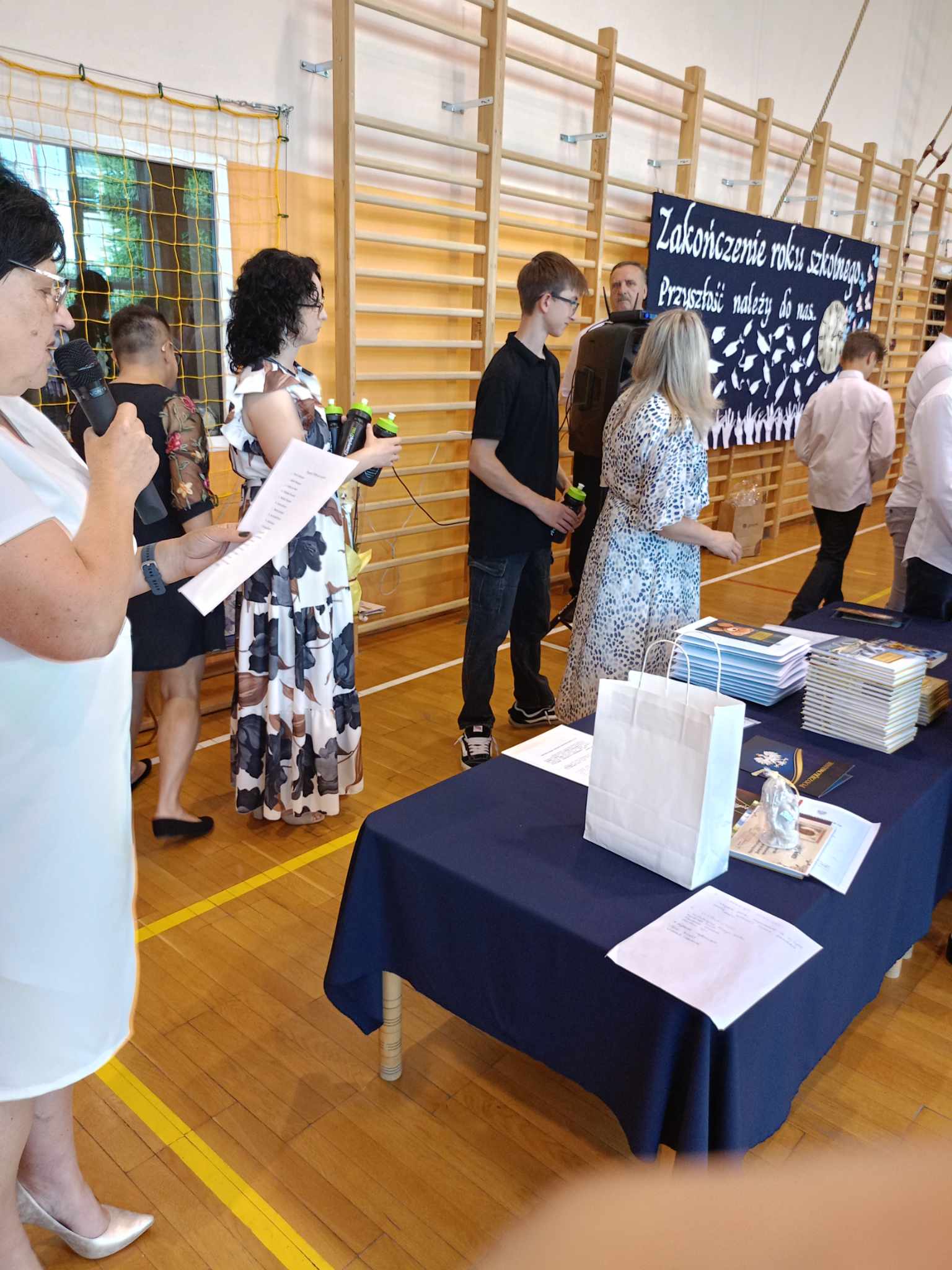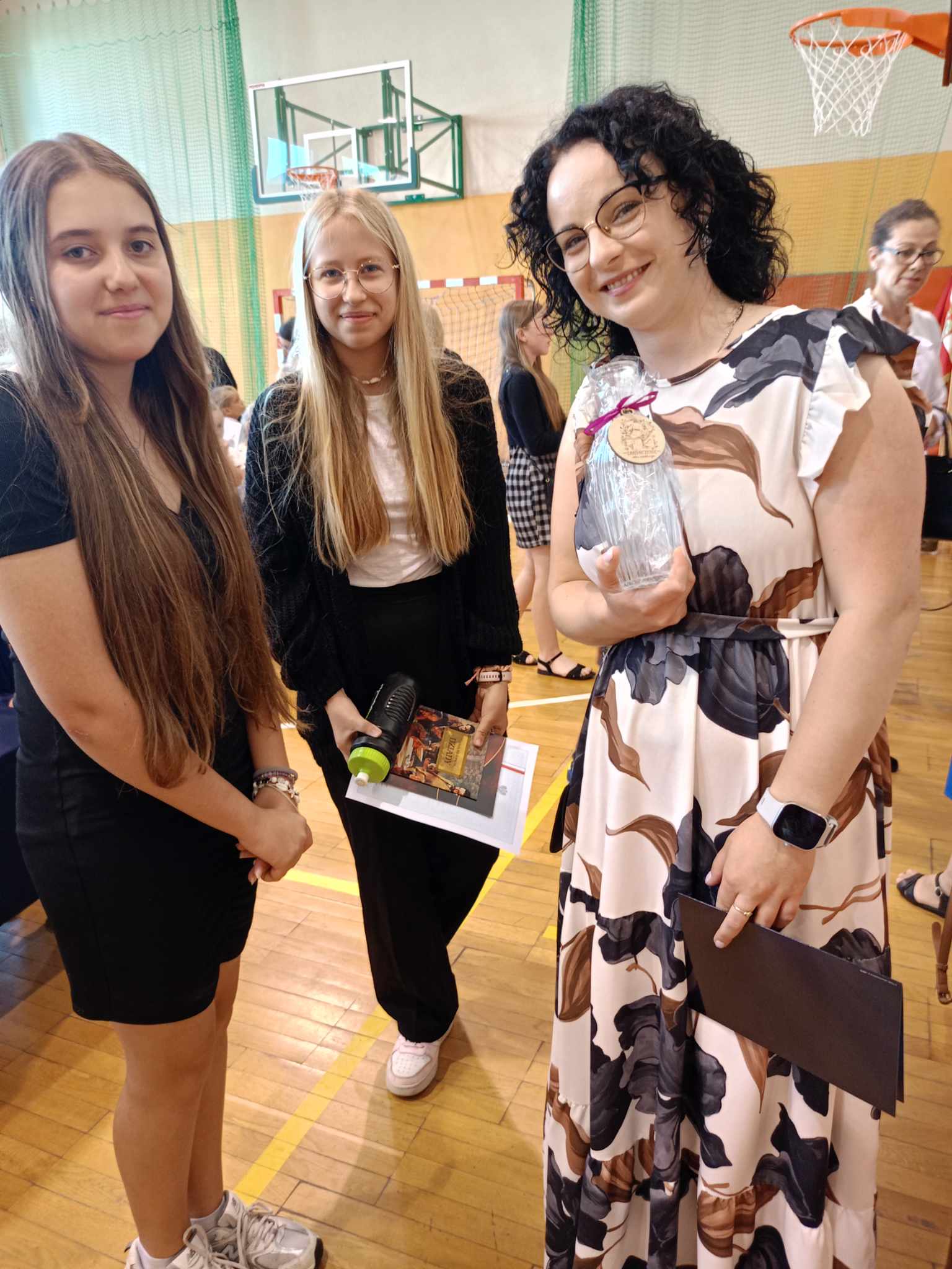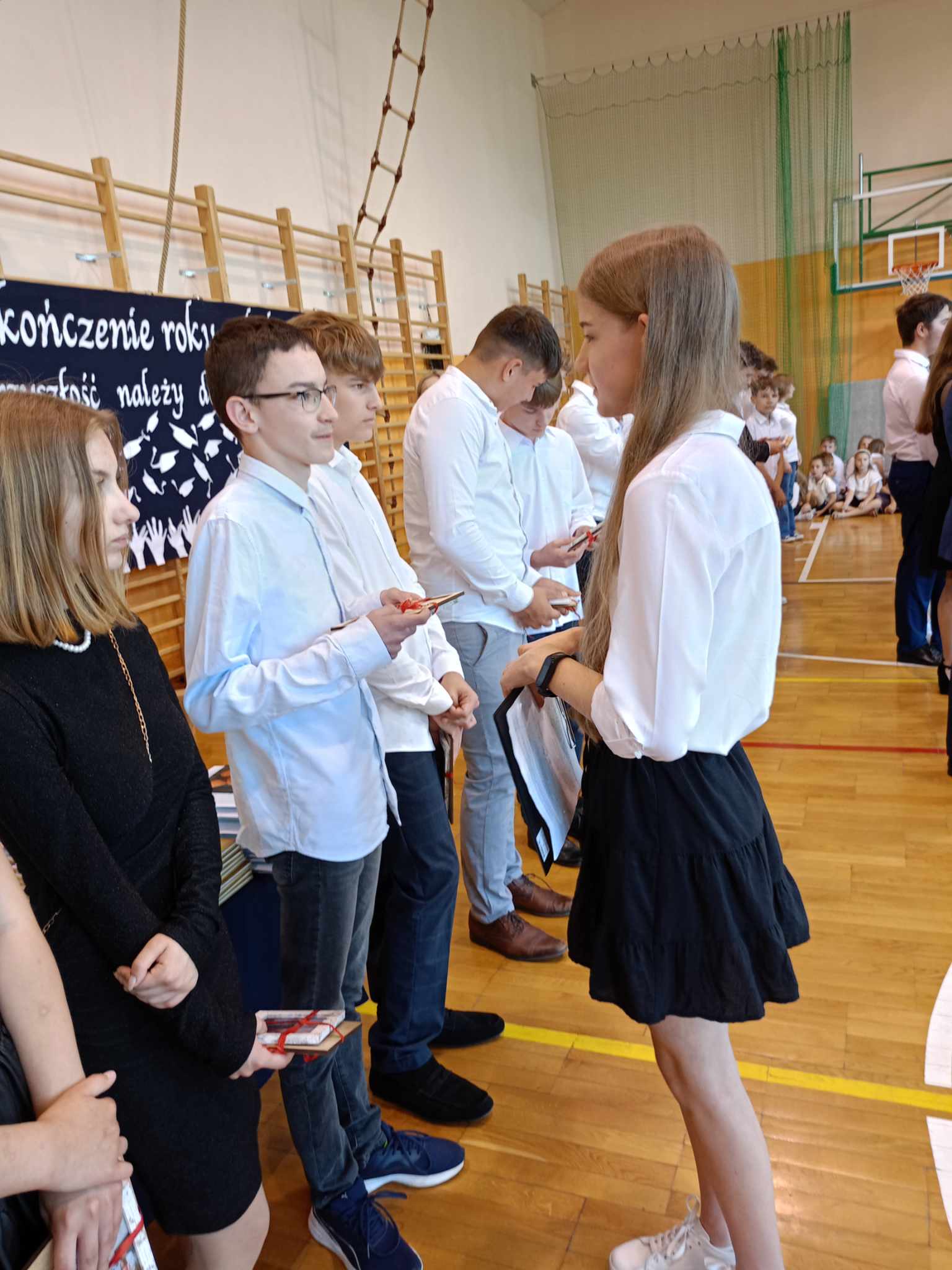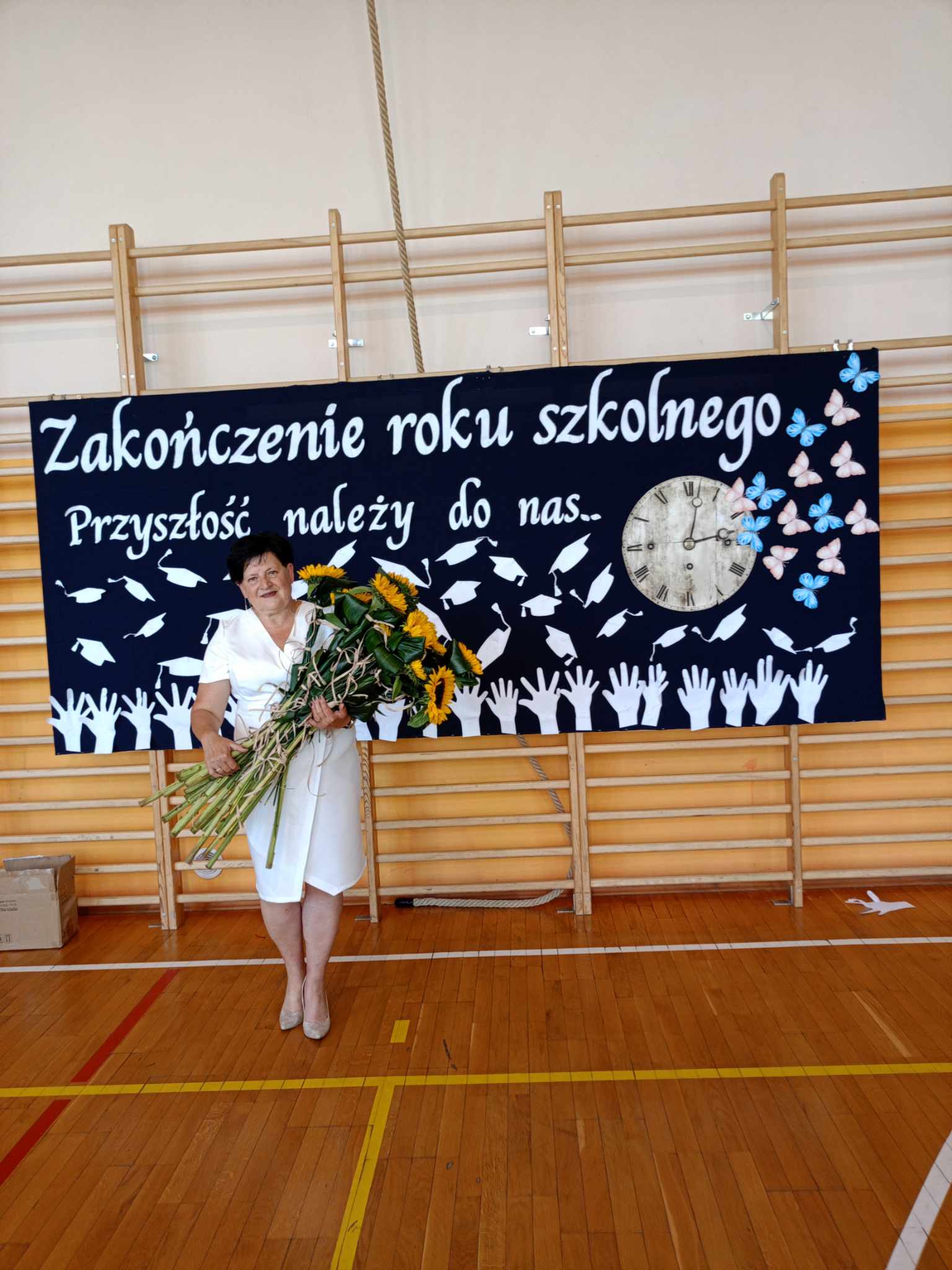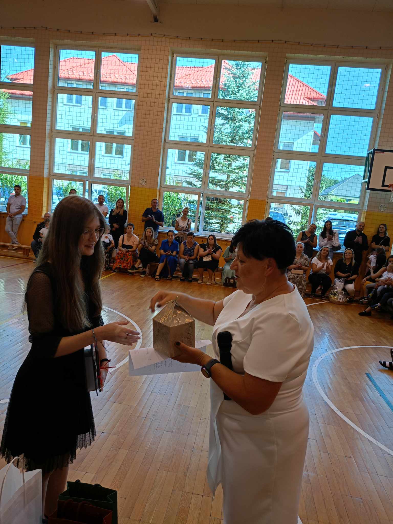 21 czerwca 2024 roku odbyło się uroczyste zakończenie roku szkolnego 2023/2024 i pożegnanie 17 absolwentów klasy ósmej. Pani Dyrektor podziękowała wszystkim za ciężką pracę i pogratulowała osiągniętych wyników. Z jej rąk świadectwa i nagrody książkowe otrzymali uczniowie mający bardzo wysokie wyniki w nauce, a ich rodzicom wręczyła listy gratulacyjne. W części artystycznej klasa ósma pożegnała się z nauczycielami, koleżankami, kolegami. Były kwiaty oraz słowa „dziękuję” i „przepraszam”. Wszystko to sprawiało, że niejedna osoba, ta żegnająca i ta żegnana, uroniła łezkę żalu. W imieniu społeczności szkolnej swoich starszych kolegów pożegnali uczniowie klasy VII, obdarowując ich drobnymi prezentami i życzeniami powodzenia na nowym etapie życia.