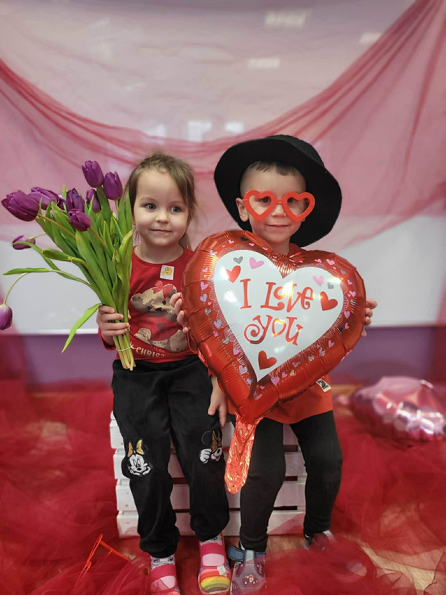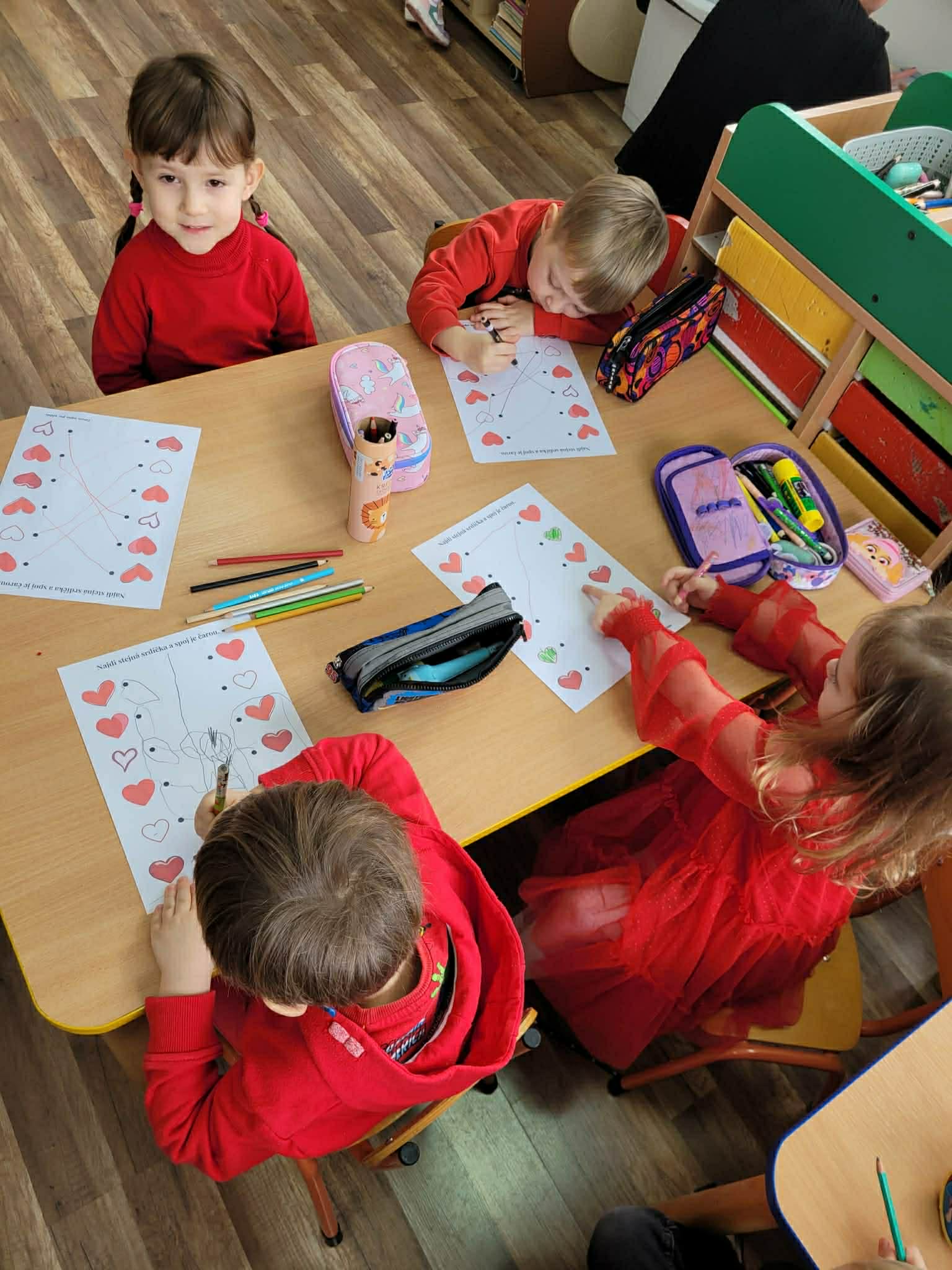 Maluszki i starszaki również świętowały. Pozowały z wielką radością do zdjęć przy walentynkowej ściance, a uśmiechy nie schodziły im z twarzy. Nie zabrakło, także kreatywnych aktywności plastycznych. Przedszkolaki wykonywały piękne prace – wyklejały serca z plasteliny, rysowały po śladzie, wycinały oraz ozdabiały walentynkowe kształty.