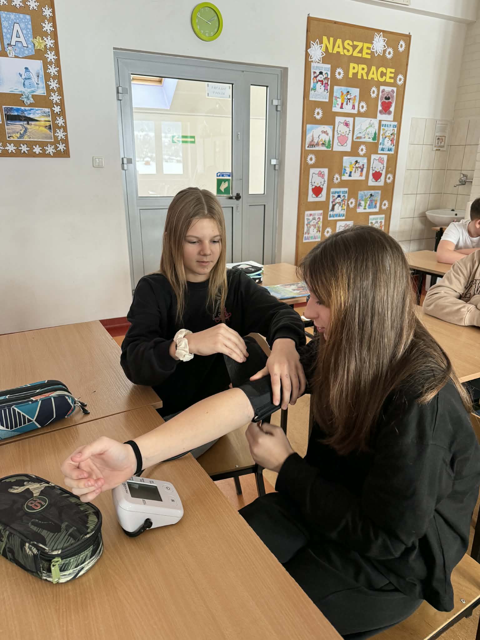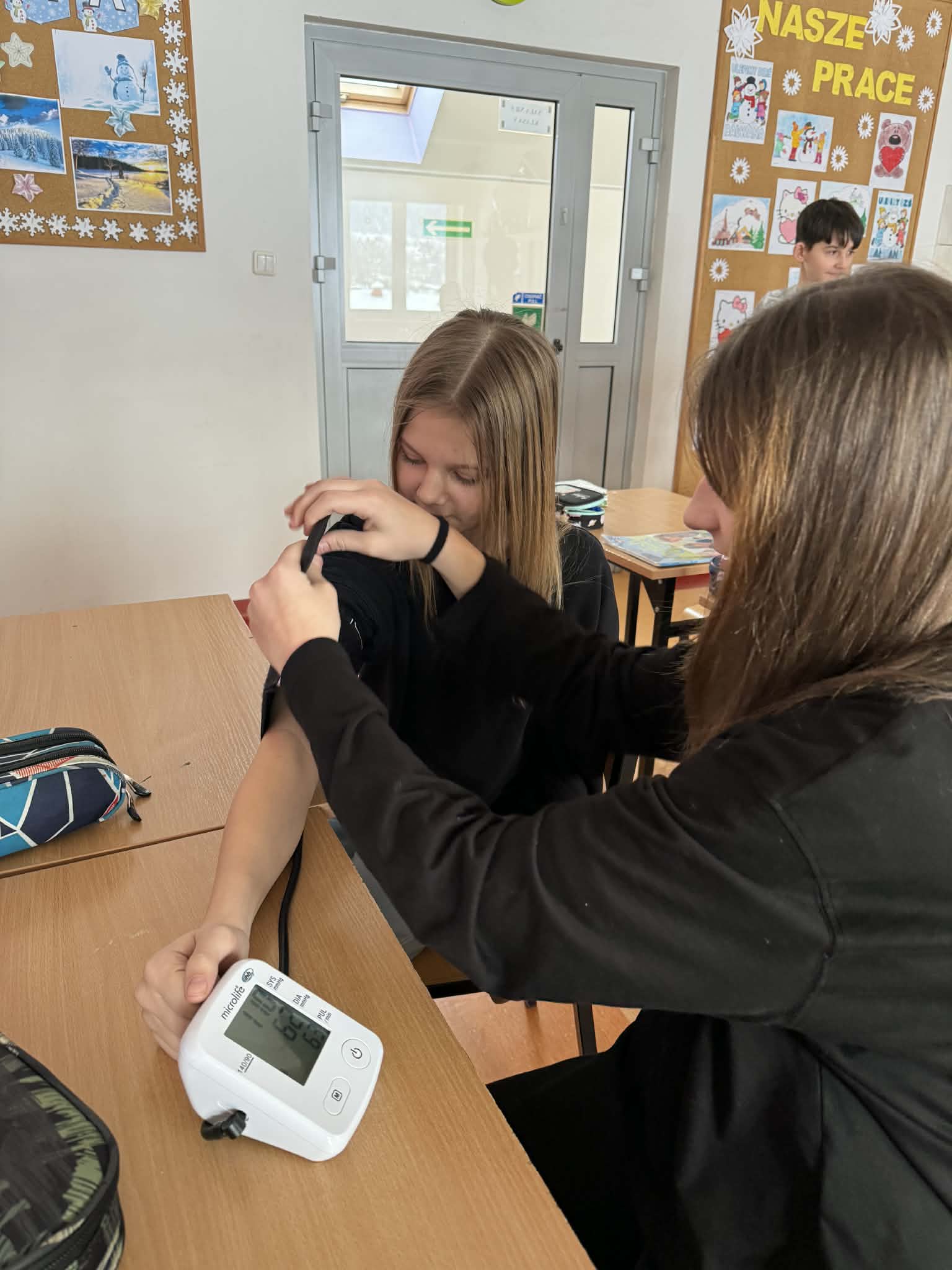 Szkolna pielęgniarka przeprowadziła w starszych klasach akcję edukacyjną, podczas której uczniowie obejrzeli filmik dotyczący pracy serca oraz mogli dowiedzieć się, jak dbać o układ krążenia. Chętni uczniowie mieli również możliwość zmierzenia ciśnienia oraz tętna.