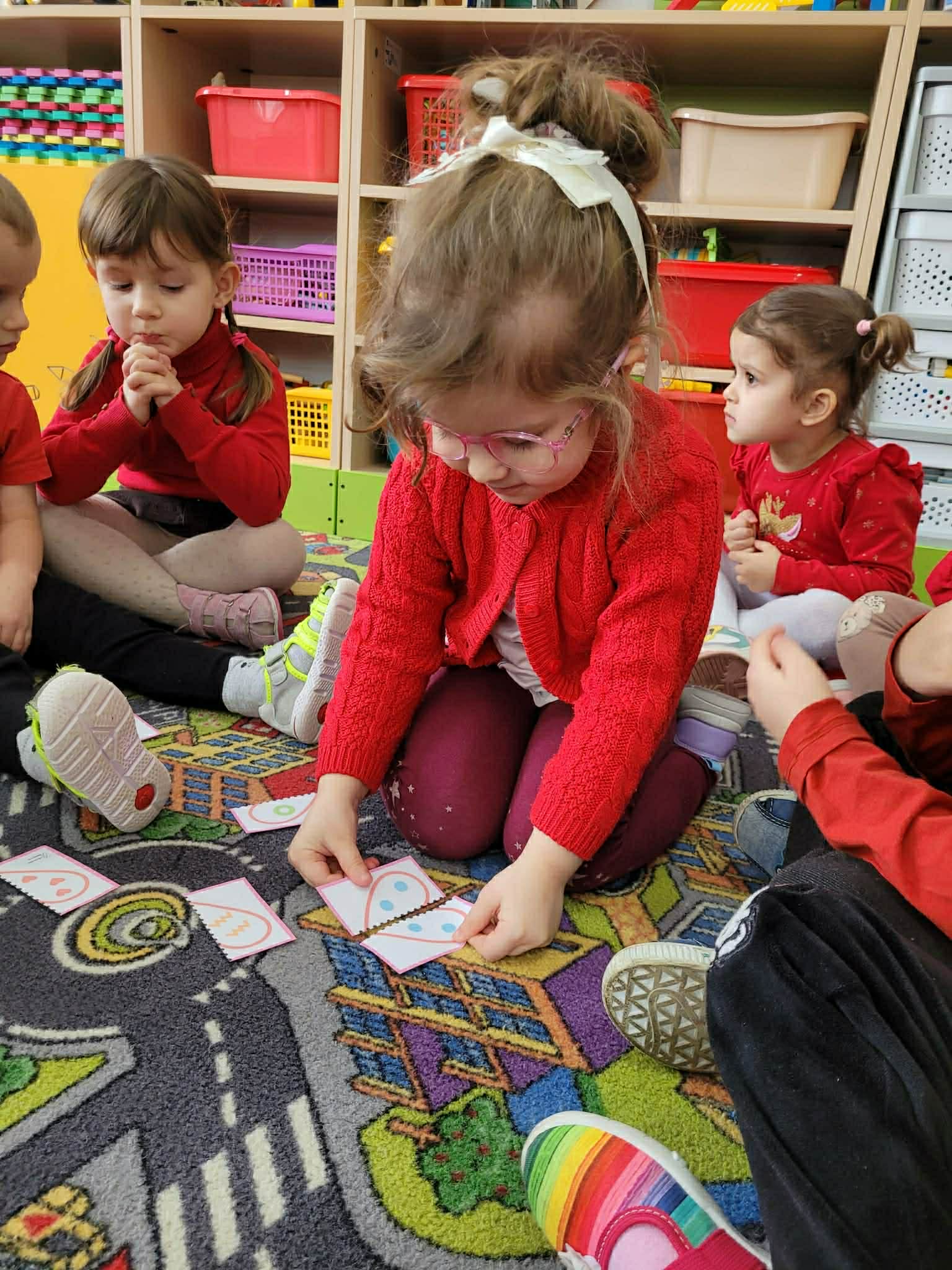 Podczas zajęć edukacyjnych dzieci łączyły serca w pary – dopasowywały dwie połówki, łączyły cyfry z odpowiednią liczbą serduszek, a także dobierały sylaby, tworząc poprawne pary. Było to doskonałe połączenie zabawy i nauki.