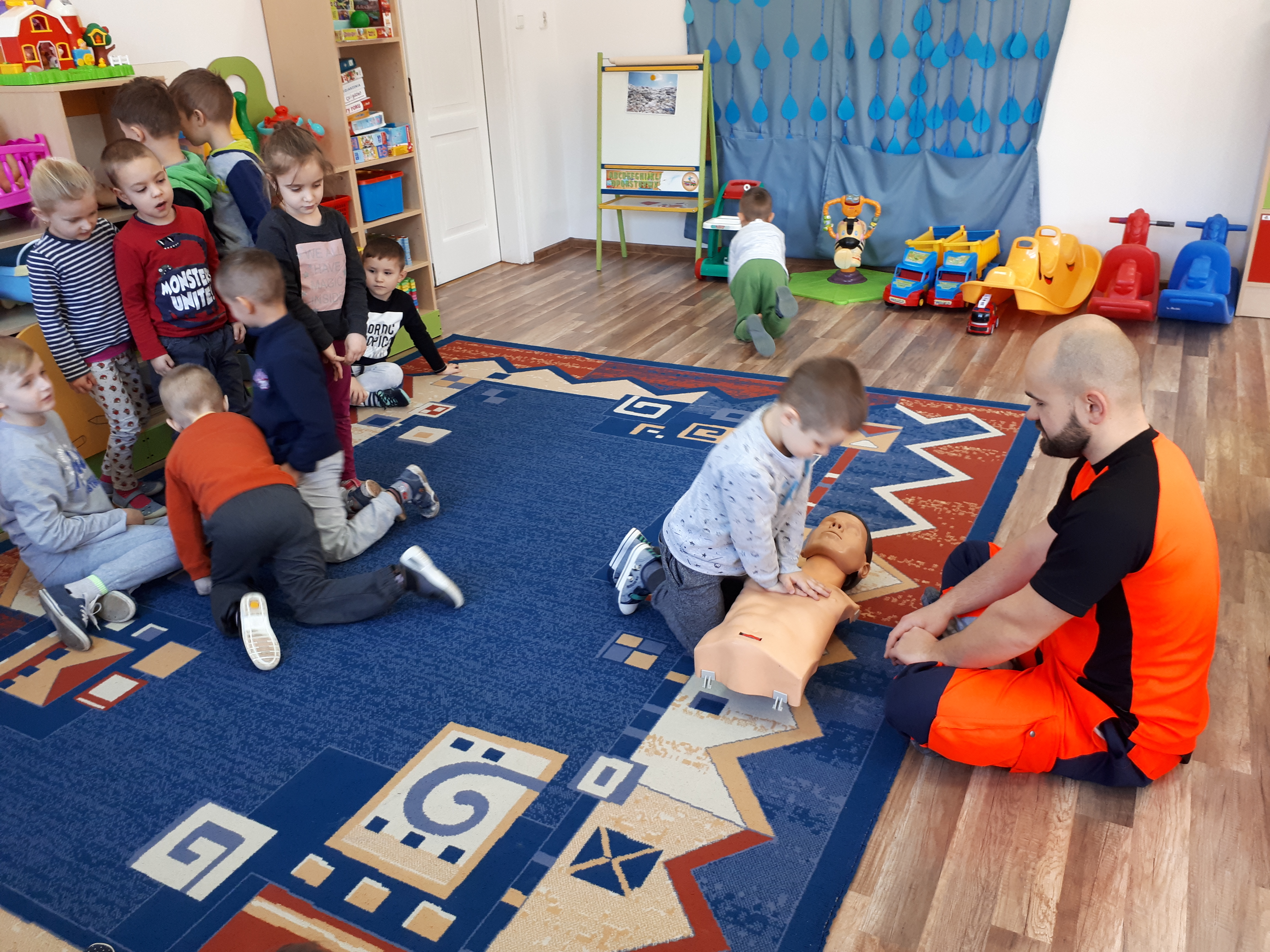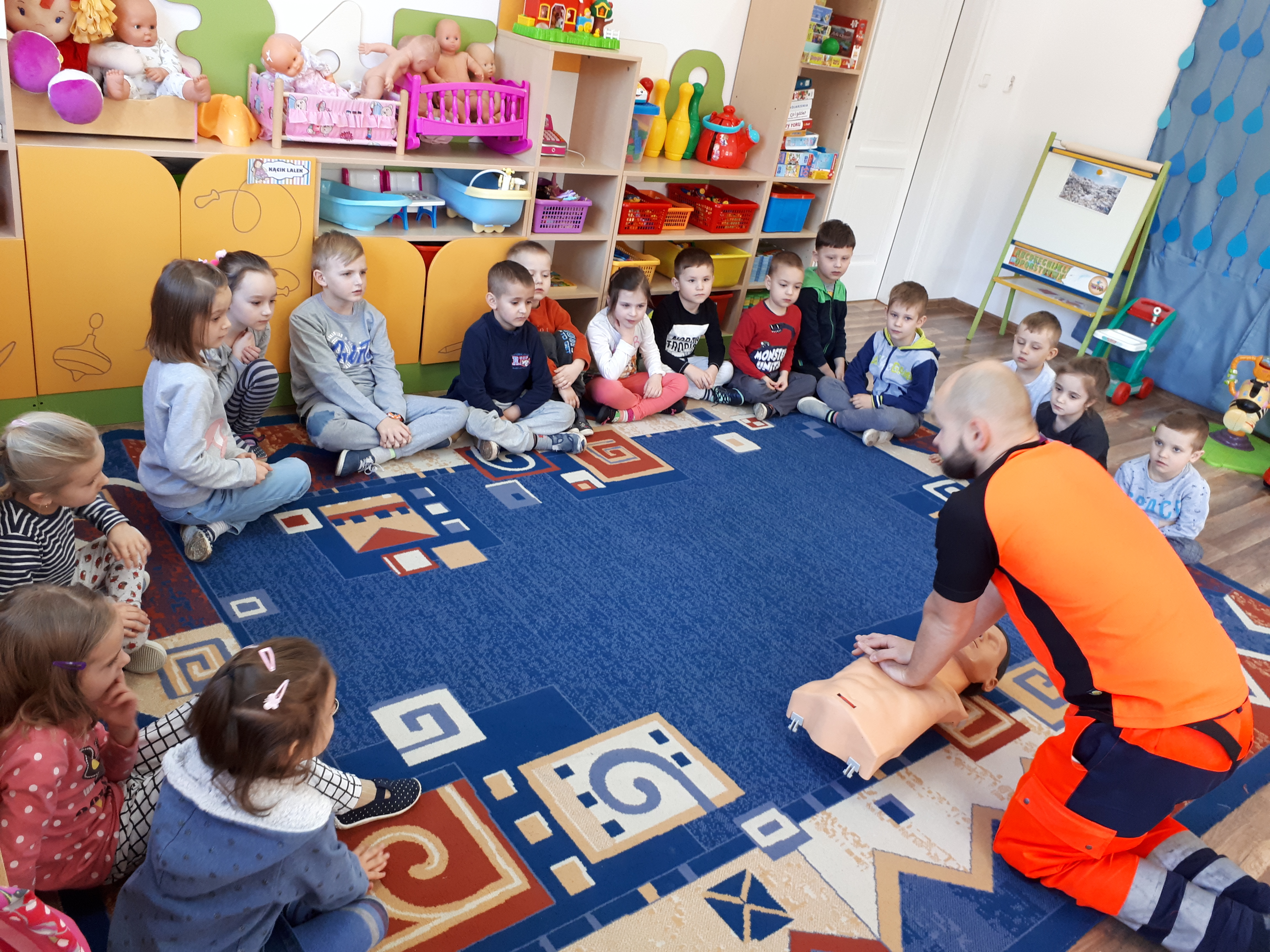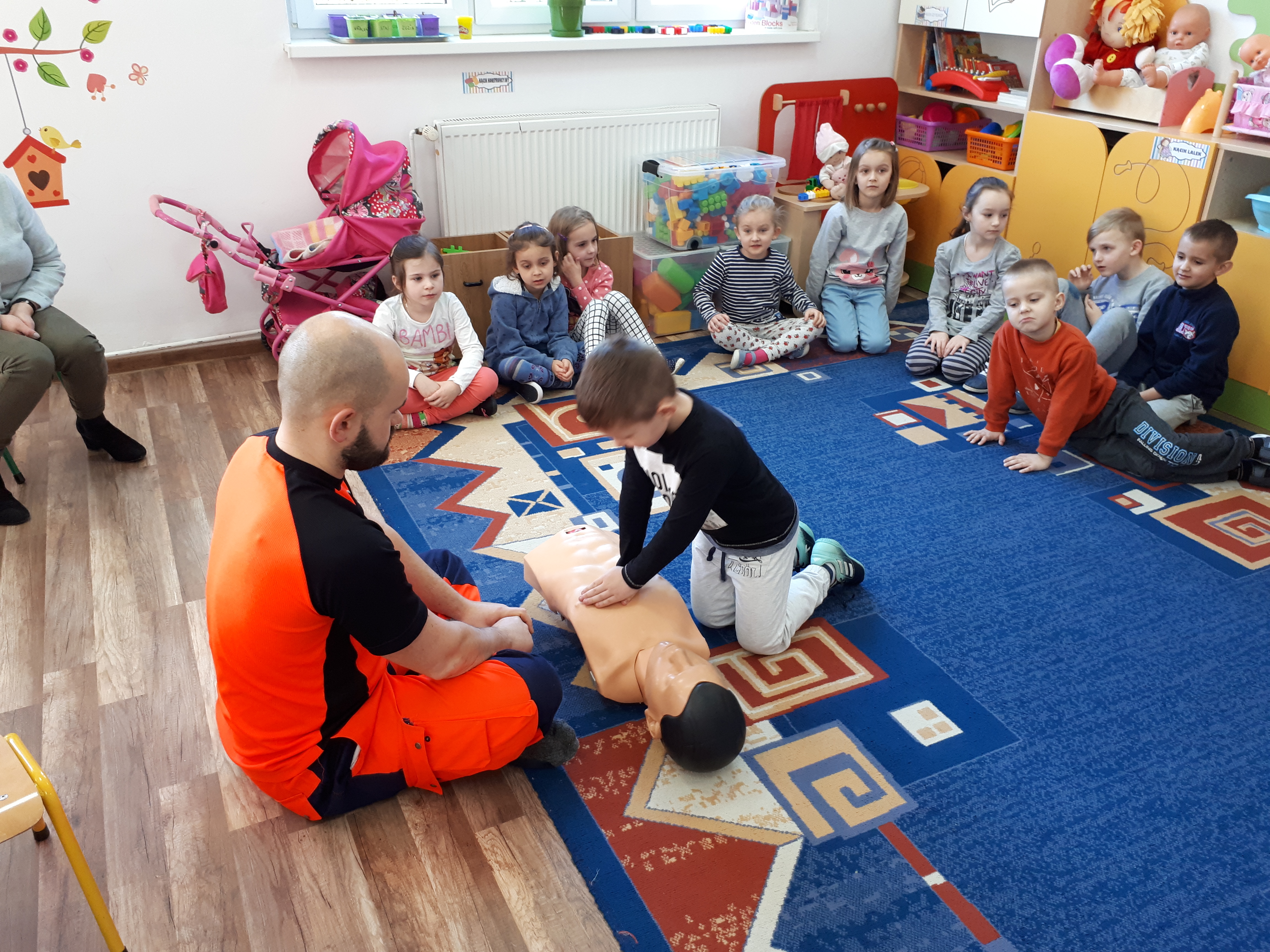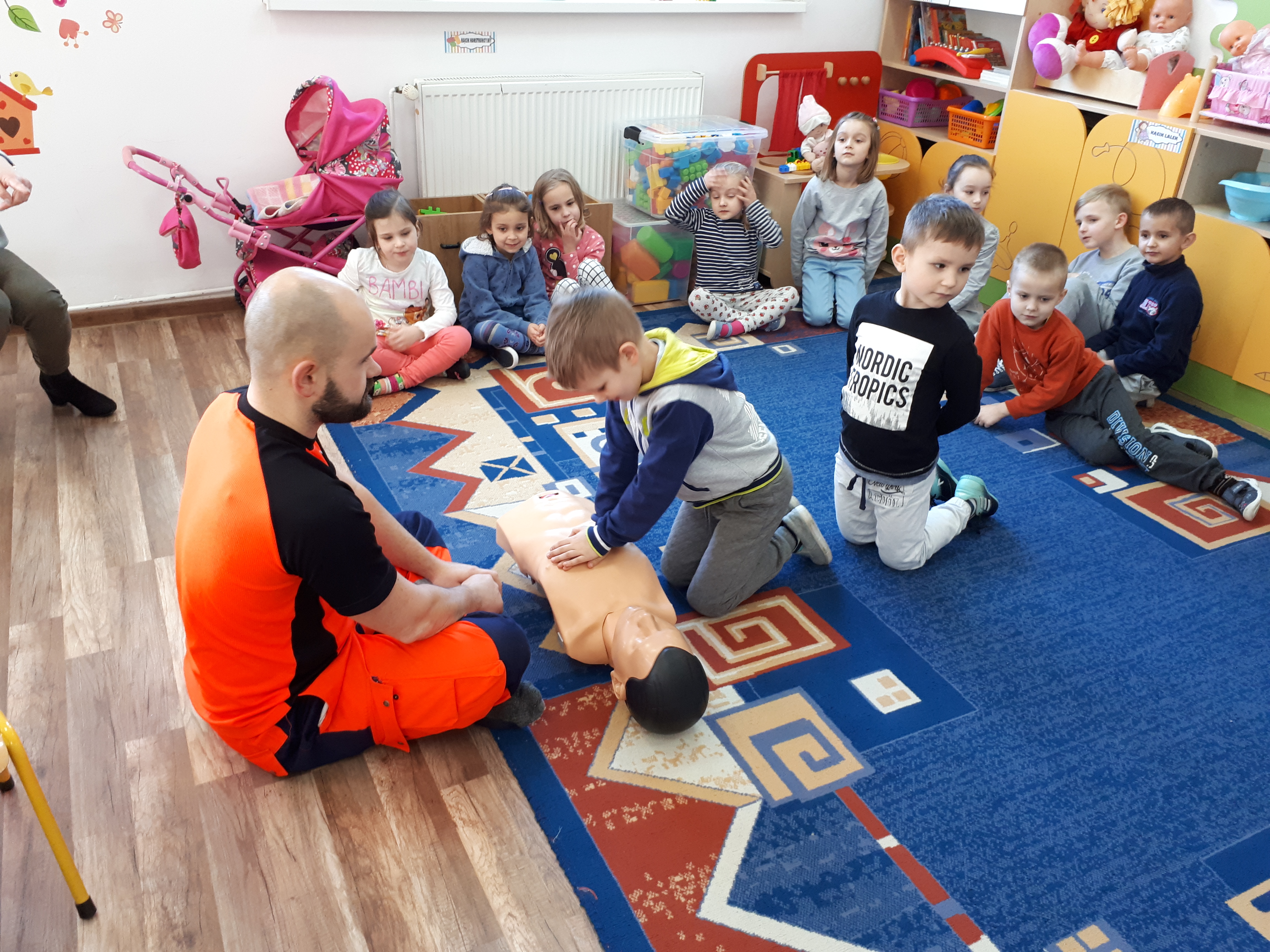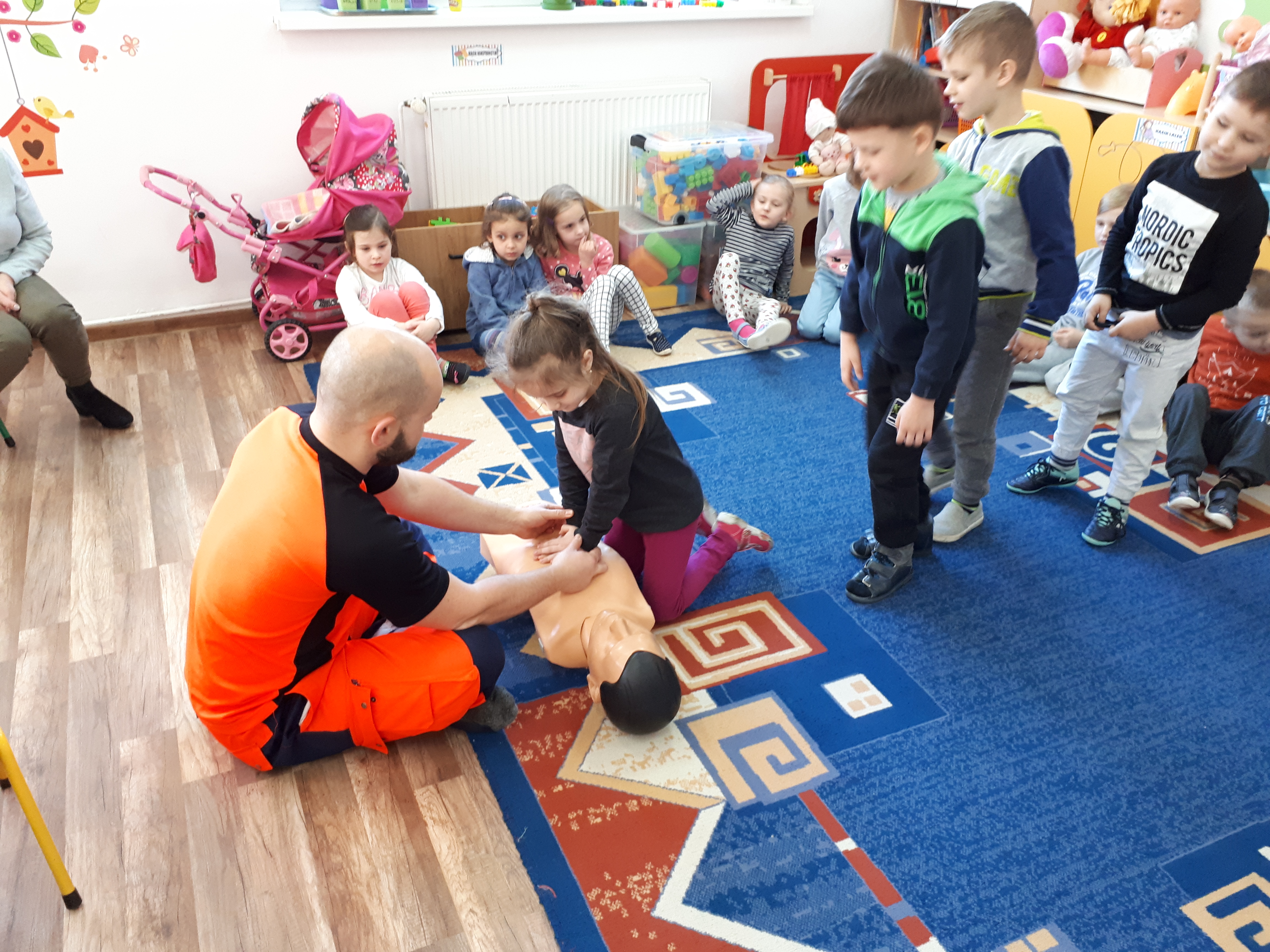 W obecności wykwalifikowanego ratownika medycznego dzieci poznały sposoby zachowania się w sytuacji zagrożenia życia. Po utrwaleniu numerów alarmowych przedszkolaki ćwiczyły, w jaki sposób należy prawidłowo wezwać karetkę pogotowia- dowiedziały się, jakich informacji należy udzielić podczas rozmowy telefonicznej. Duże wrażenie zrobił na nich fantom, na którym uczyły się podstaw resuscytacji krążeniowo – oddechowej.