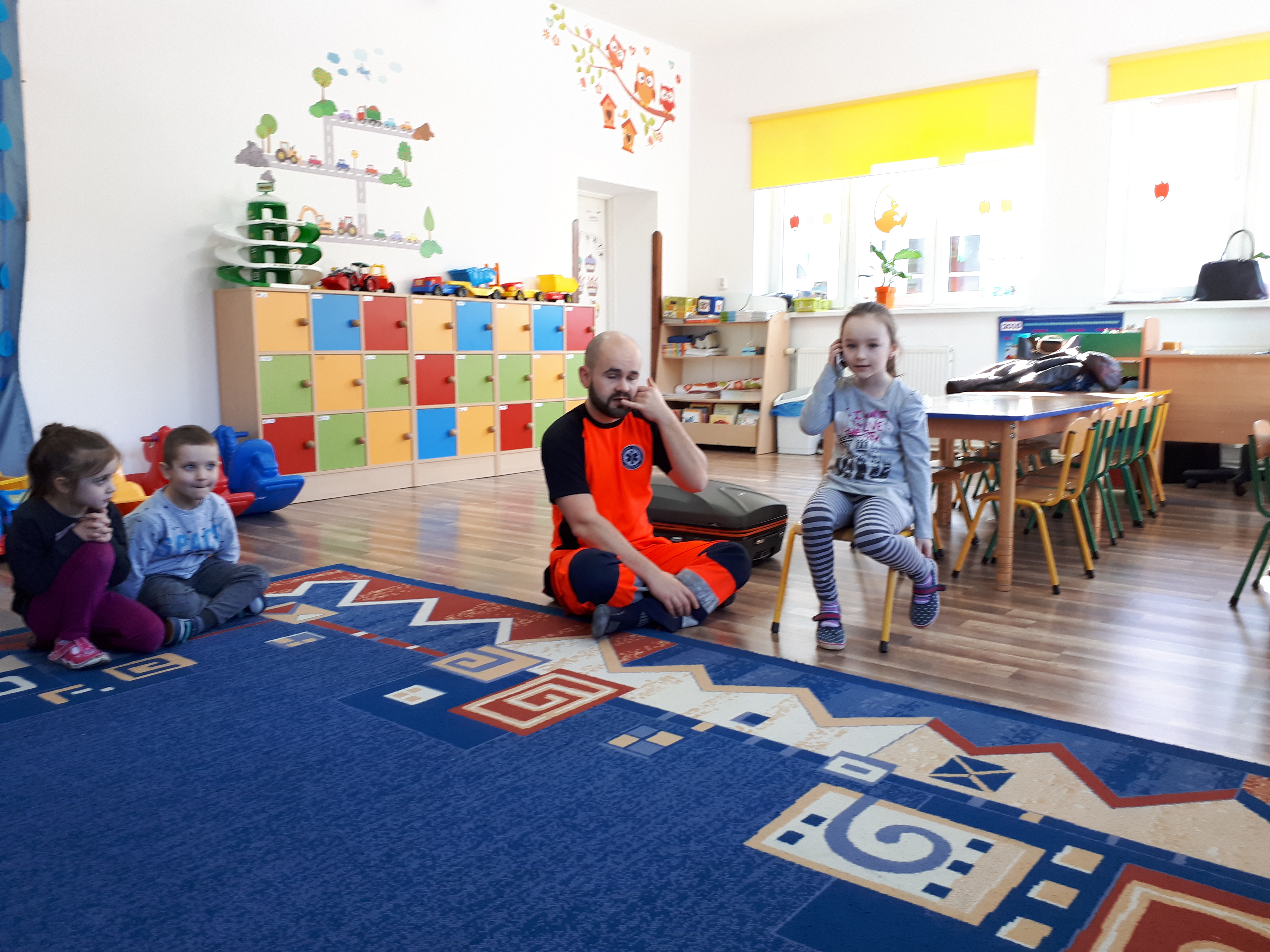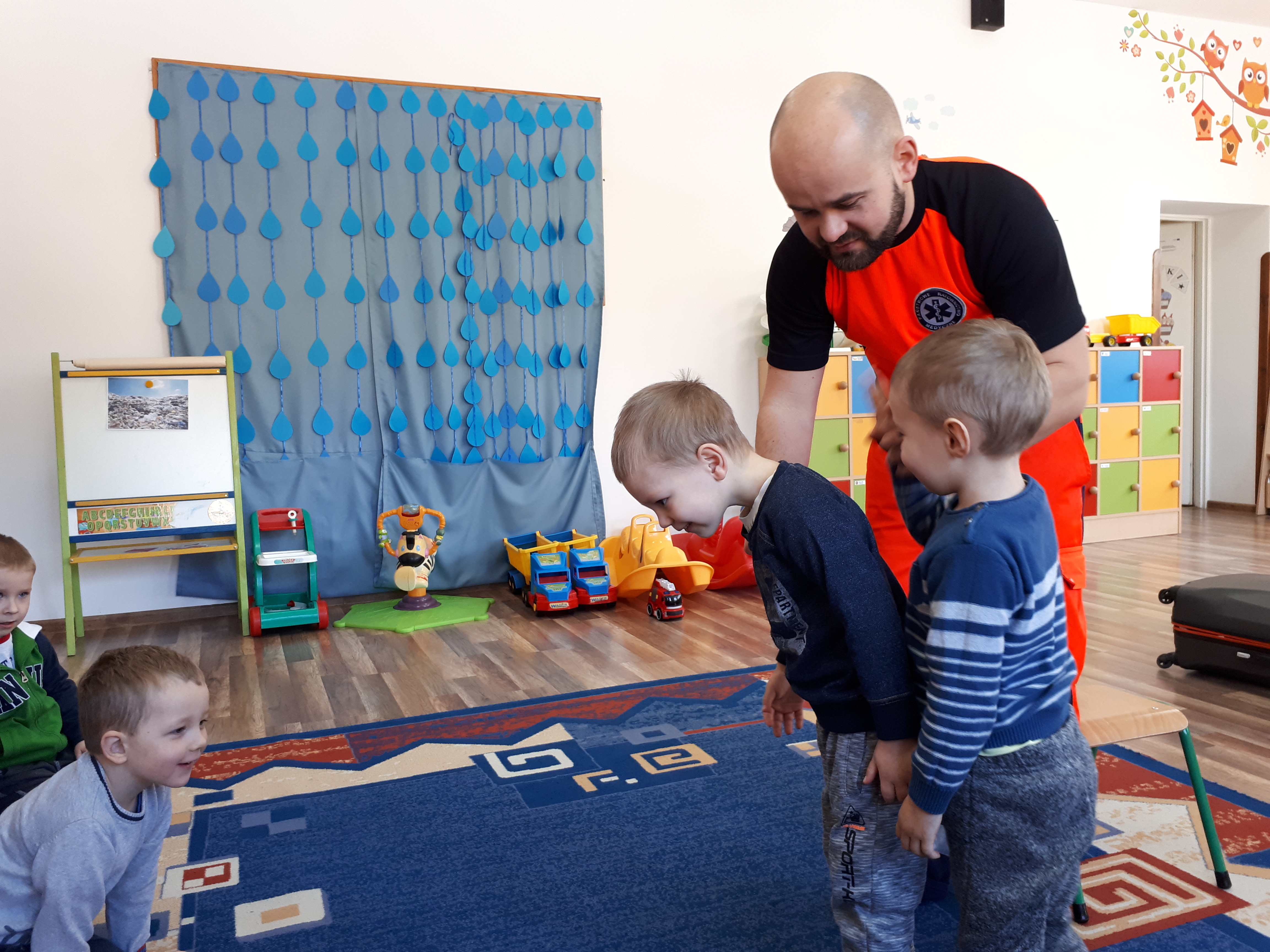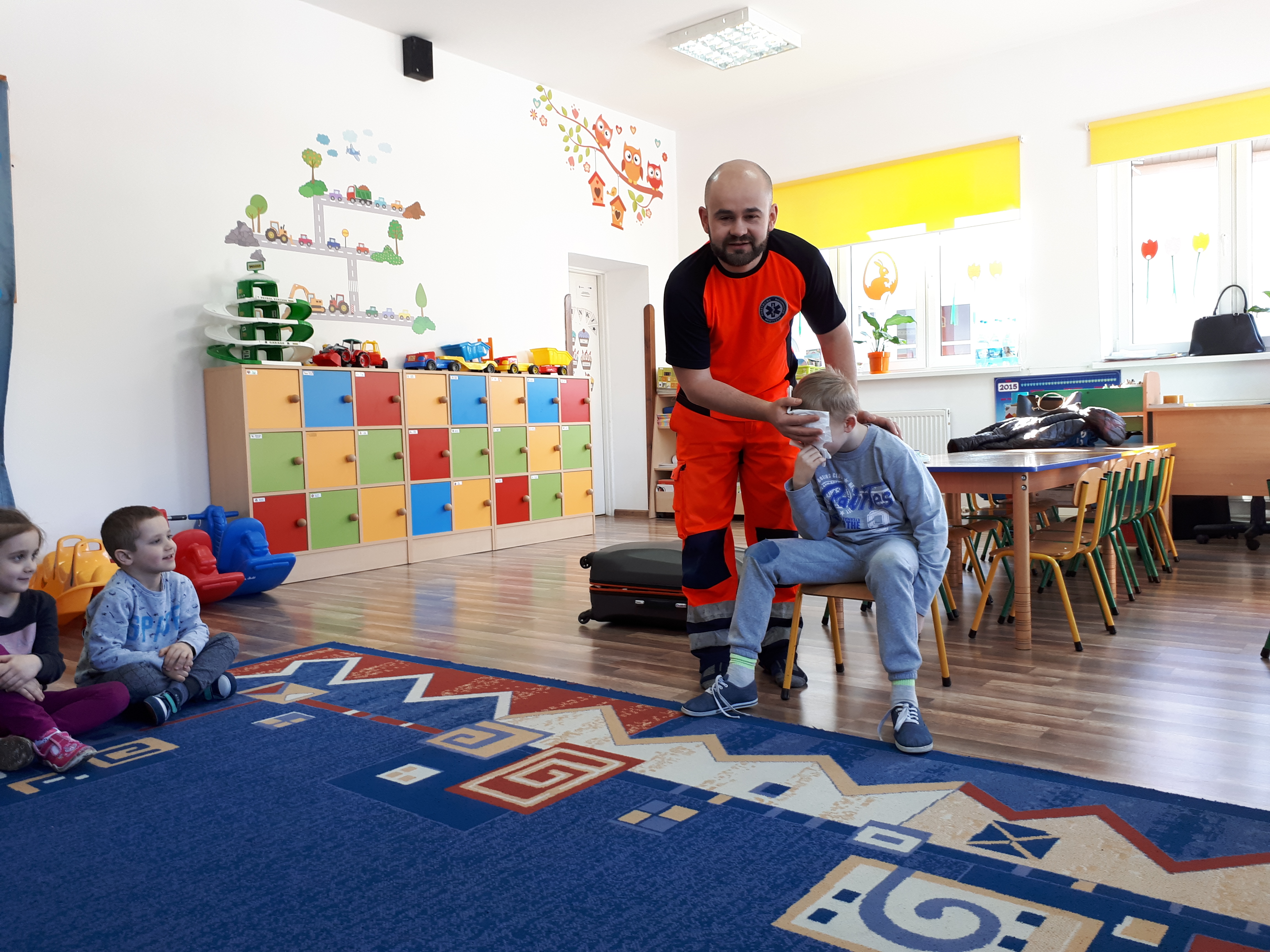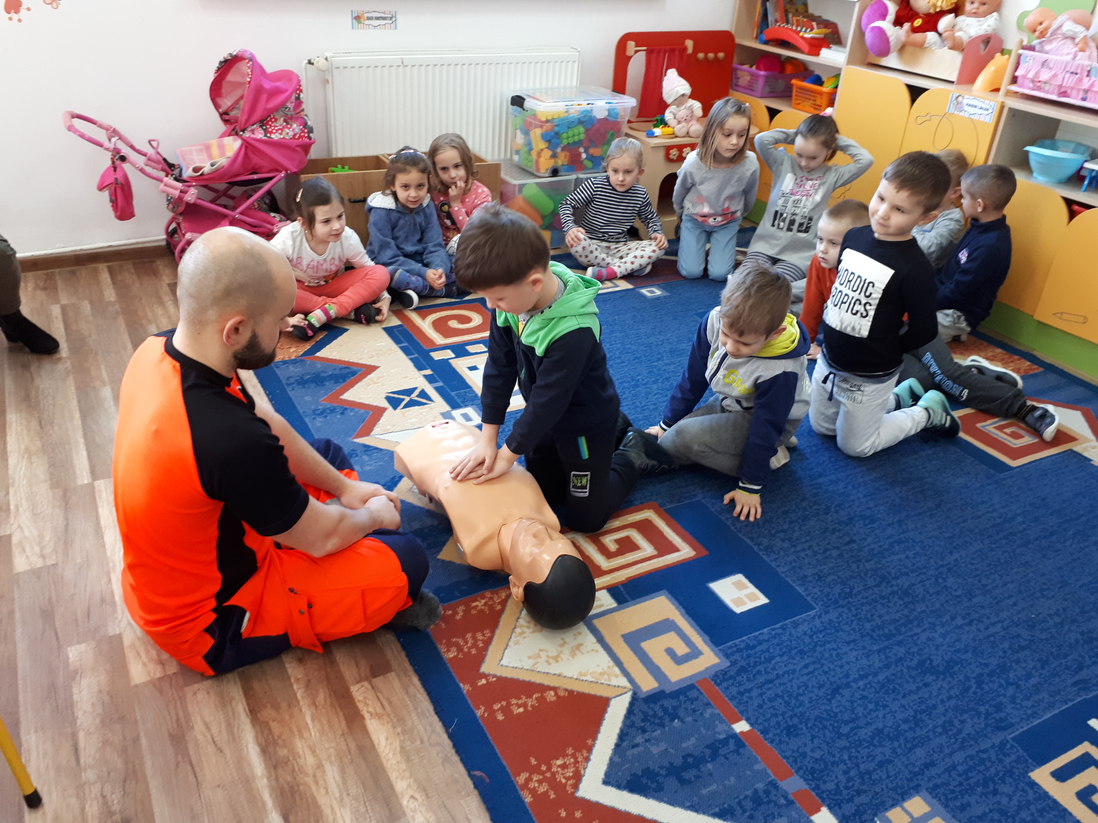 W obecności wykwalifikowanego ratownika medycznego dzieci poznały sposoby zachowania się w sytuacji zagrożenia życia. Po utrwaleniu numerów alarmowych przedszkolaki ćwiczyły, w jaki sposób należy prawidłowo wezwać karetkę pogotowia- dowiedziały się, jakich informacji należy udzielić podczas rozmowy telefonicznej. Duże wrażenie zrobił na nich fantom, na którym uczyły się podstaw resuscytacji krążeniowo – oddechowej.