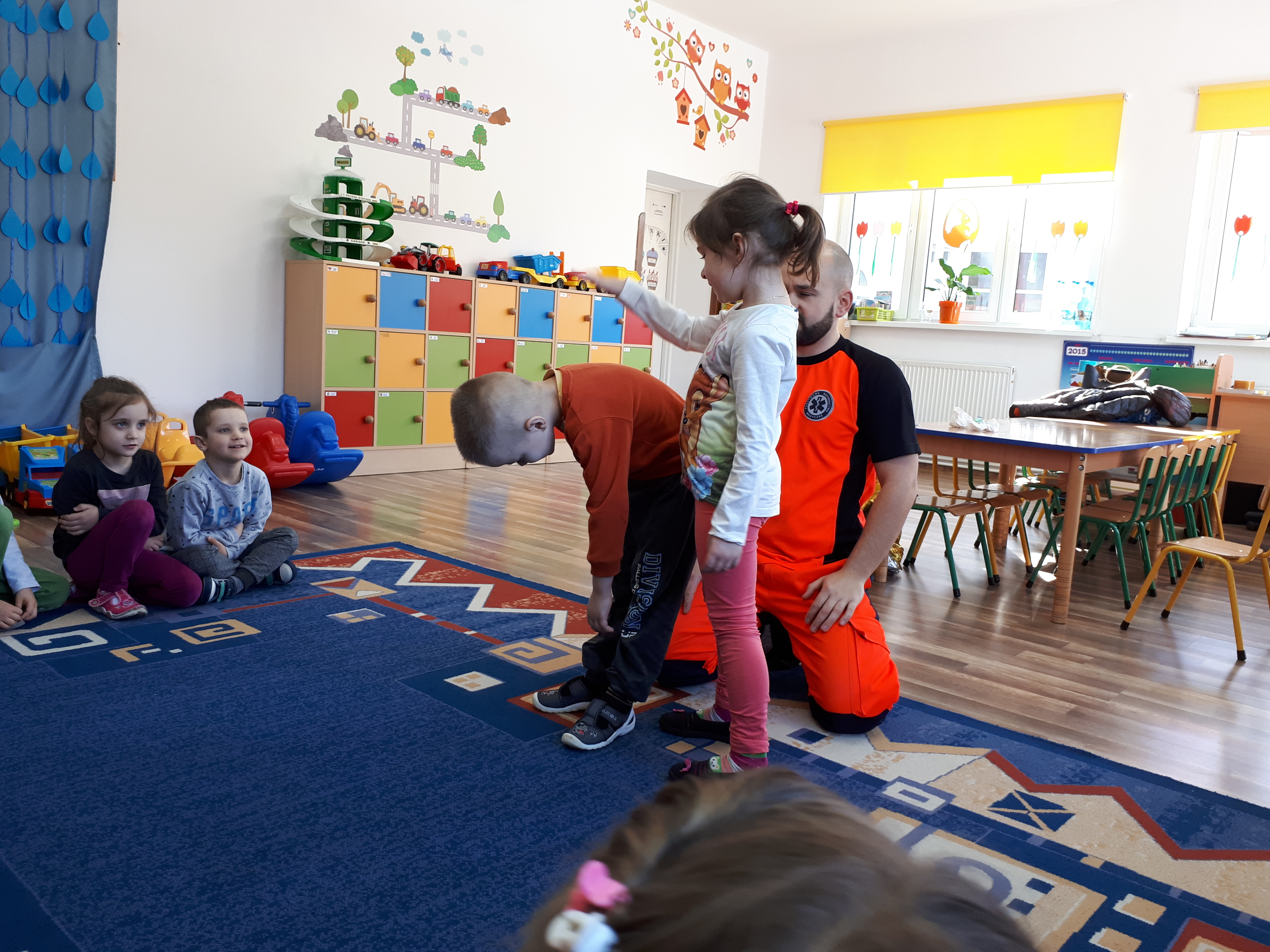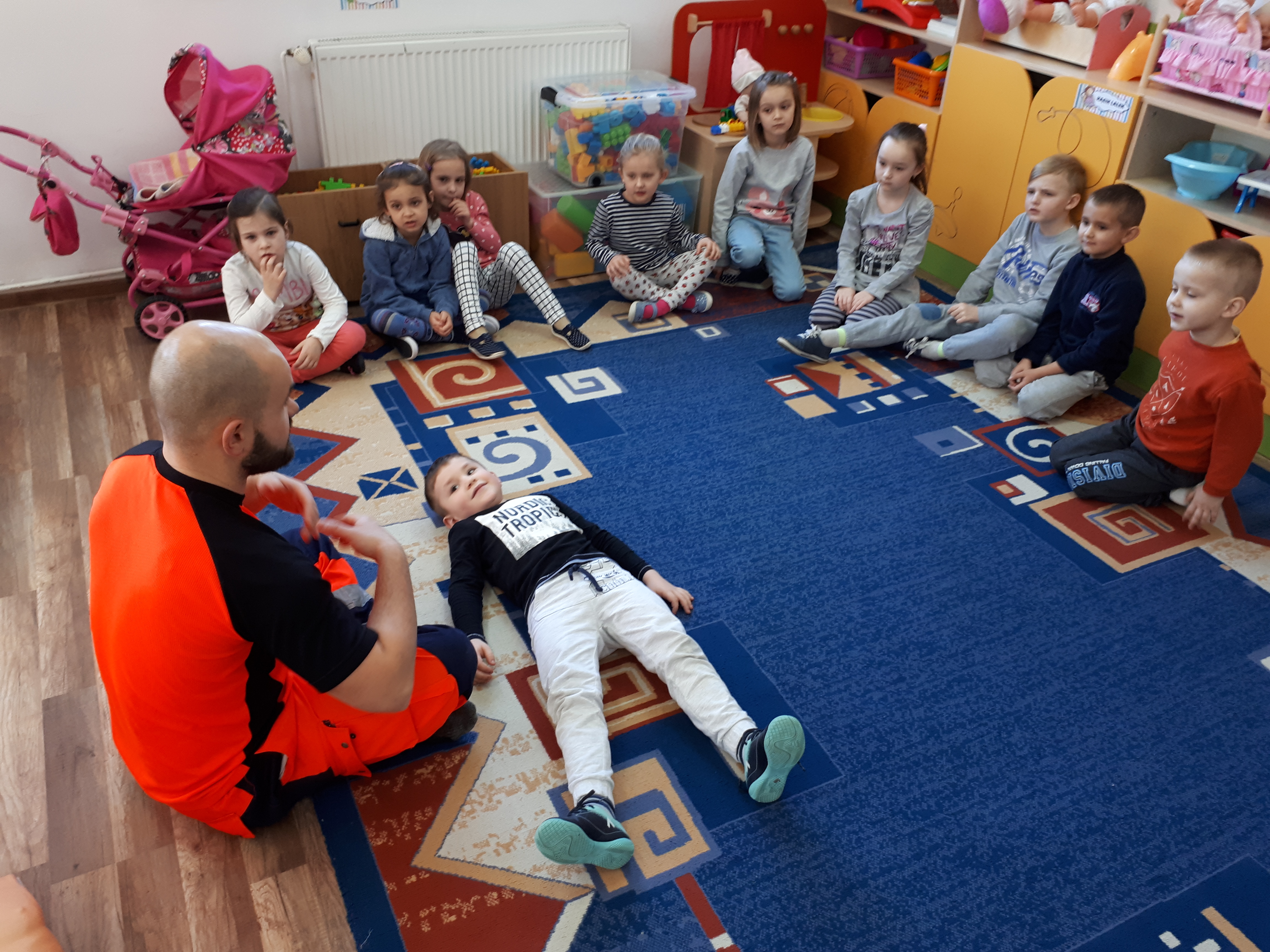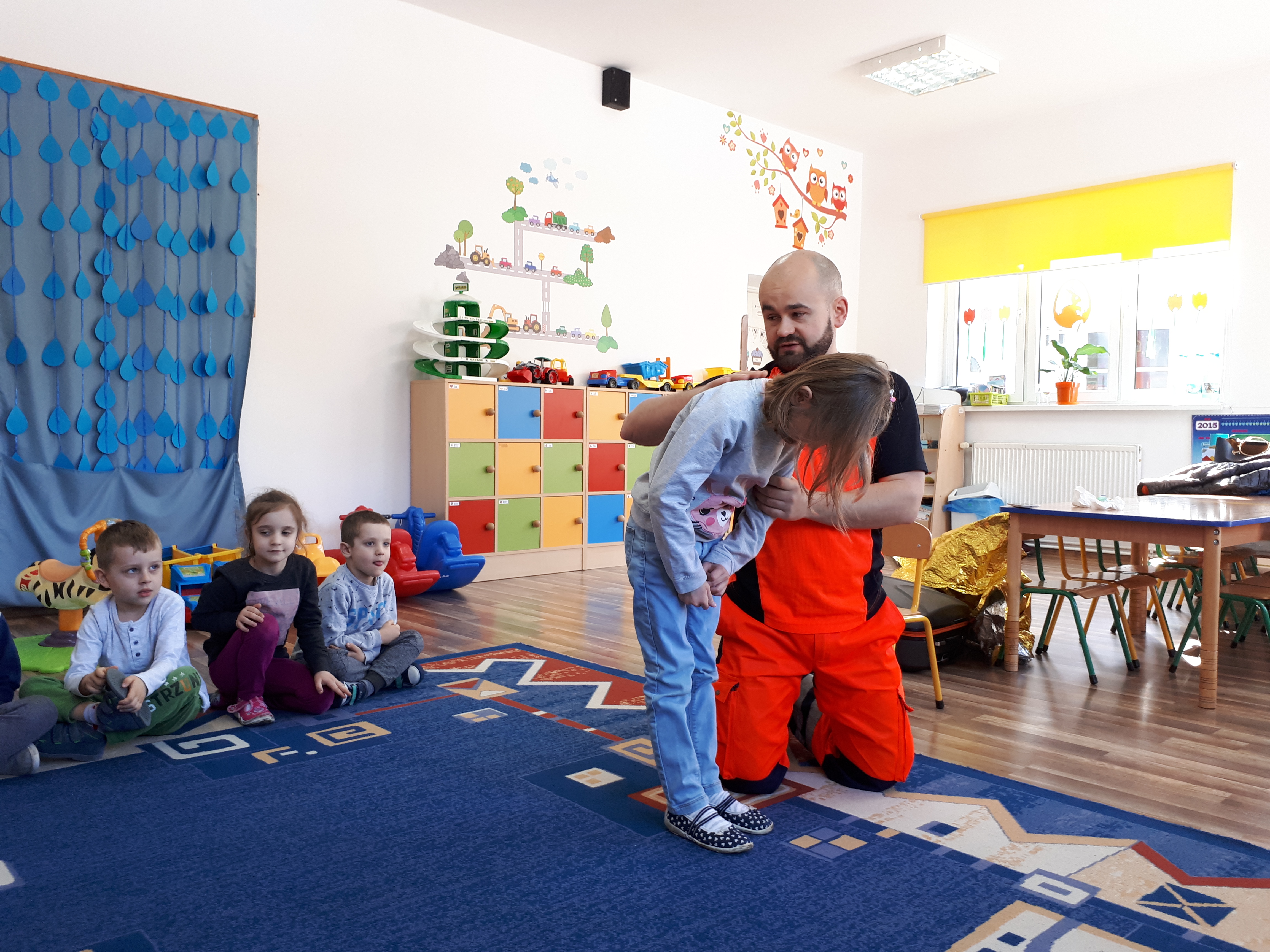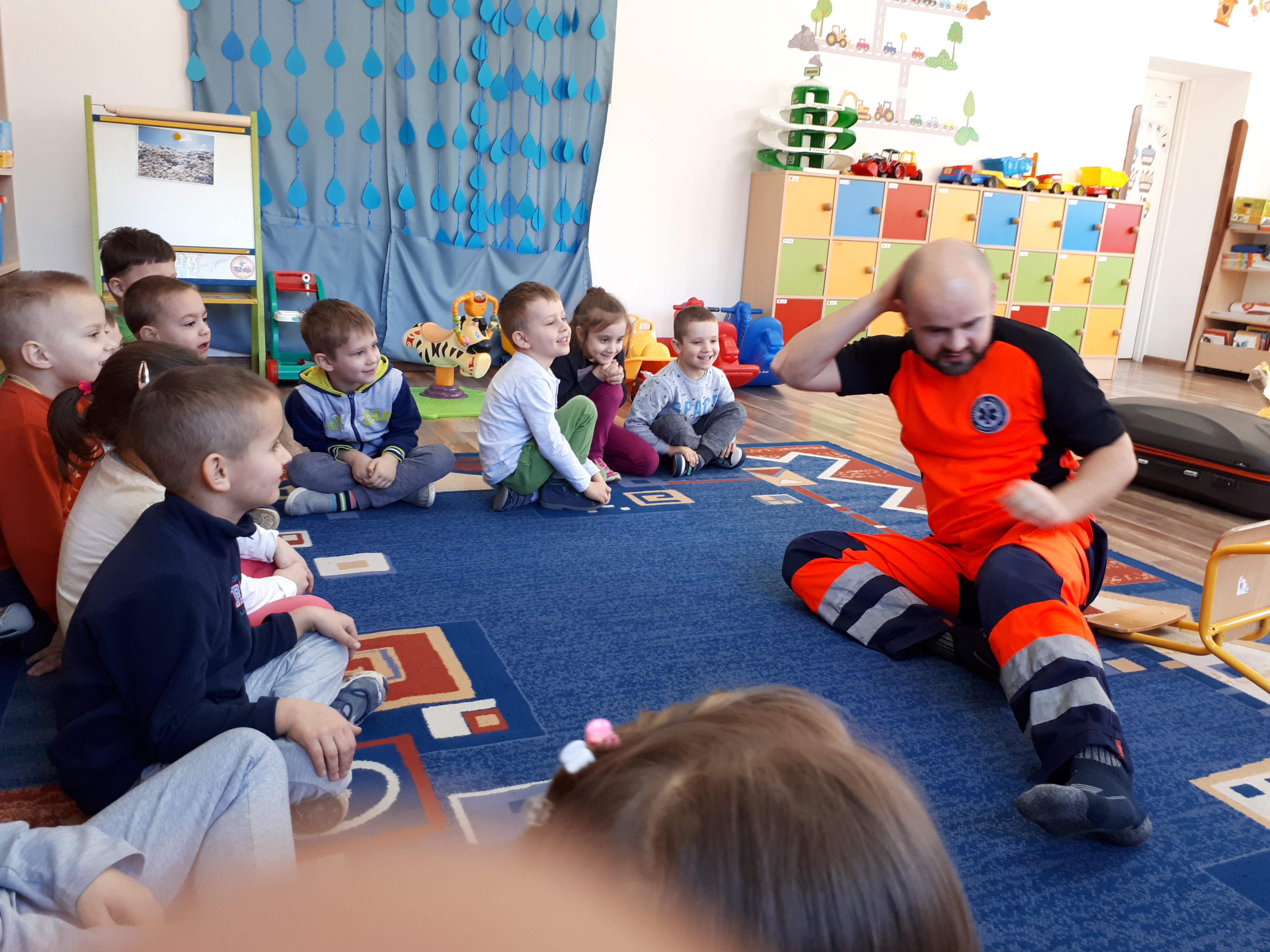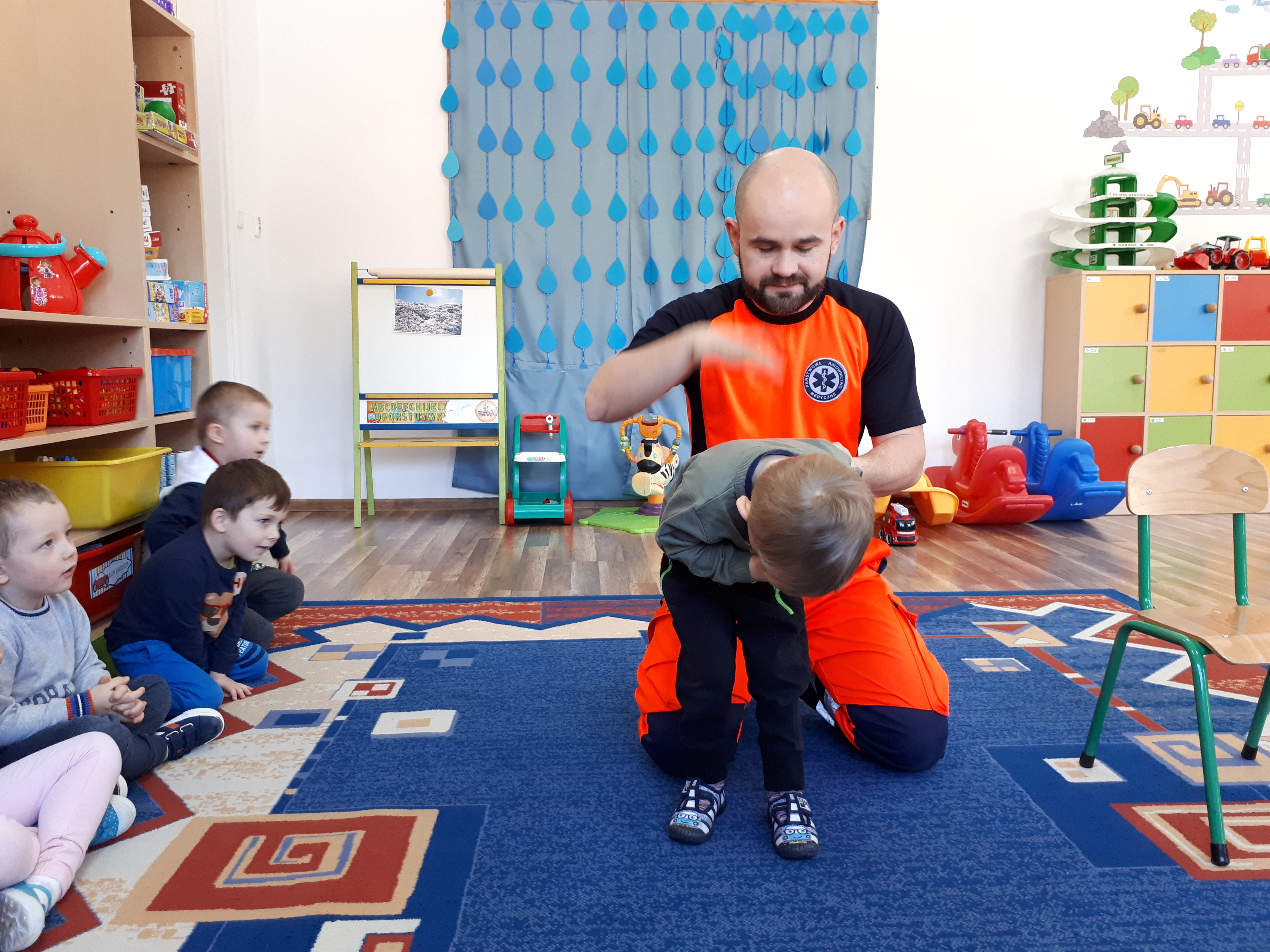 W obecności wykwalifikowanego ratownika medycznego dzieci poznały sposoby zachowania się w sytuacji zagrożenia życia. Po utrwaleniu numerów alarmowych przedszkolaki ćwiczyły, w jaki sposób należy prawidłowo wezwać karetkę pogotowia- dowiedziały się, jakich informacji należy udzielić podczas rozmowy telefonicznej. Duże wrażenie zrobił na nich fantom, na którym uczyły się podstaw resuscytacji krążeniowo – oddechowej.
