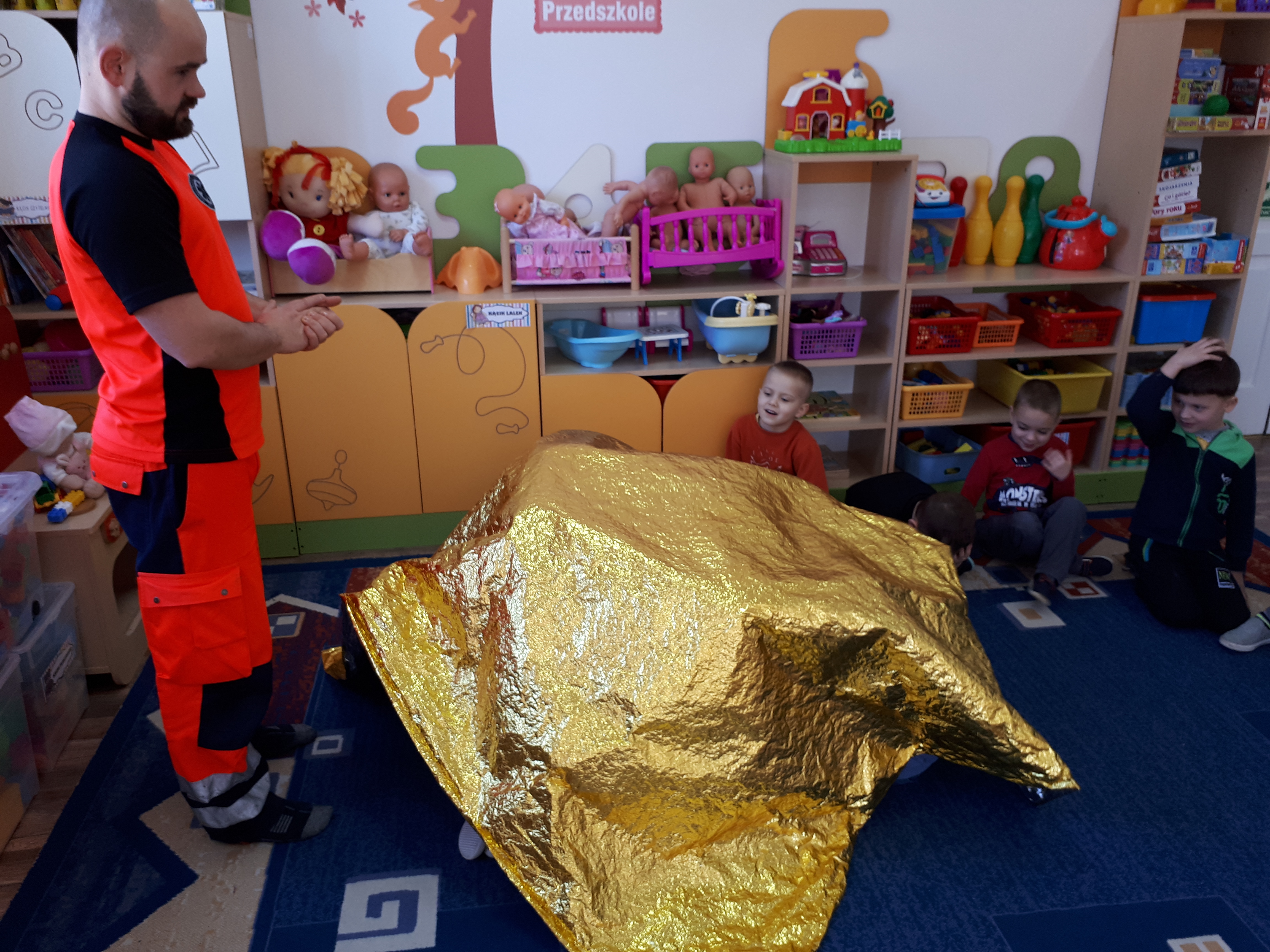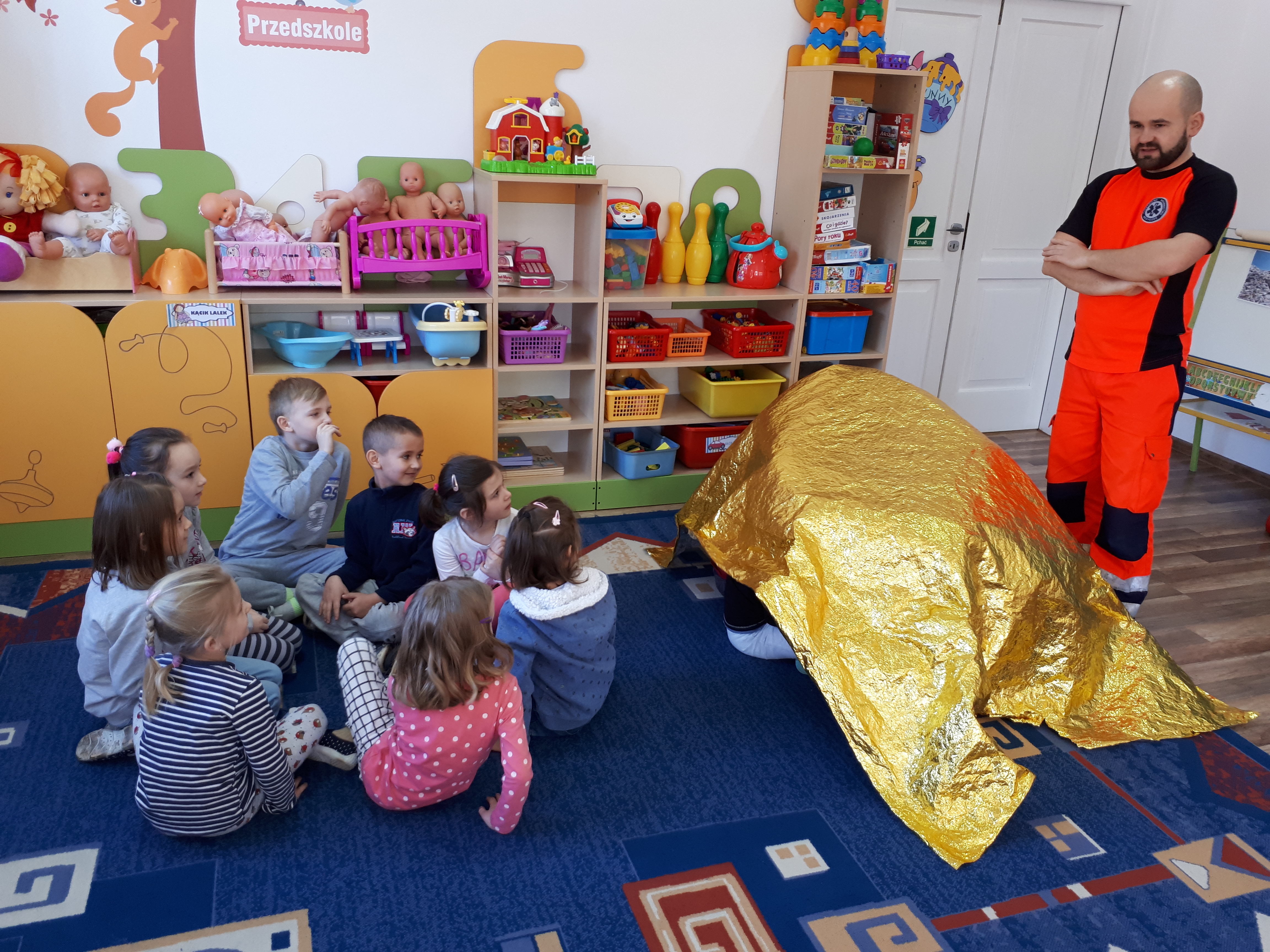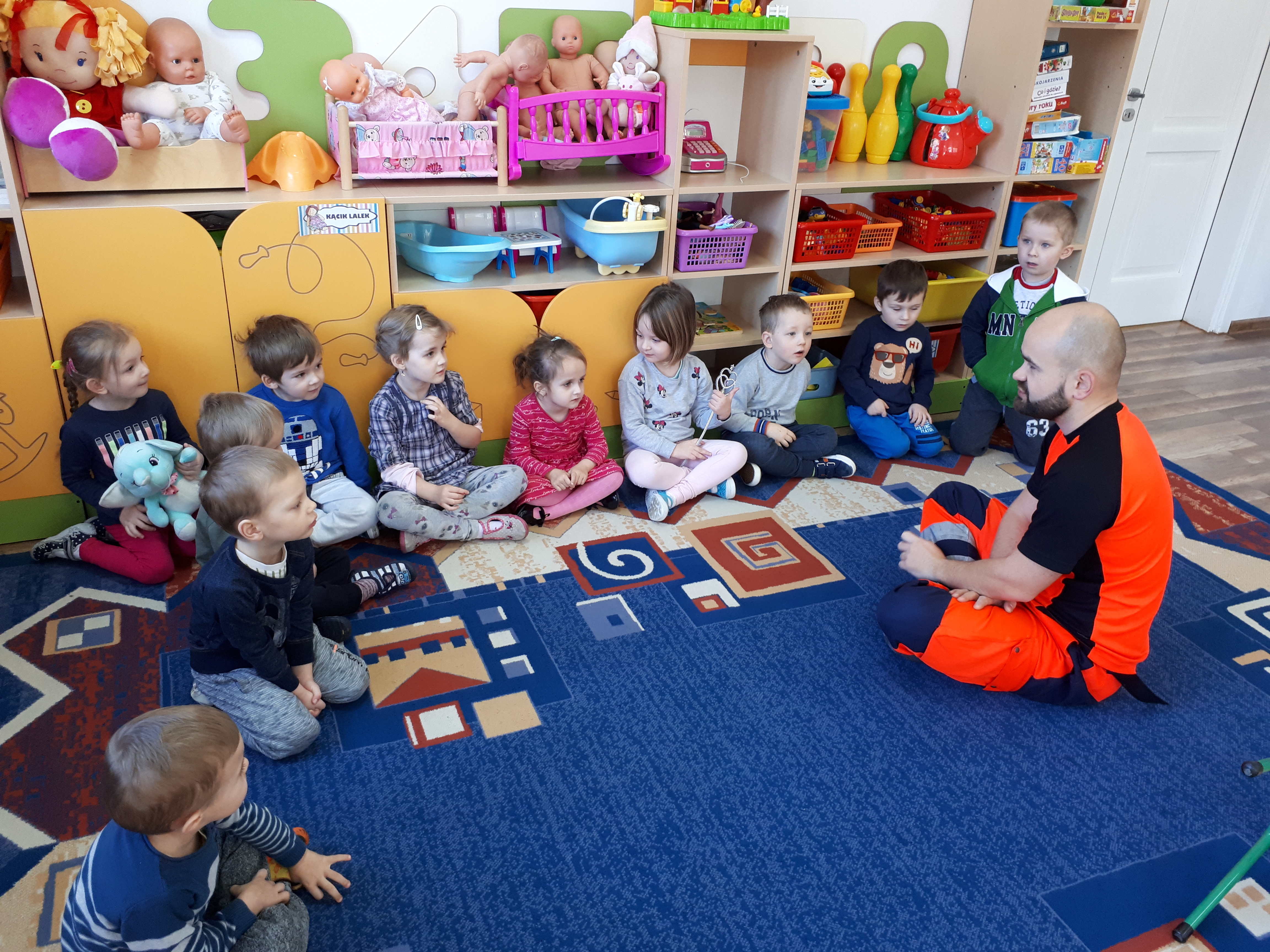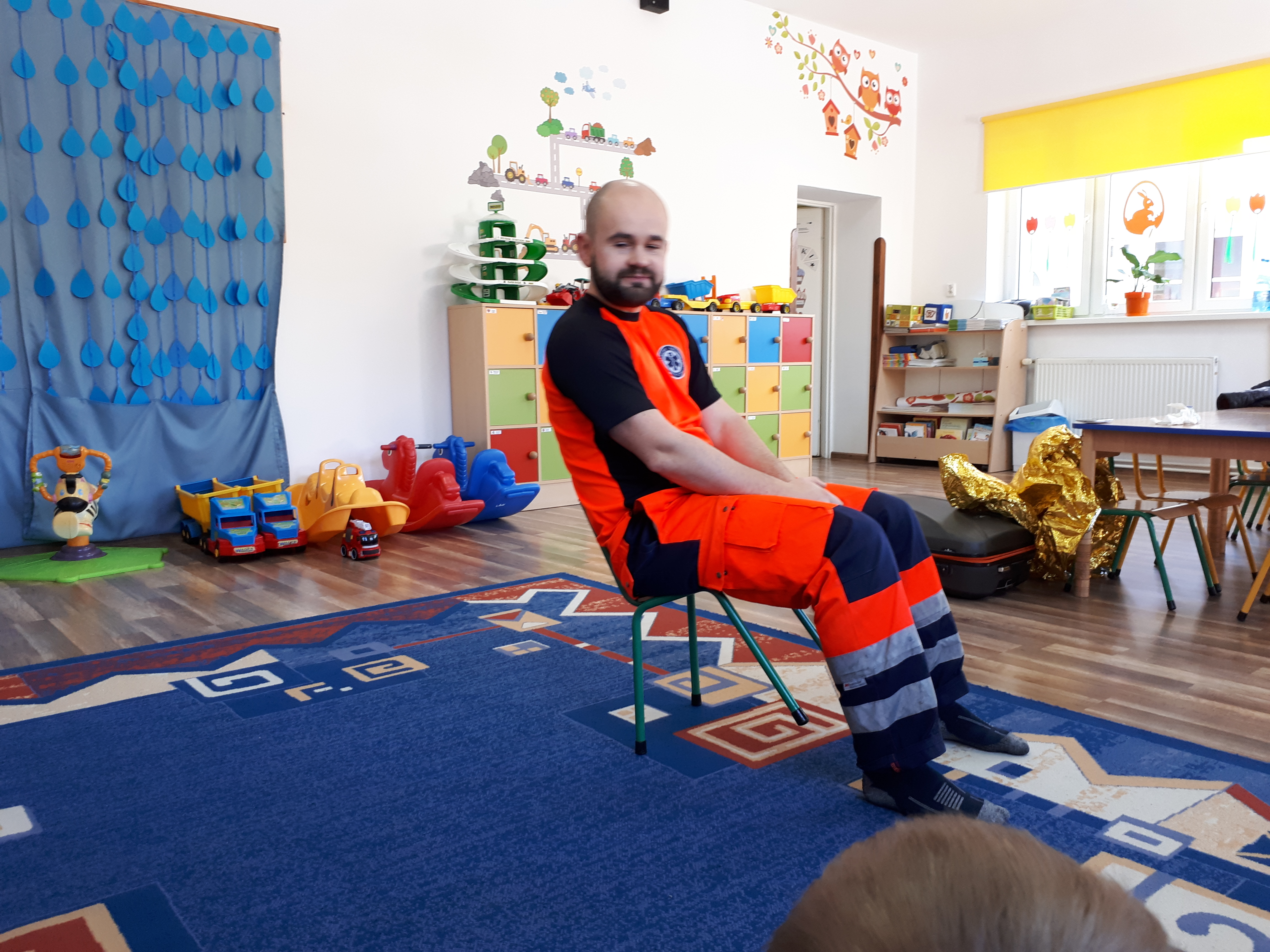 W obecności wykwalifikowanego ratownika medycznego dzieci poznały sposoby zachowania się w sytuacji zagrożenia życia. Po utrwaleniu numerów alarmowych przedszkolaki ćwiczyły, w jaki sposób należy prawidłowo wezwać karetkę pogotowia- dowiedziały się, jakich informacji należy udzielić podczas rozmowy telefonicznej. Duże wrażenie zrobił na nich fantom, na którym uczyły się podstaw resuscytacji krążeniowo – oddechowej.