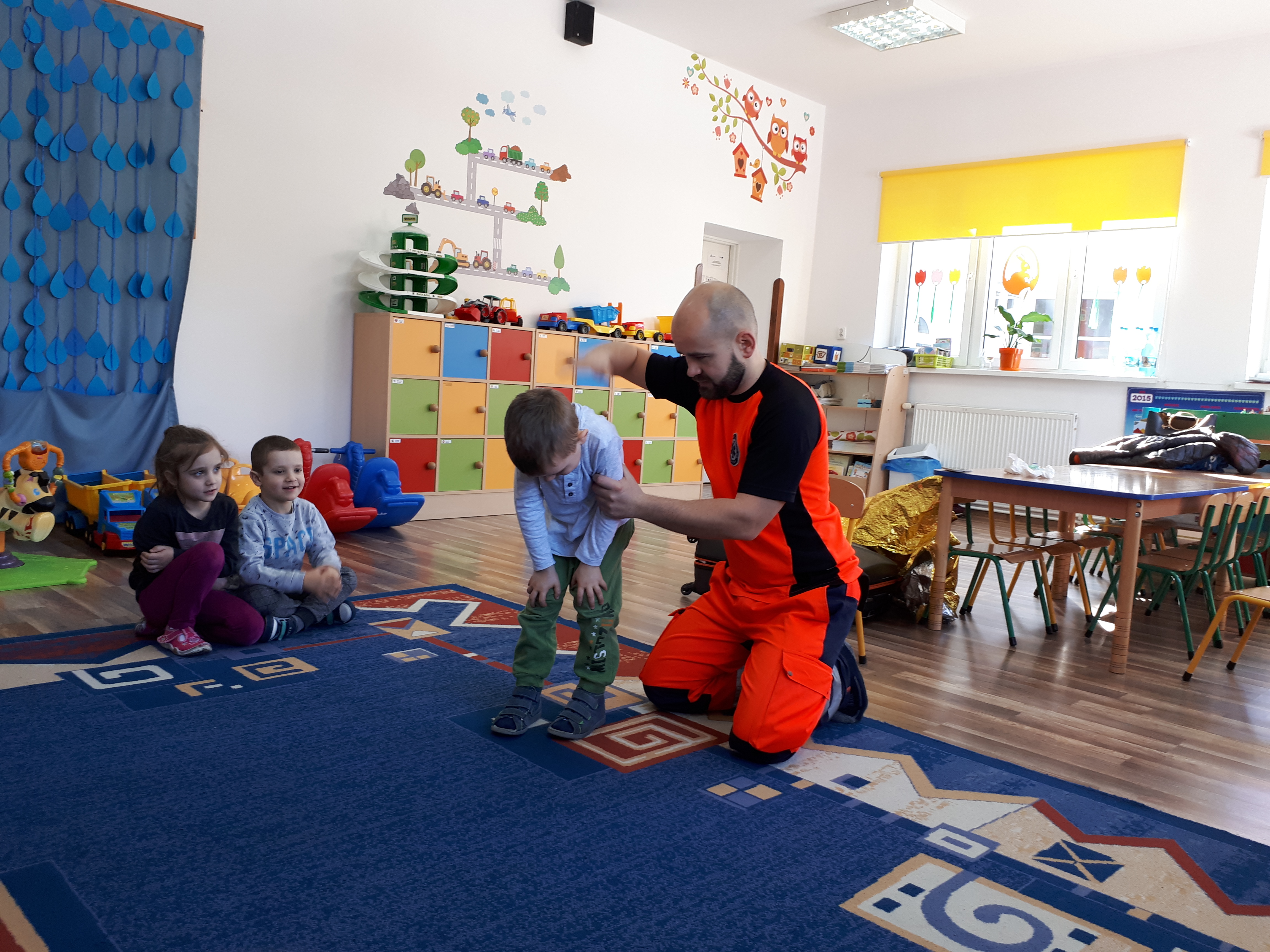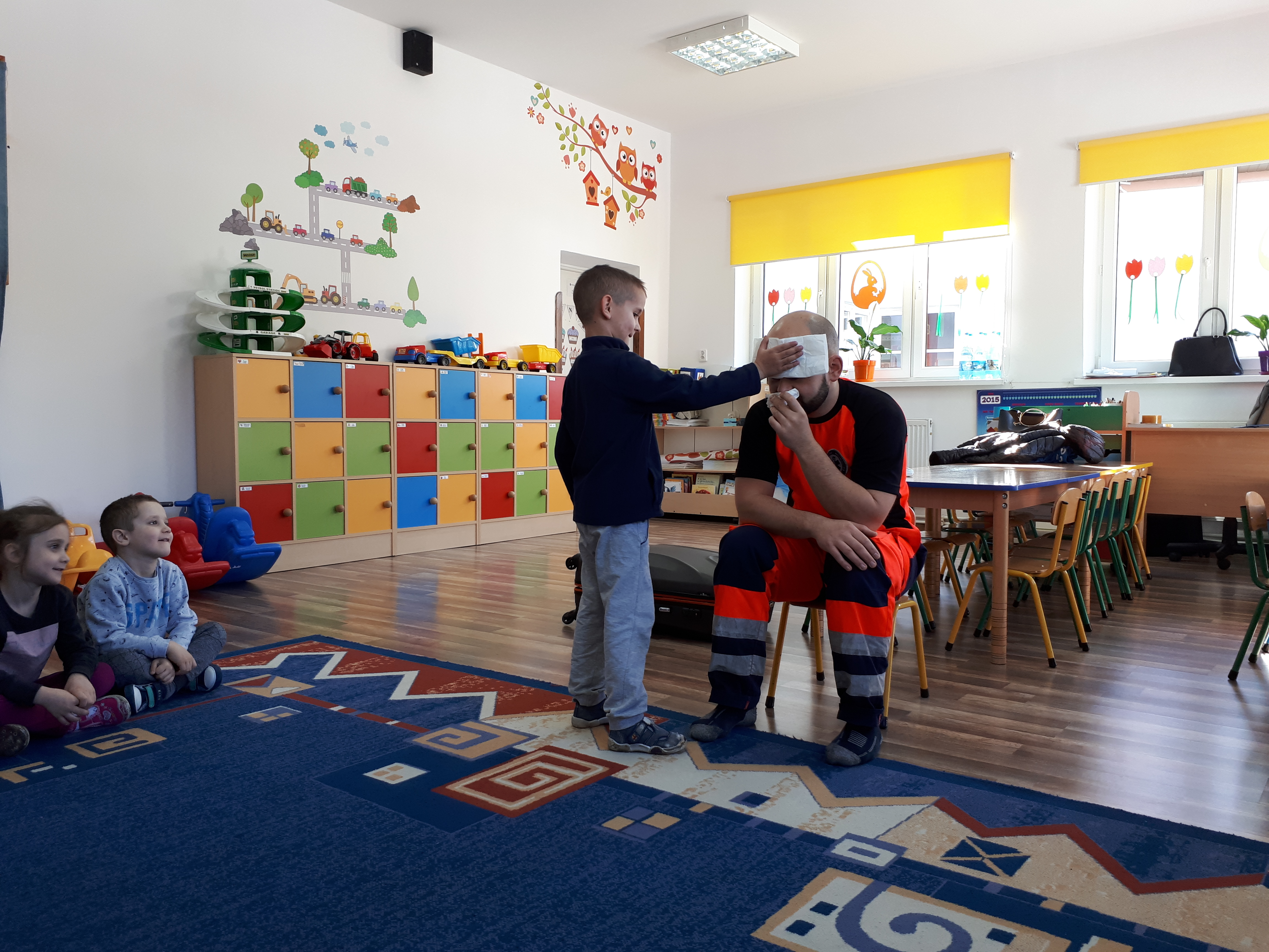 Ponadto instruktor zaprezentował dzieciom czynności ratownicze niezbędne w przypadku krwotoku z nosa oraz zakrztuszenia się. Pan ratownik przestrzegał również przed konsekwencjami niebezpiecznych zabaw takich jak: próby wykonywania masażu serca na kolegach, huśtanie się na krześle, popychanie się, które mogą być bardzo groźne.