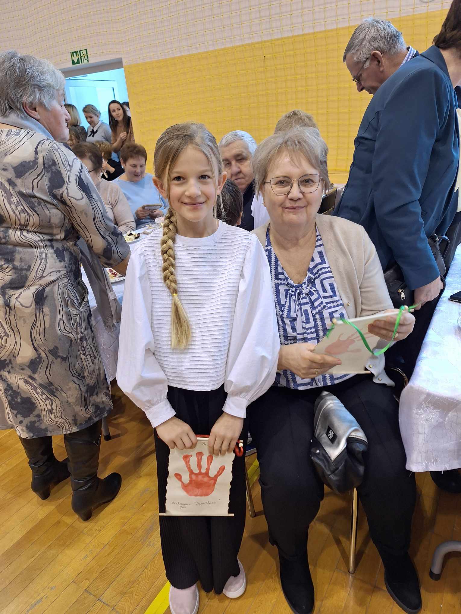Podczas uroczystości wnuki obdarowały swoje babcie i dziadków własnoręcznie wykonanymi upominkami, a cała sala wypełniła się radością i wzruszeniem.