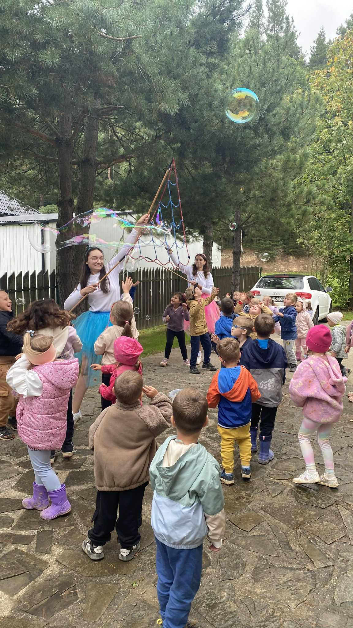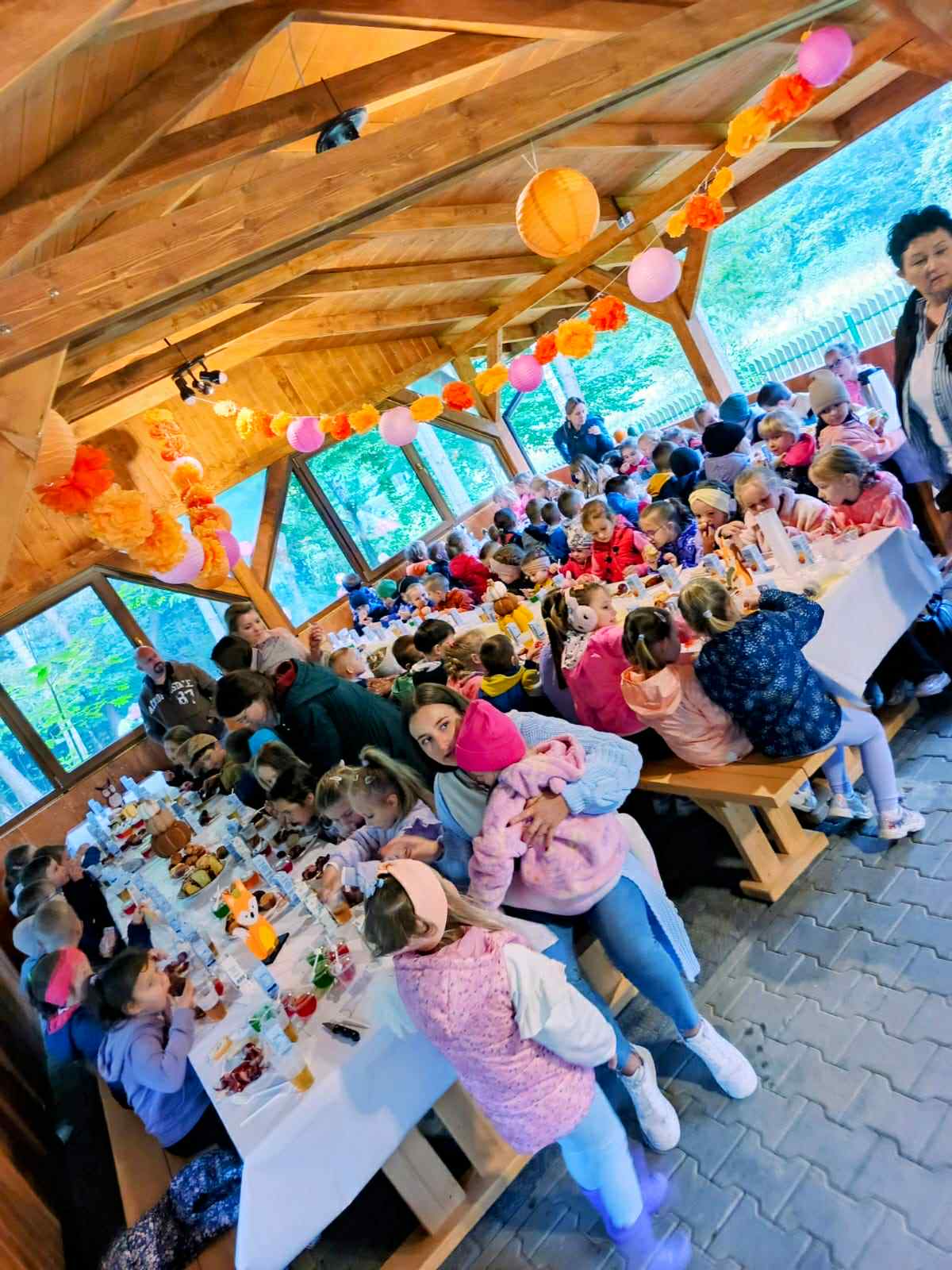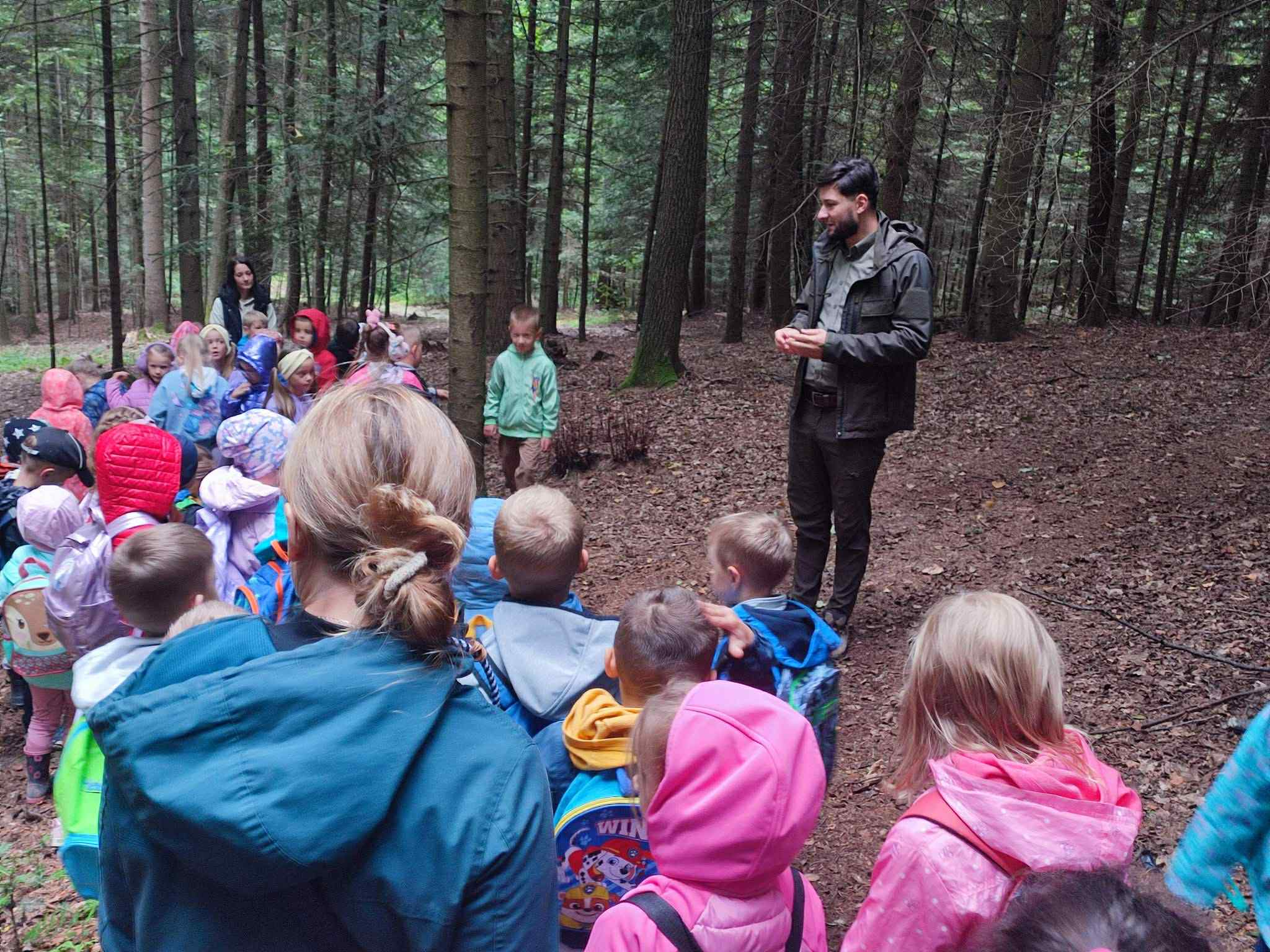 Grupy sześciolatków wraz z opiekunkami zostały najpierw dowiezione autobusem w okolice cmentarza wojennego nr 303 w Rajbrocie. Tam na dzieci czekali leśnicy – Pan Marek Orynczak oraz Pan Tymoteusz Podwyszyński. Po powitaniu wszyscy udali się na pobliski cmentarz, na którym pochowano żołnierzy I wojny światowej. Dzieci złożyły wiązankę oraz znicze pod pomnikiem, a później zwiedziły cmentarz. Następnie dzieci udały się pieszo w kierunku Domku Myśliwskiego w Łąkcie Górnej. Po drodze przewodnicy zdradzili dzieciom wiele leśnych tajemnic. Przedszkolaki podziwiały jesienne barwy lasu, obserwowały różne gatunki drzew i grzybów. Było to wspaniałe przeżycie dla nich. Po przybyciu na miejsce Pani Dyrektor Joanna Dunikowska powitała dzieci, opiekunów oraz gości wręczając pamiątkowe upominki. Dzieci powitał, również Wójt - Wojciech Wrona oraz Prezes Koła Łowieckiego „Ryś” w Żegocinie – Adam Durbas. Następnie Pani Dyrektor zaprosiła wszystkich na poczęstunek przygotowany przez rodziców. Po nabraniu sił przedszkolaki świetnie się bawiły w obecności Pań animatorek. Na koniec dzieci miały okazję uczestniczyć w warsztatach przeprowadzonych przez Panią Barbarę Halek, Przewodniczącą Komisji Promocji Łowiectwa PZŁ KO Kraków – na temat zwierząt leśnych. Po zakończonym pikniku poszczególne grupy, pełne wrażeń z powrotem wsiadały do autobusu i odjeżdżały do swoich przedszkoli.